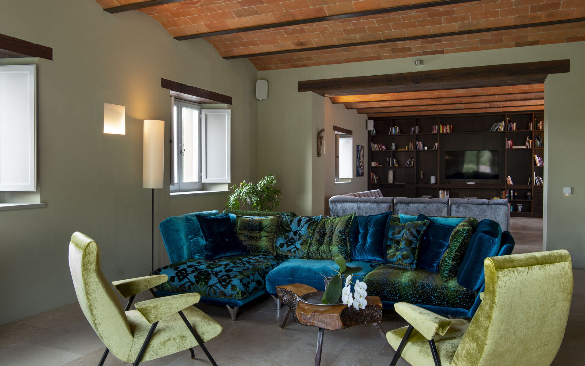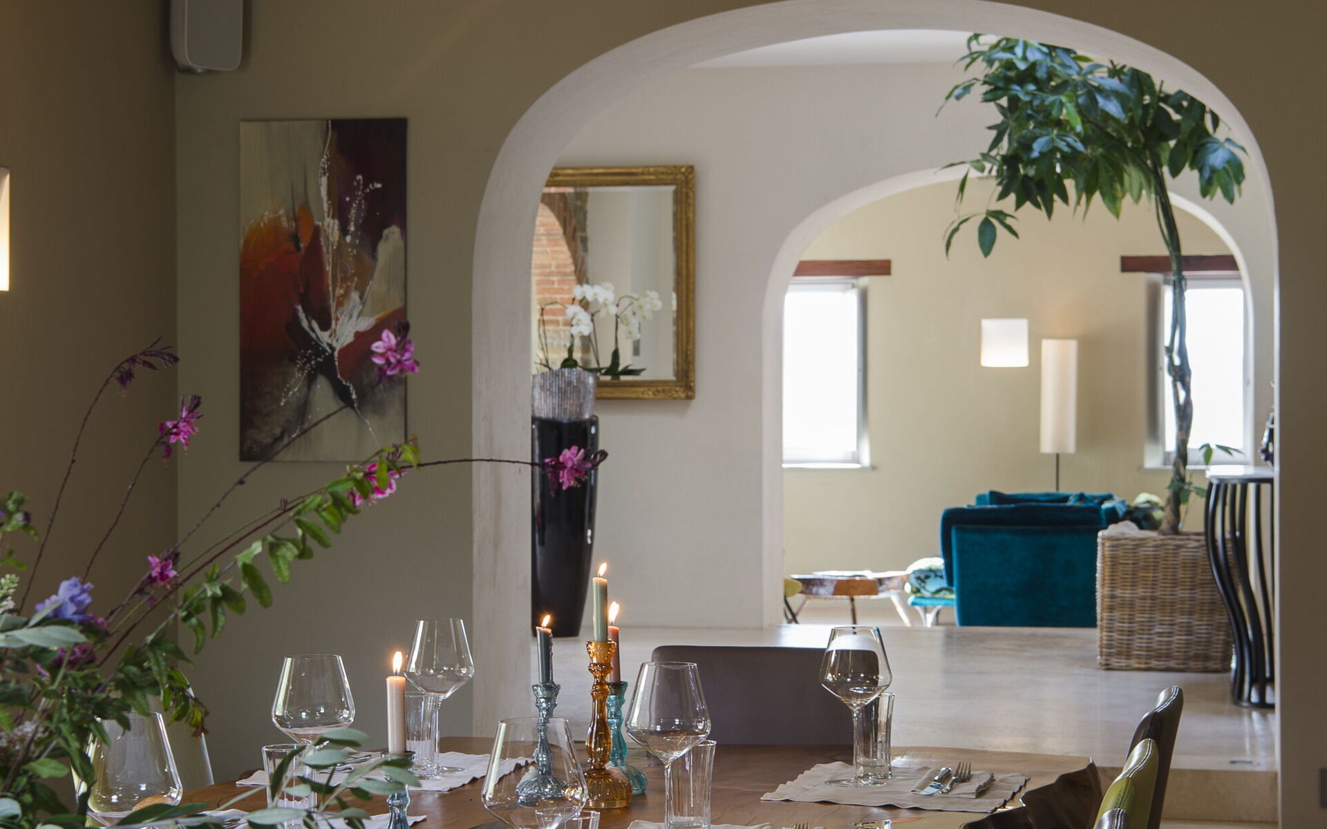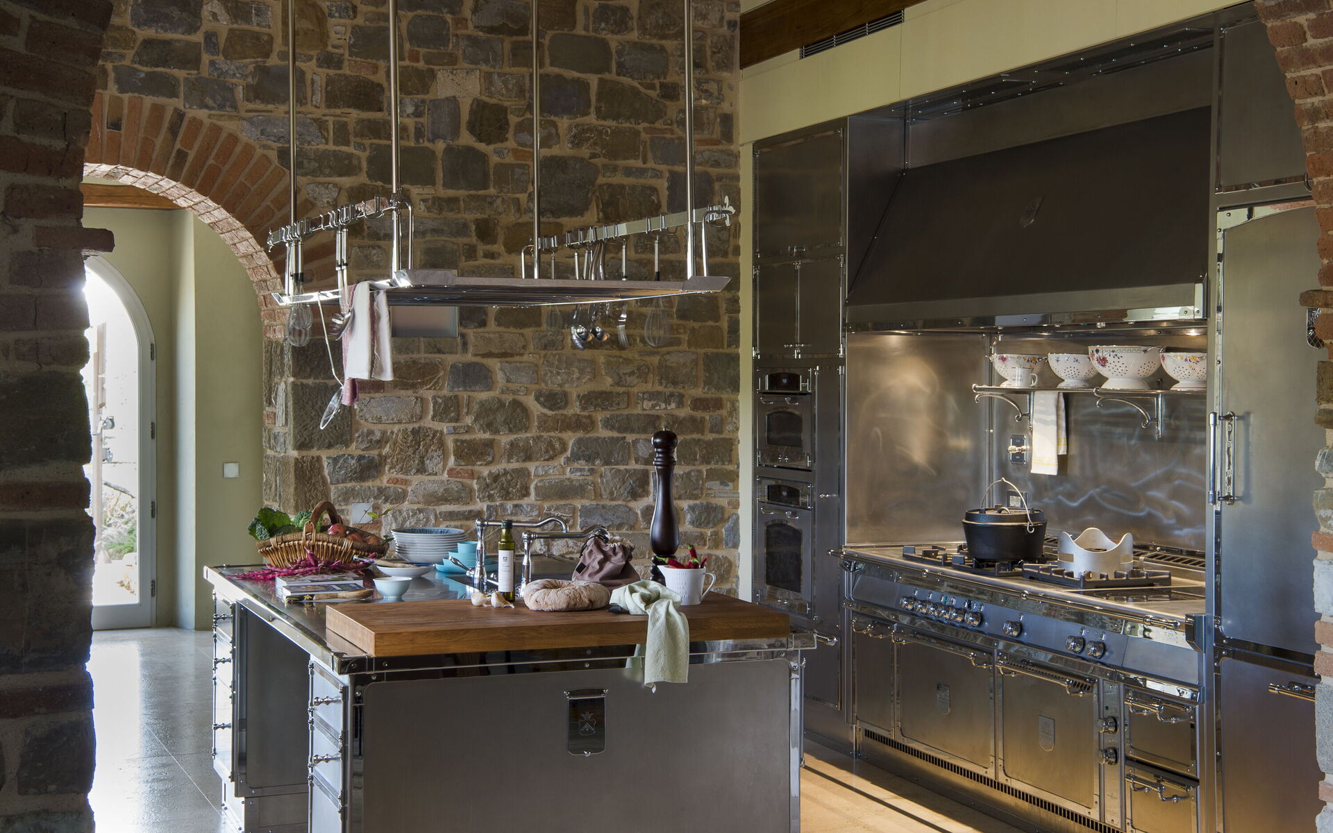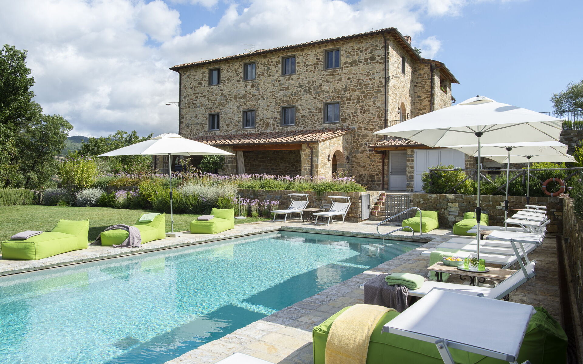 The interior of the villa offers the fascination of stone walls, “cotto” vaulted ceilings, wooden beams and the spaciousness typical of this kind of architecture. This is united to a fresh, modern, creative design in the furnishings. An eclectic mix of rustic and modern styles.