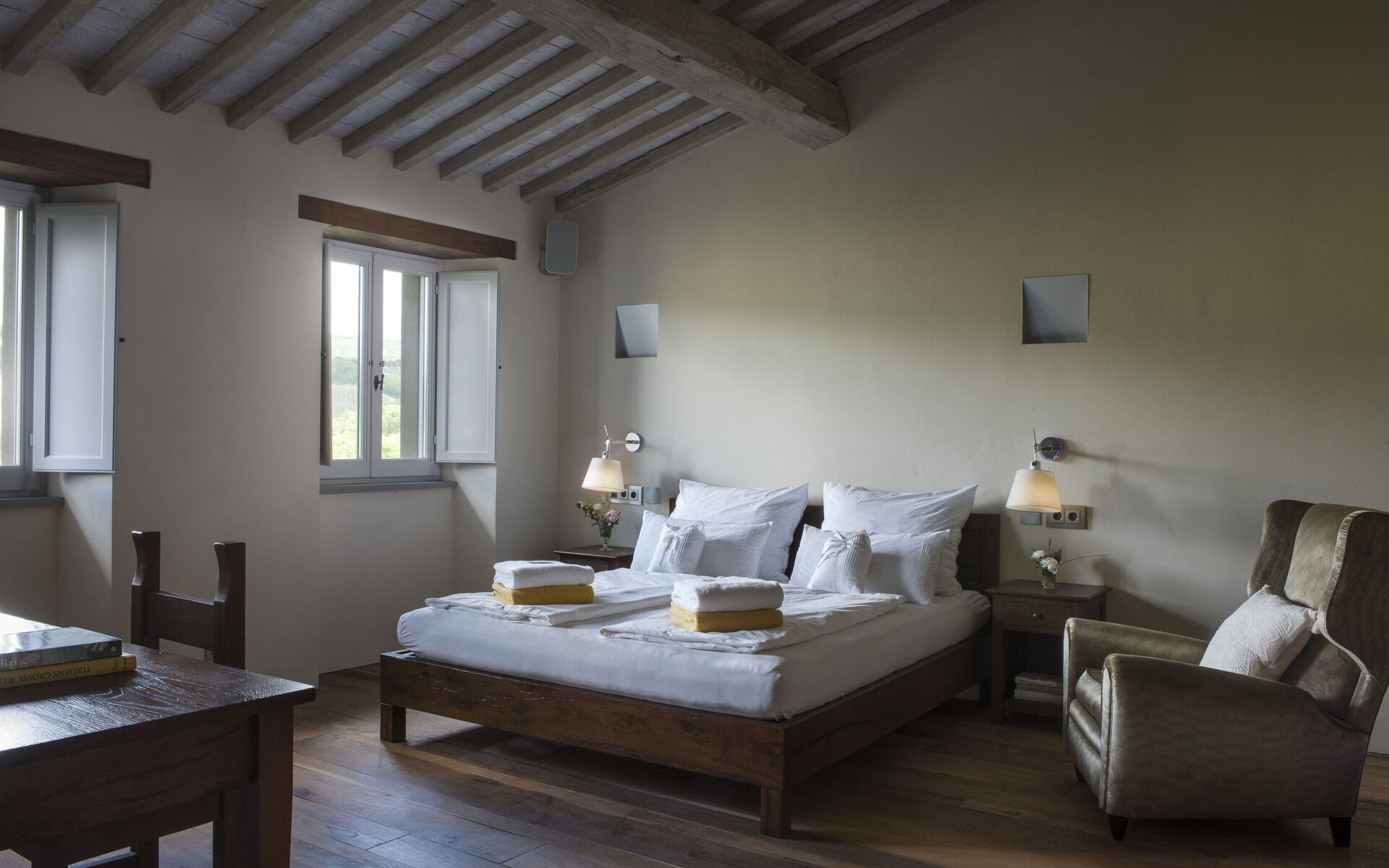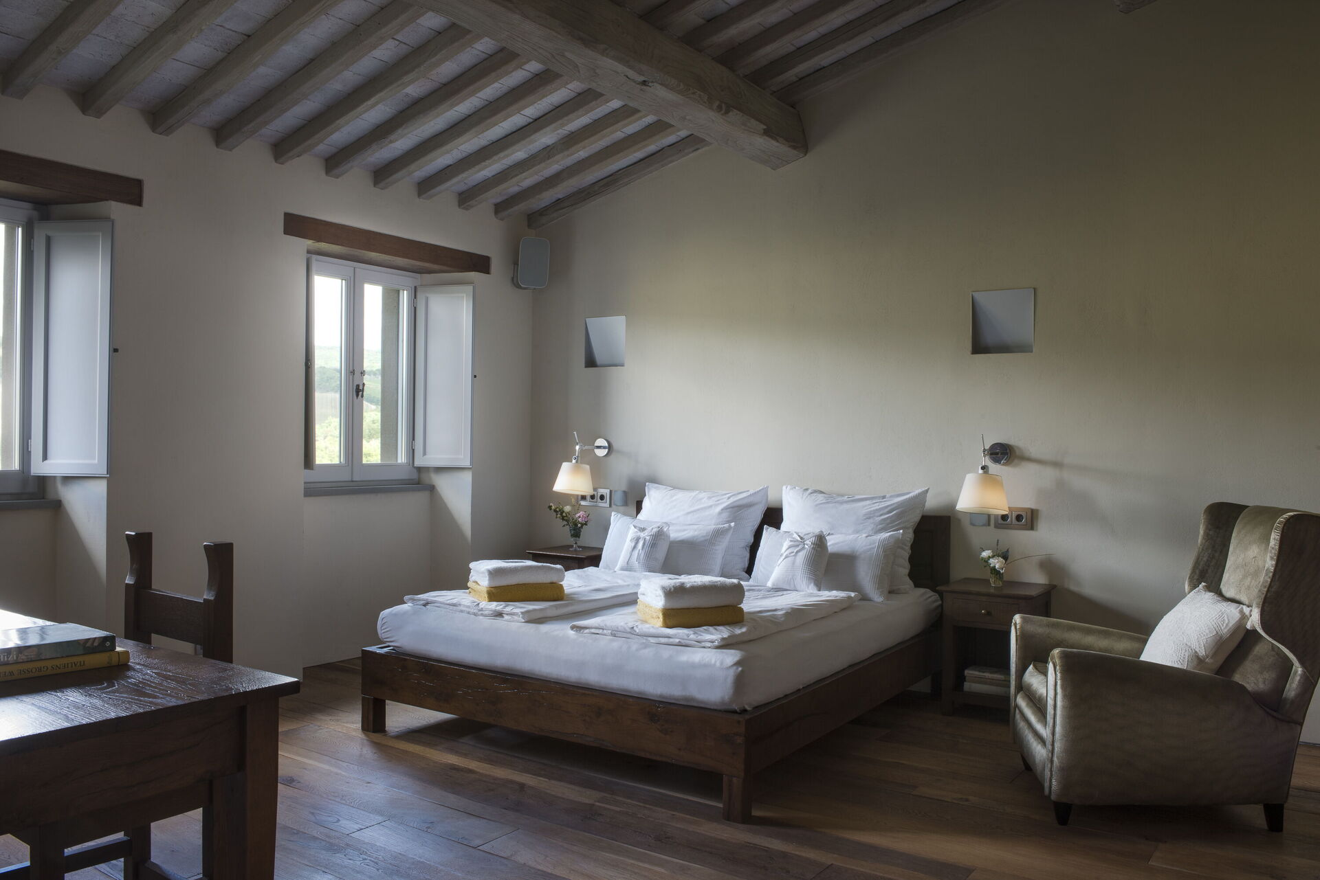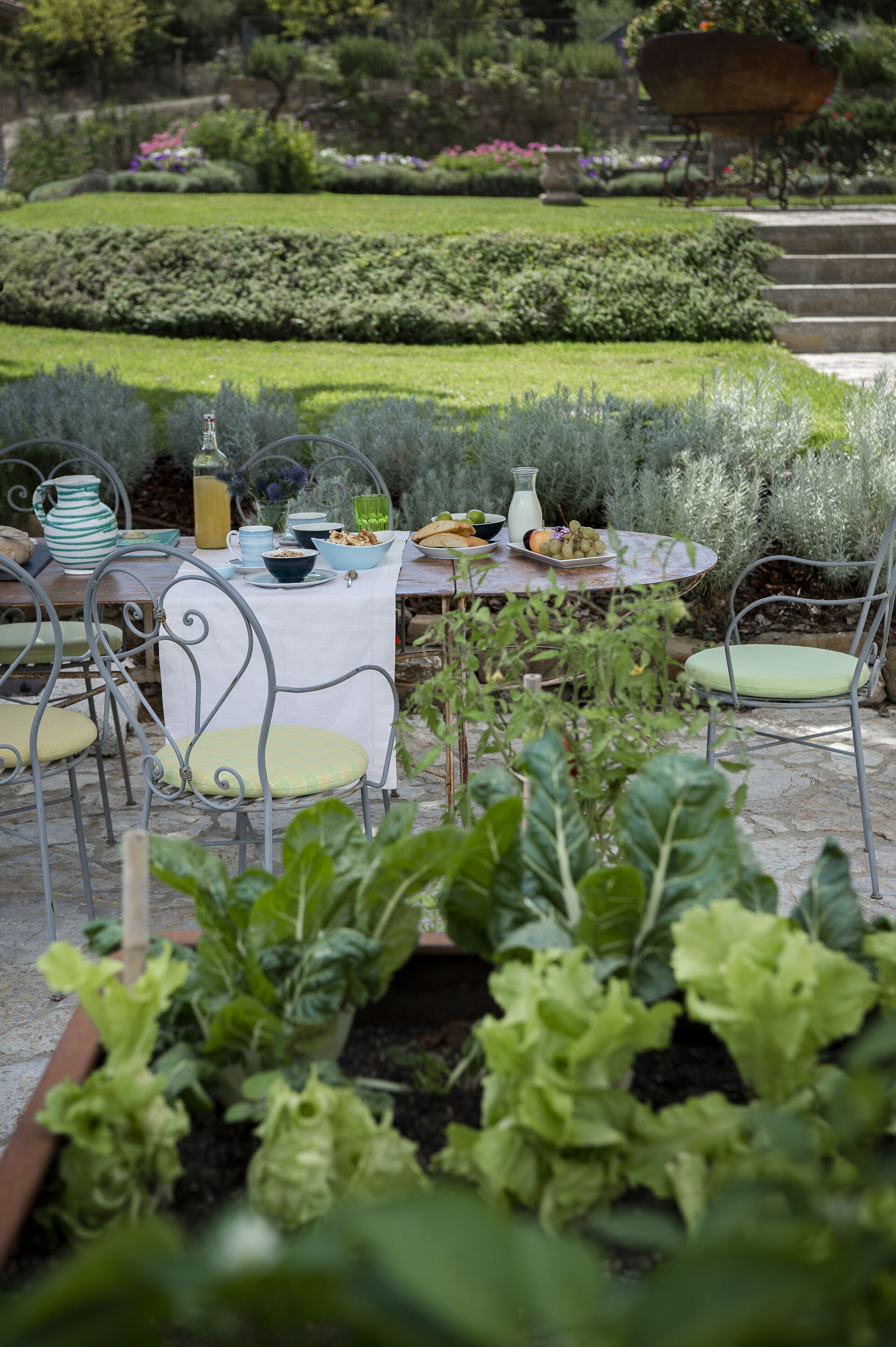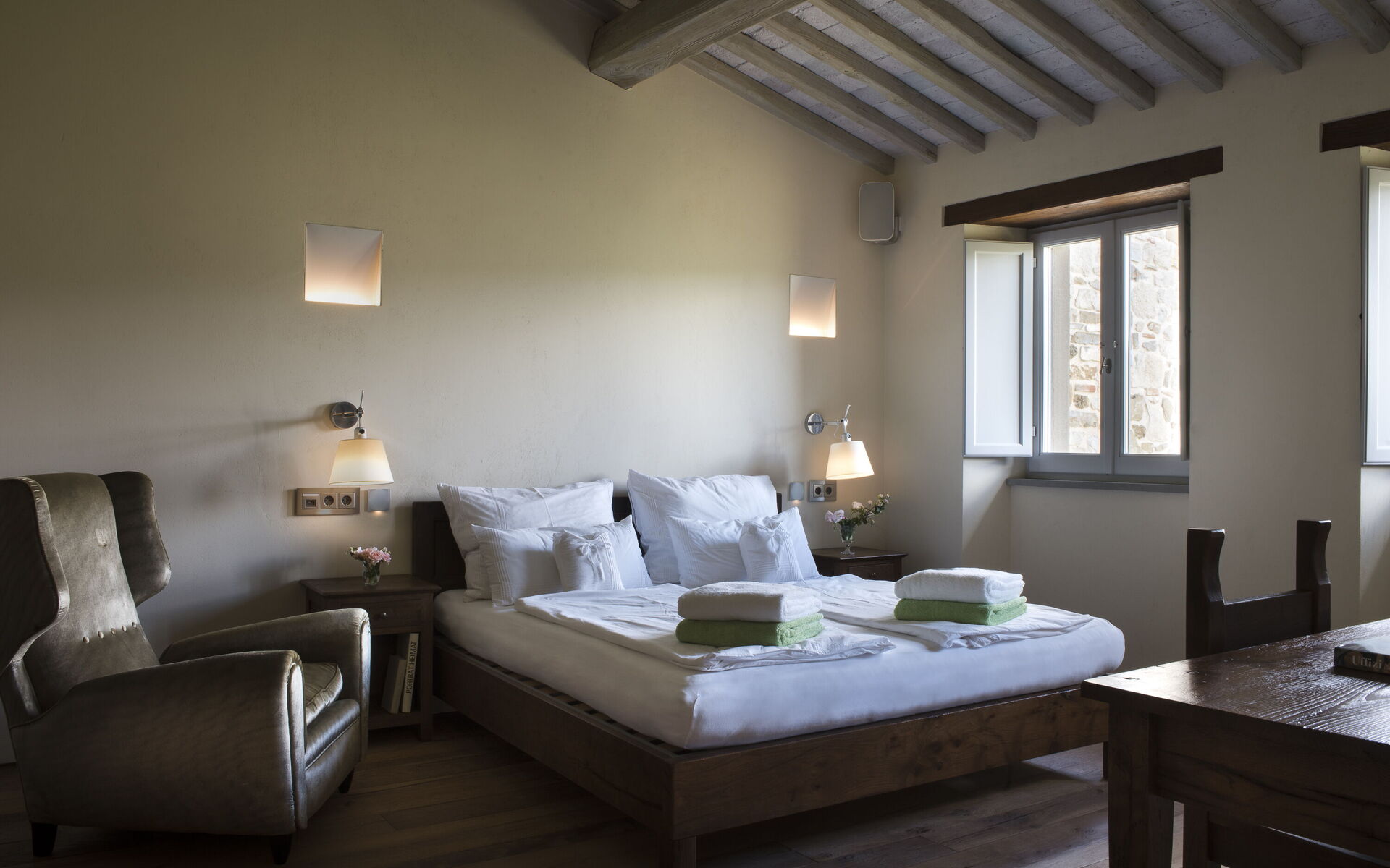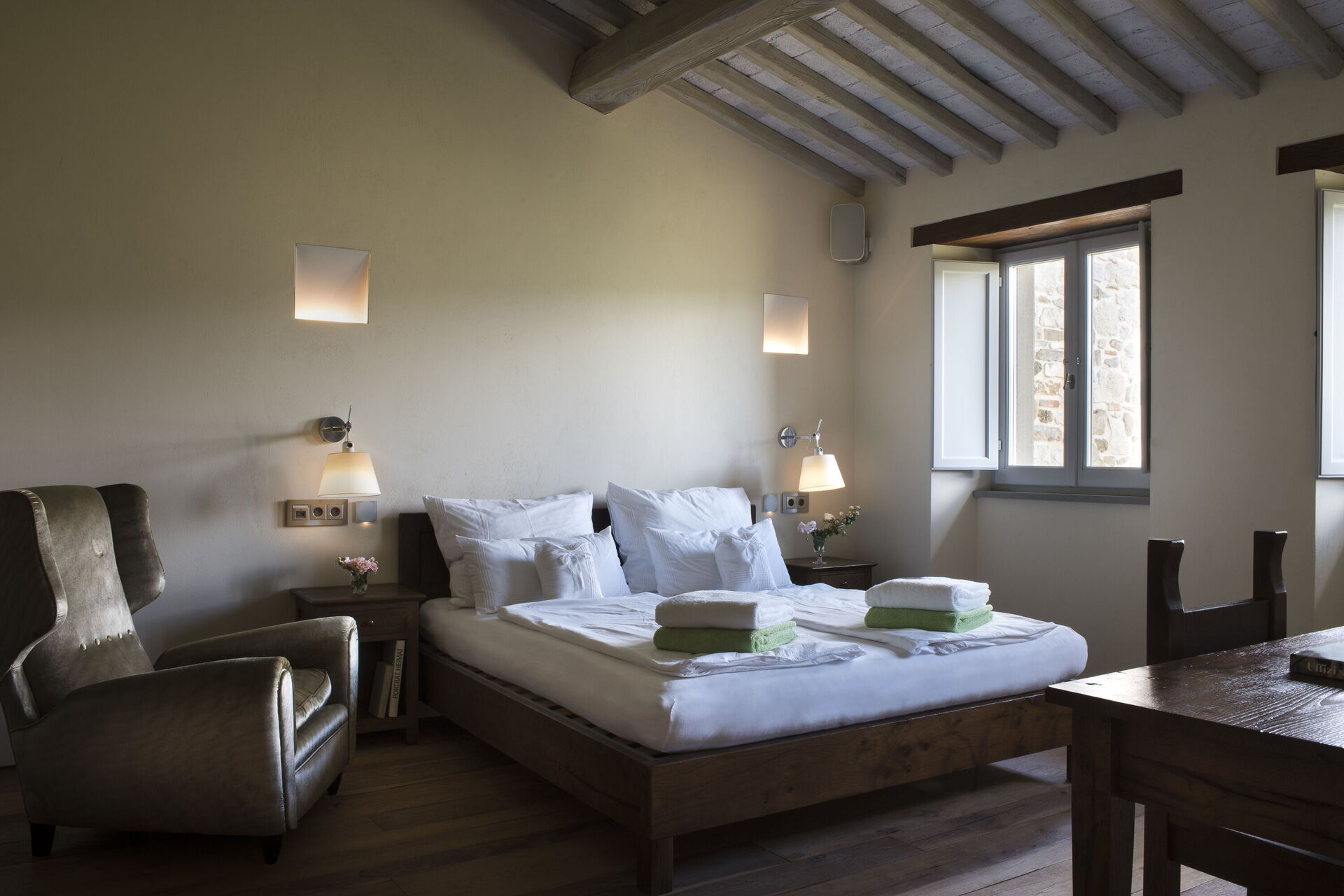 The interior of the villa offers the fascination of stone walls, “cotto” vaulted ceilings, wooden beams and the spaciousness typical of this kind of architecture. This is united to a fresh, modern, creative design in the furnishings. An eclectic mix of rustic and modern styles.