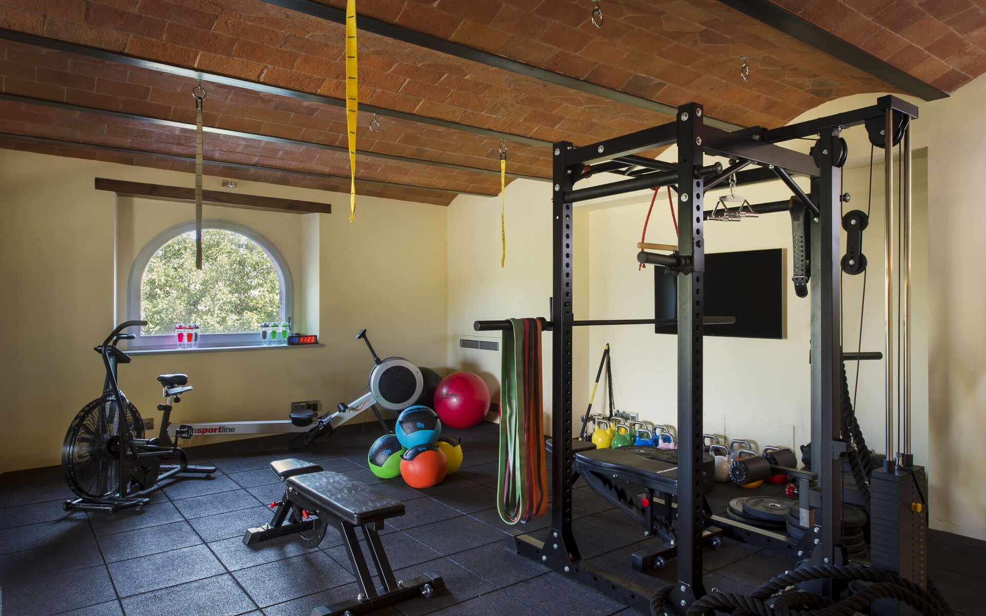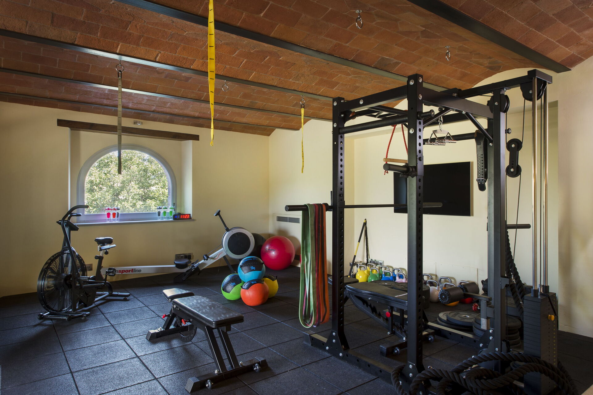 Sitting room with two divans and two armchairs, TV and fireplace. Separate room with two single beds 90 x 180 cm (No en suite bathroom), can be used for kids, or guests. Double bedroom with 2 single beds. Dining room which seats 12, TV SAT, mobile bar. Liveable professional kitchen with stove with 5 gas burners, induction cooking with 2 burners, table for 6, TV. Guest bathroom with WC and washbasin. Elevator Lower floor Wine cellar with a selection of wines for sale. Gym with weights, vogatore, ciclette, yoga equipment, TV. Wellness area with it’s turkish bath, basin and shower. Bathroom with bathtub, WC and basin. Bathroom with shower and basin. Laundry.