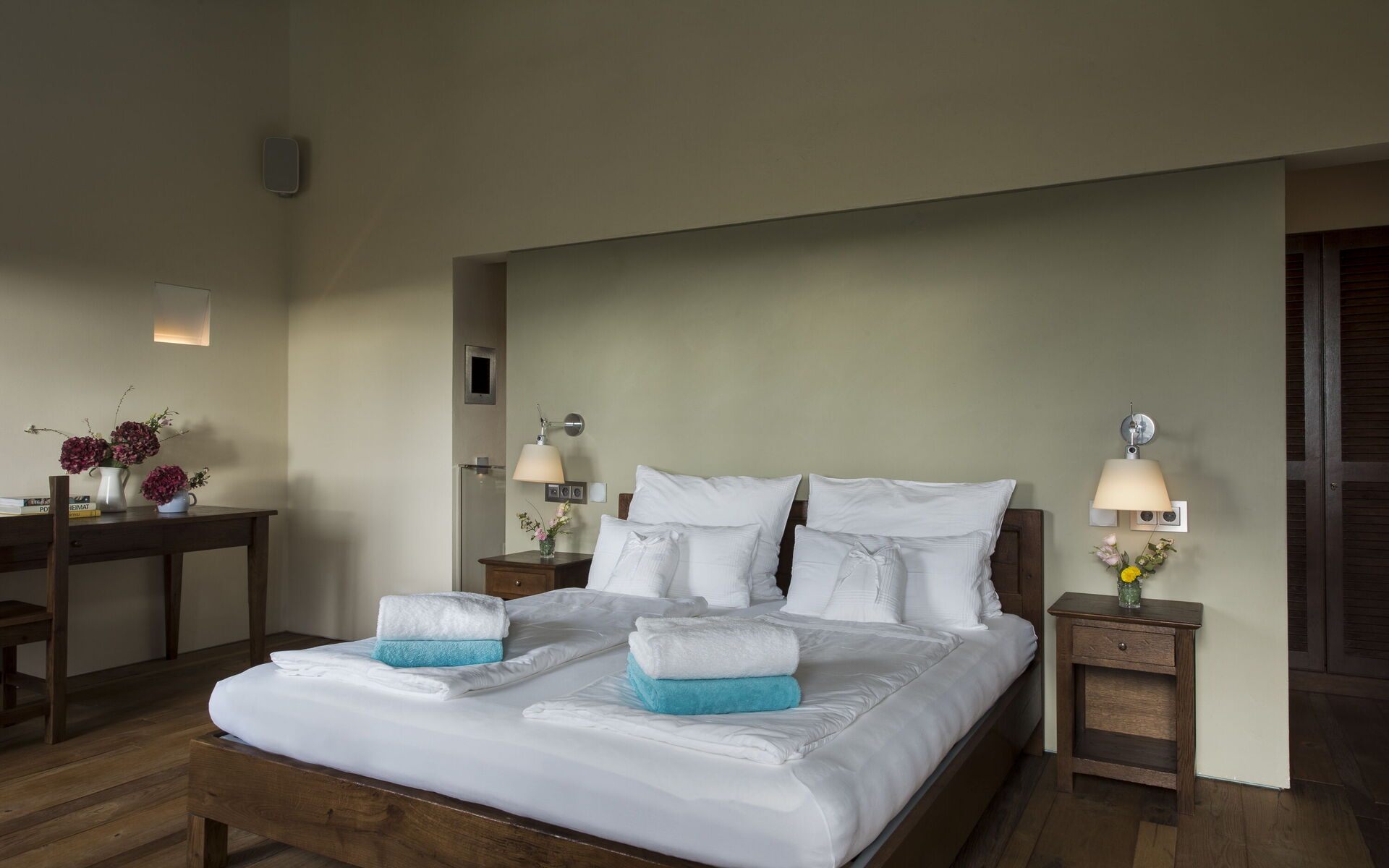 Sitting room with divans, armchairs, Smart-TV and fireplace, bar with glasses, wine fridge, ice maker, little fridge. Bedroom 1 double bed, wardrobe, desk and chair, ensuite bathroom with shower, bidet, basin, WC Bedroom 2 double bed, wardrobe, desk and chair, ensuite bathroom with shower, bidet, basin, WC Bedroom 3 double bed, wardrobe, desk and chair, ensuite bathroom with shower, bidet, basin, WC Bedroom 4 double bed, wardrobe, desk and chair, ensuite bathroom with shower, bidet, basin, WC Bedroom 5 double bed, wardrobe, desk and chair, ensuite bathroom with shower, bidet, basin, WC