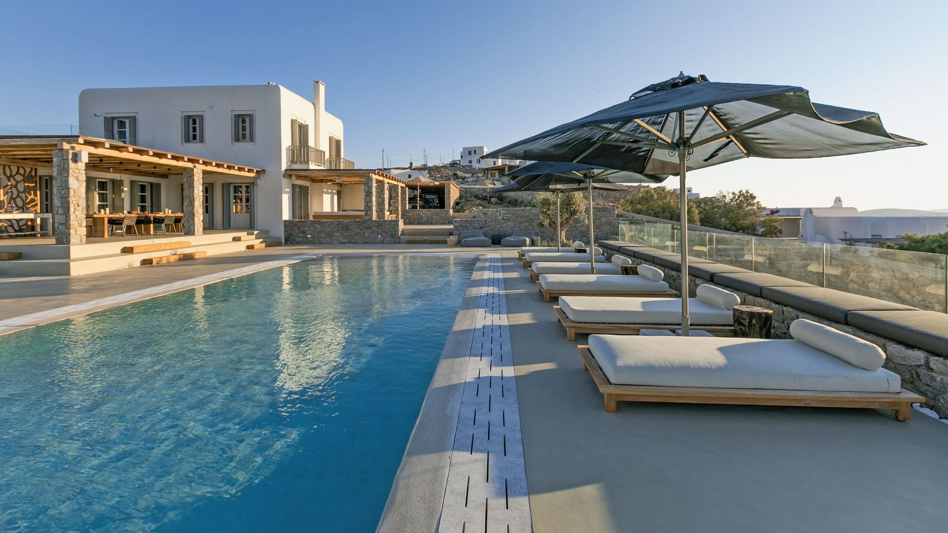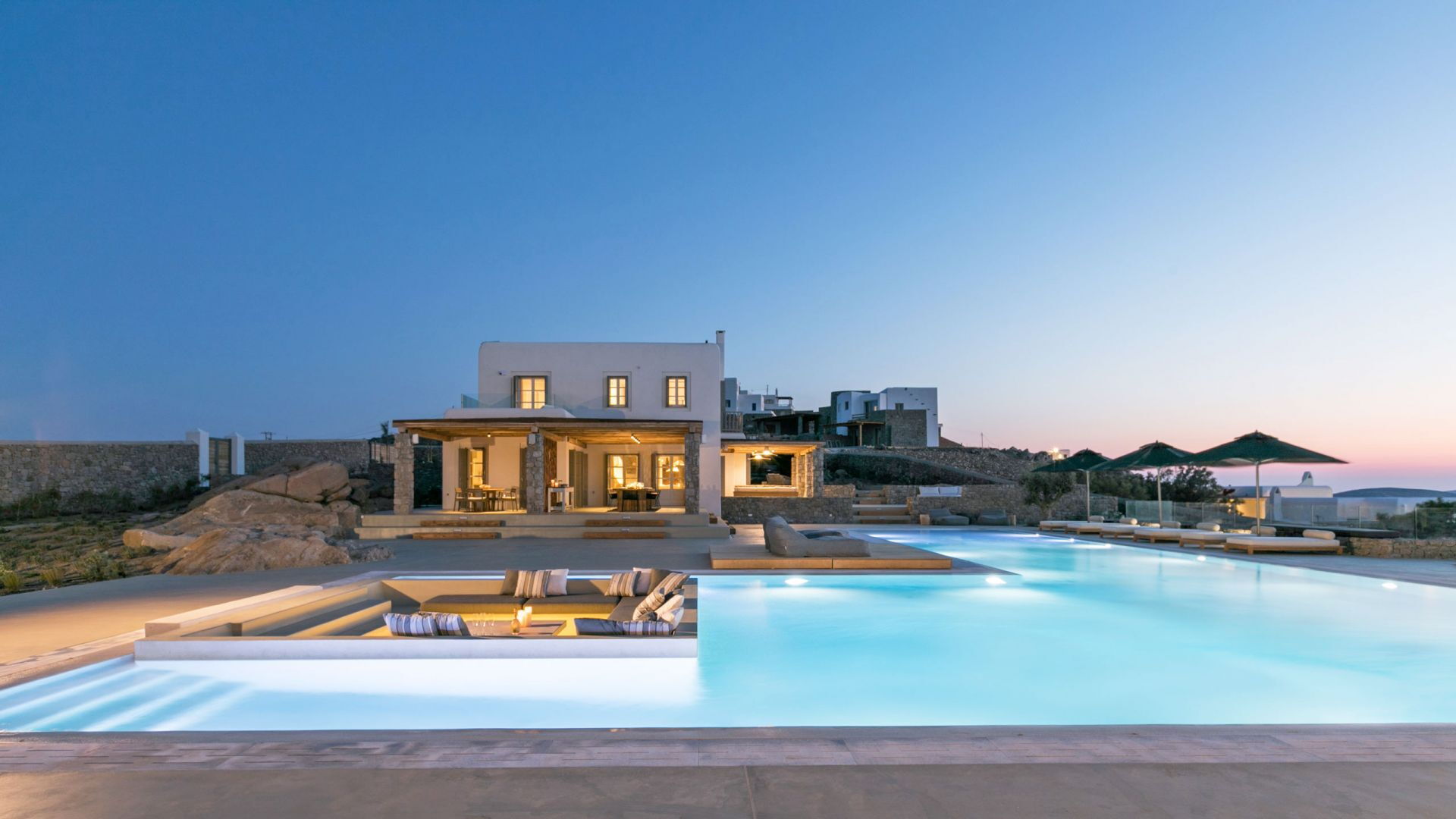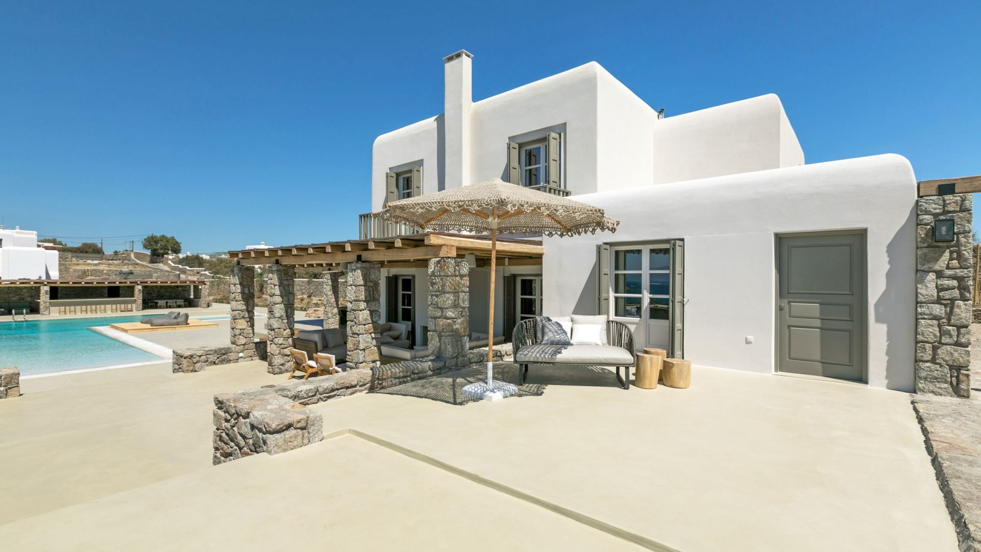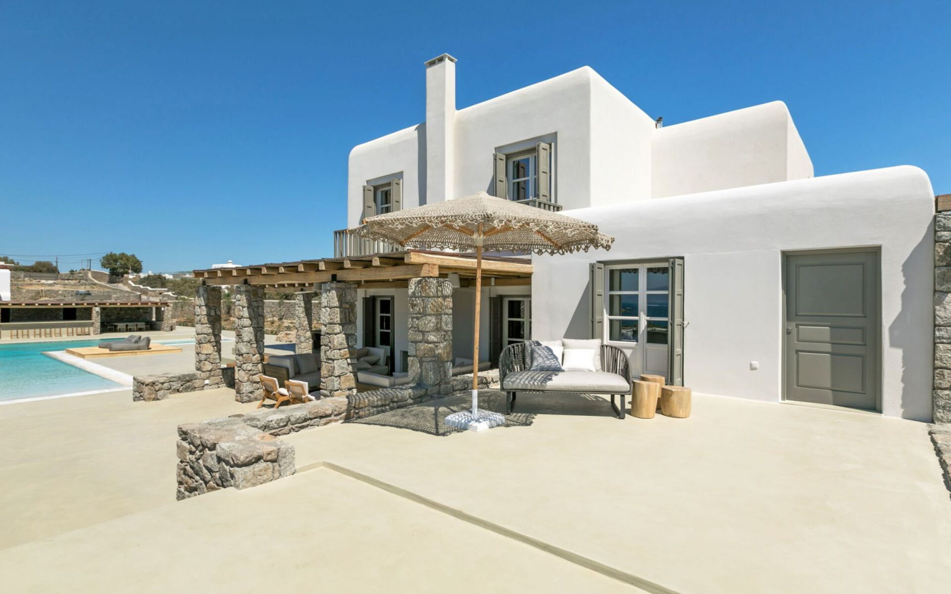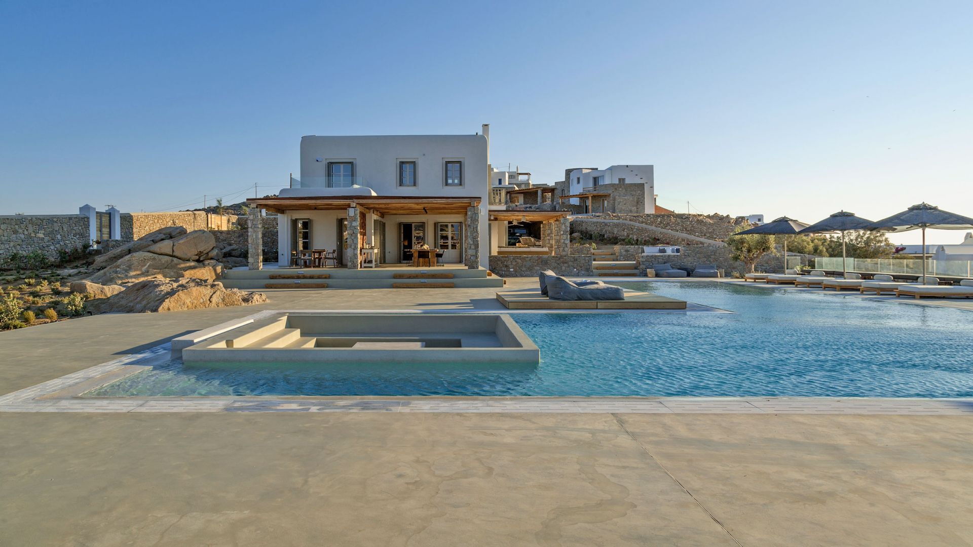 De locatie biedt gemakkelijke toegang tot de populairste zuidelijke stranden terwijl het ook een klein eindje rijden is naar het ongeëvenaarde nachtleven van Mykonos-stad. Trouw aan de zomerse uitstraling van de villa zijn de buitenruimtes ontworpen om de hele dag comfortabel van te genieten. Ligstoelen, bedden in cabanastijl, zomerbanken, kussens en poefs omringen het grote privézwembad.