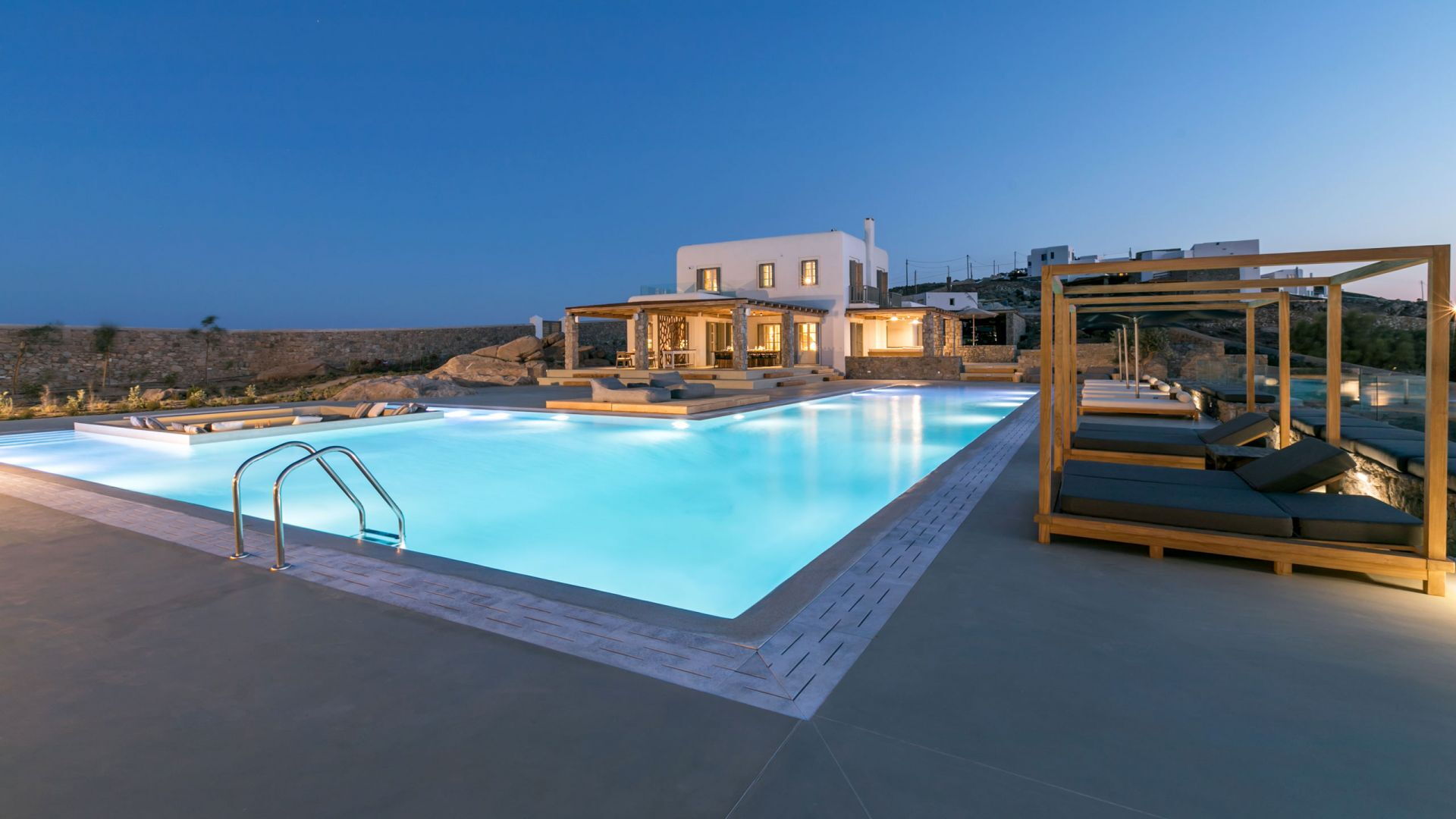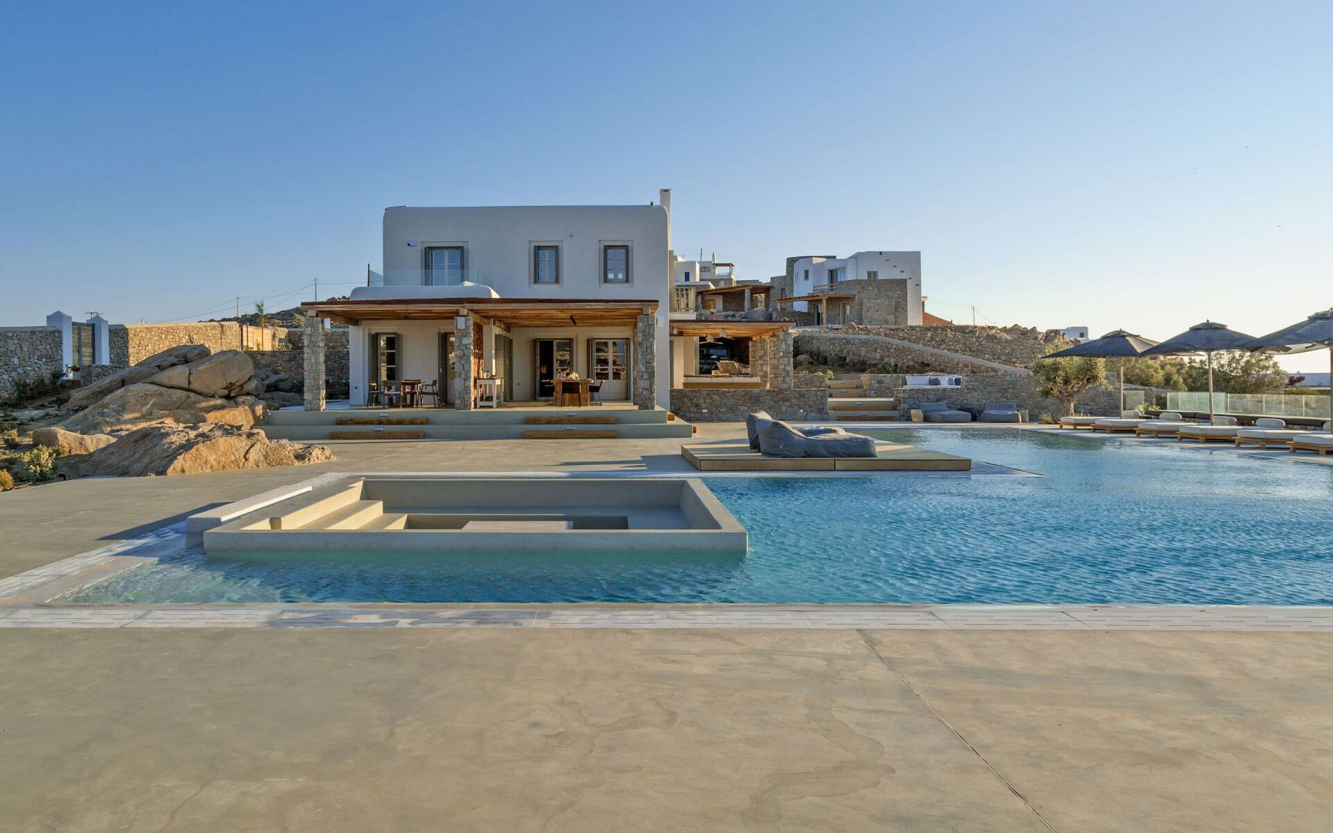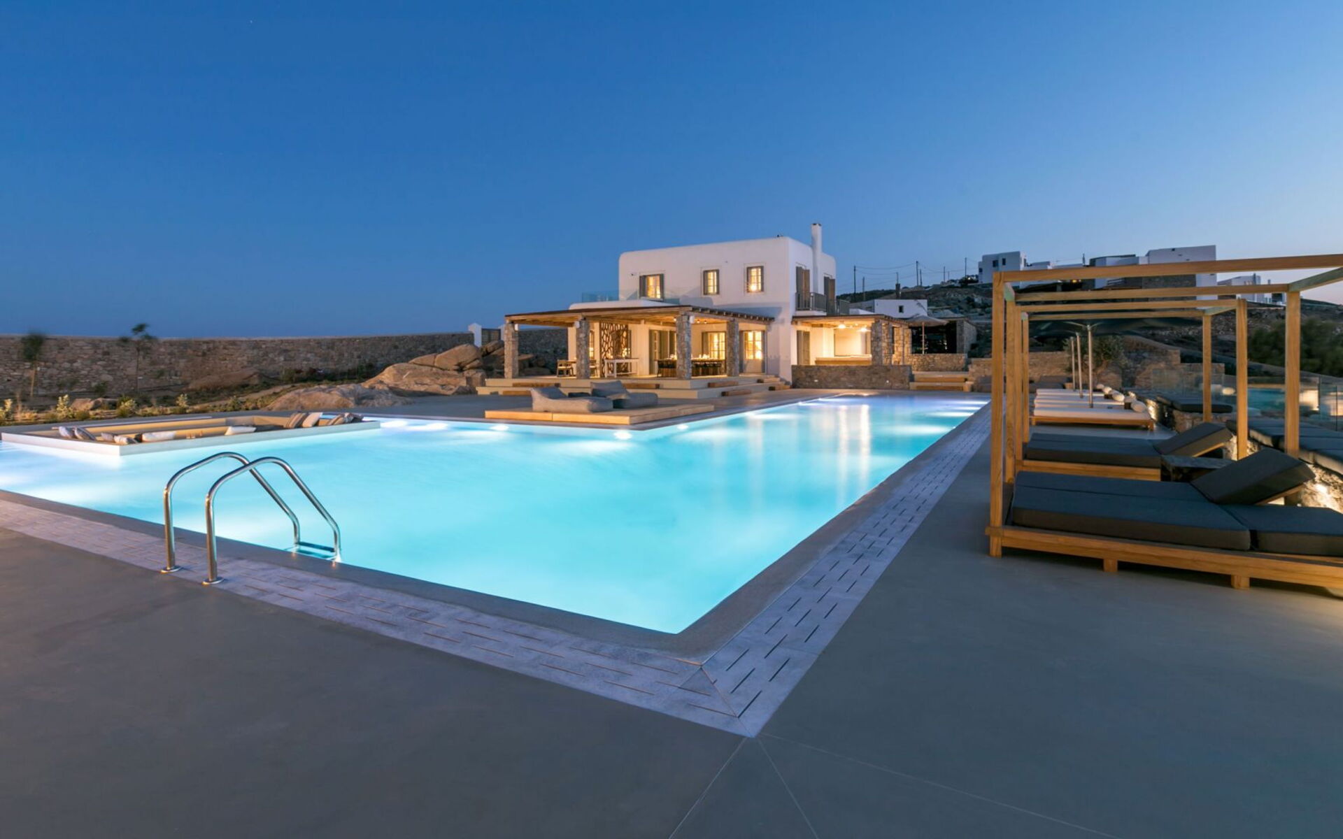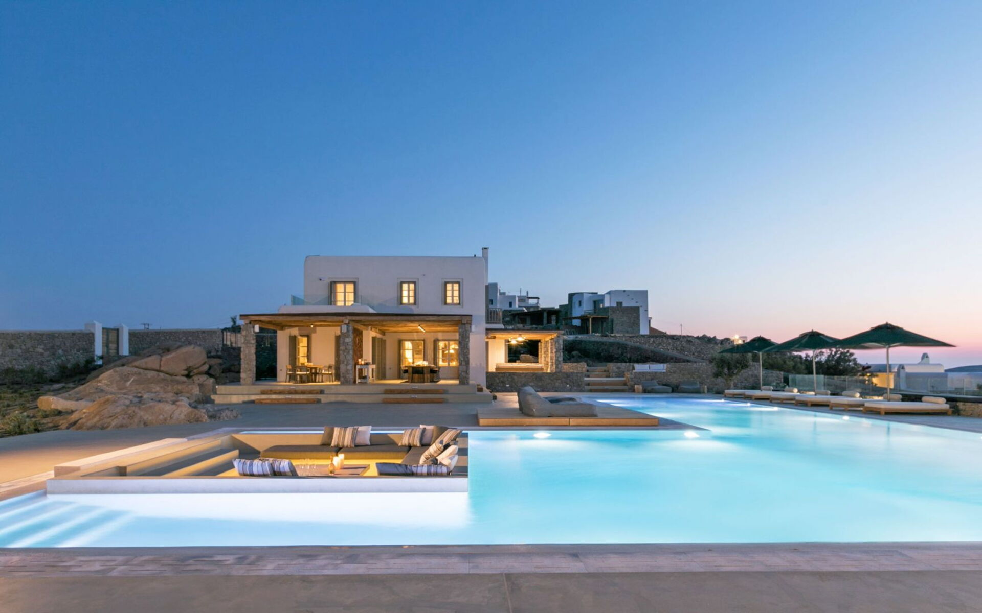 De locatie biedt gemakkelijke toegang tot de populairste zuidelijke stranden terwijl het ook een klein eindje rijden is naar het ongeëvenaarde nachtleven van Mykonos-stad. Trouw aan de zomerse uitstraling van de villa zijn de buitenruimtes ontworpen om de hele dag comfortabel van te genieten. Ligstoelen, bedden in cabanastijl, zomerbanken, kussens en poefs omringen het grote privézwembad.