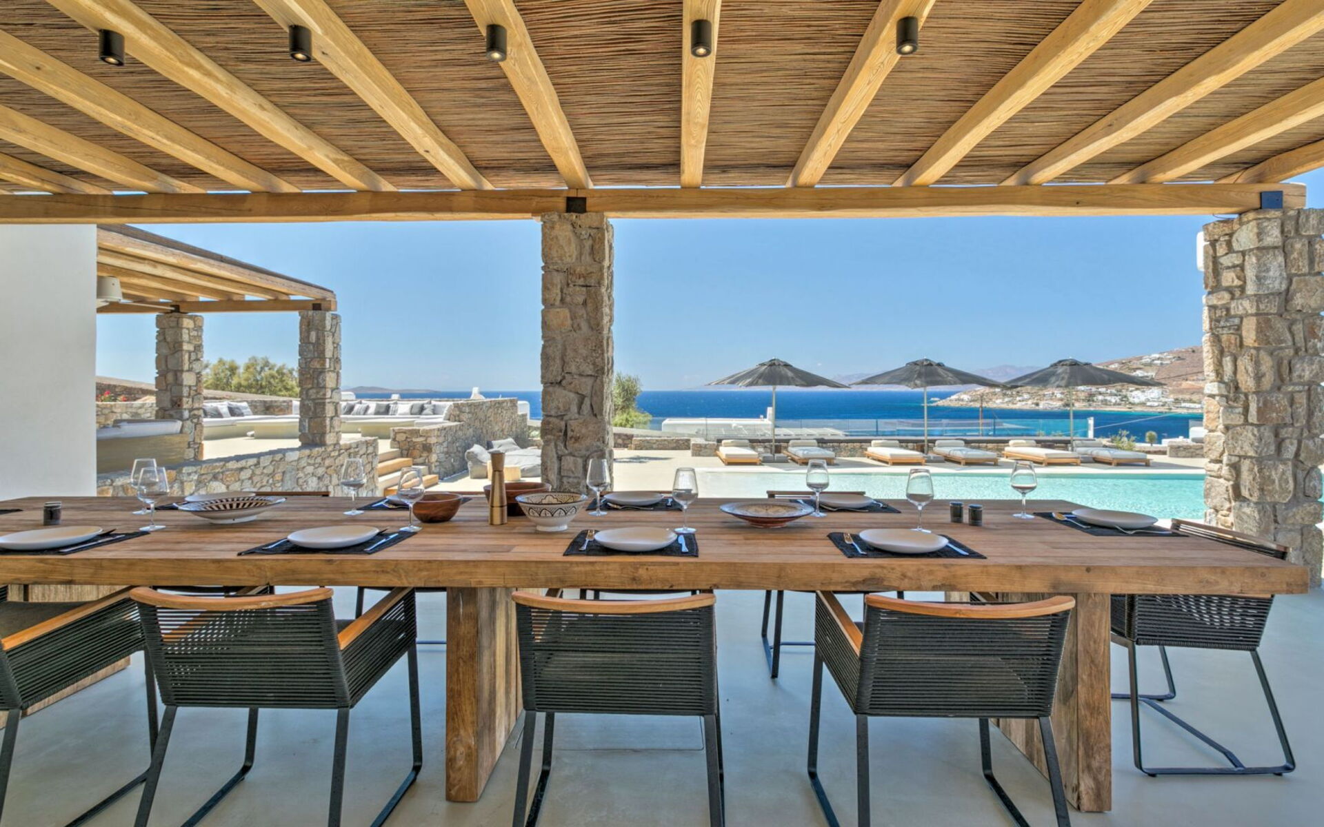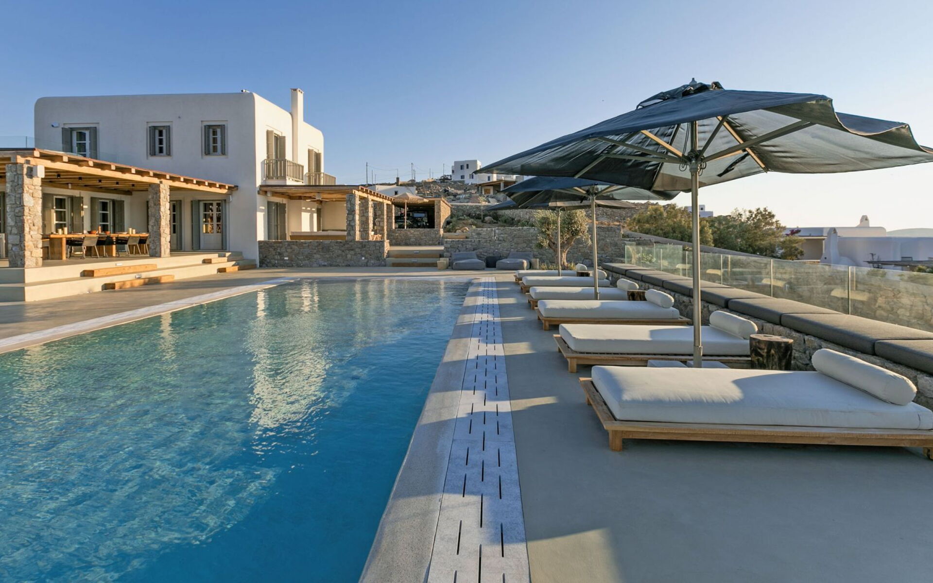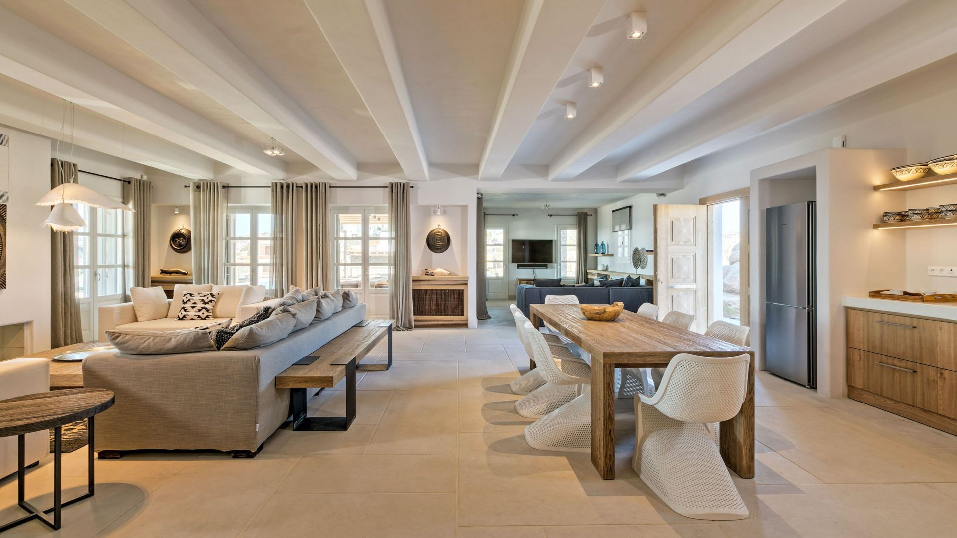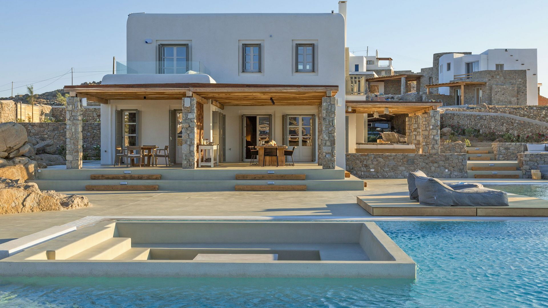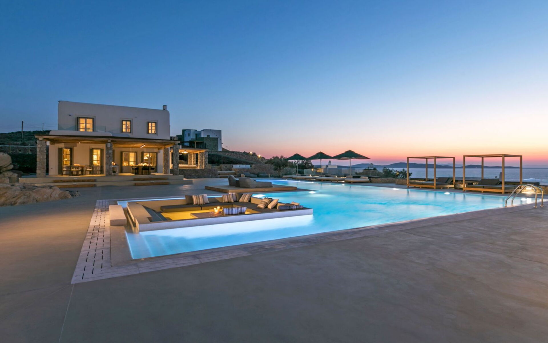 De locatie biedt gemakkelijke toegang tot de populairste zuidelijke stranden terwijl het ook een klein eindje rijden is naar het ongeëvenaarde nachtleven van Mykonos-stad. Trouw aan de zomerse uitstraling van de villa zijn de buitenruimtes ontworpen om de hele dag comfortabel van te genieten. Ligstoelen, bedden in cabanastijl, zomerbanken, kussens en poefs omringen het grote privézwembad.