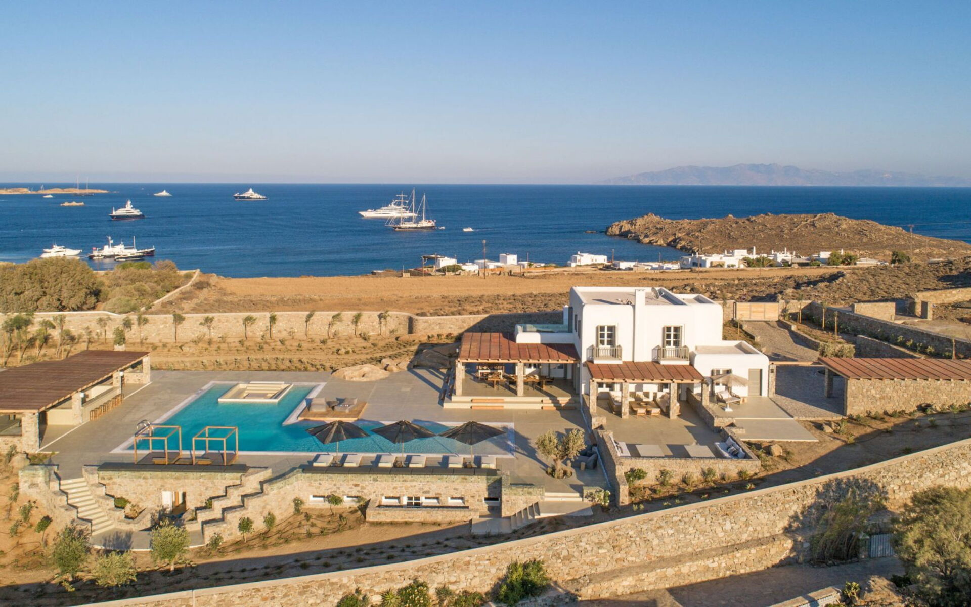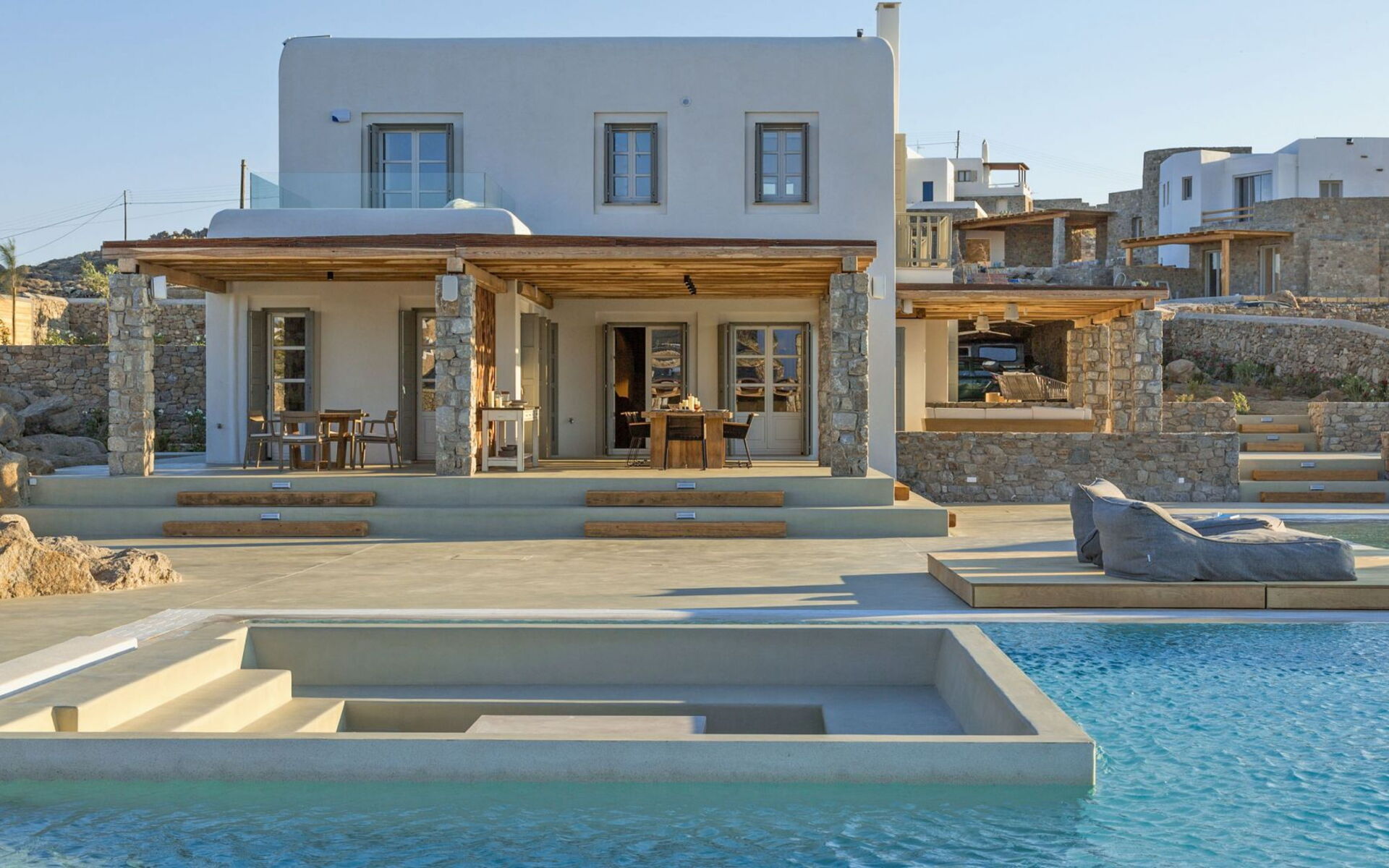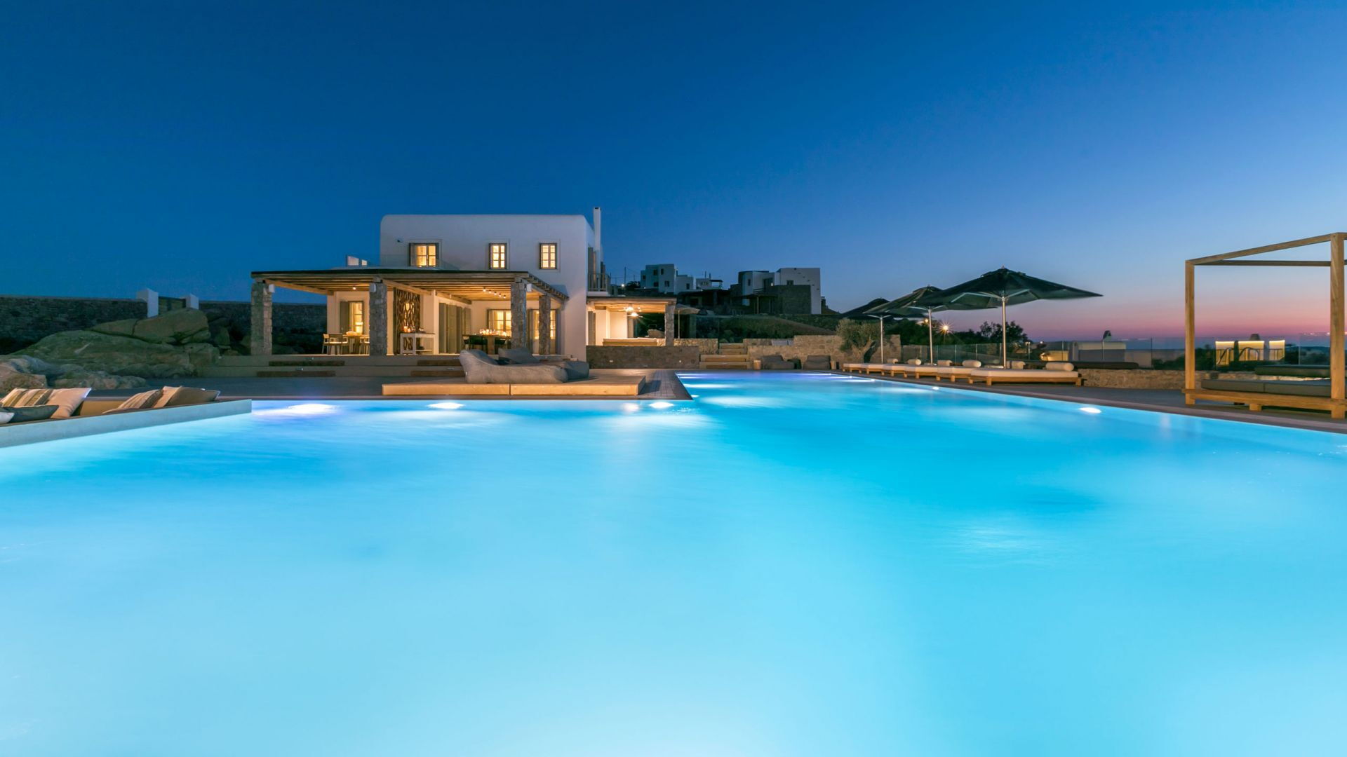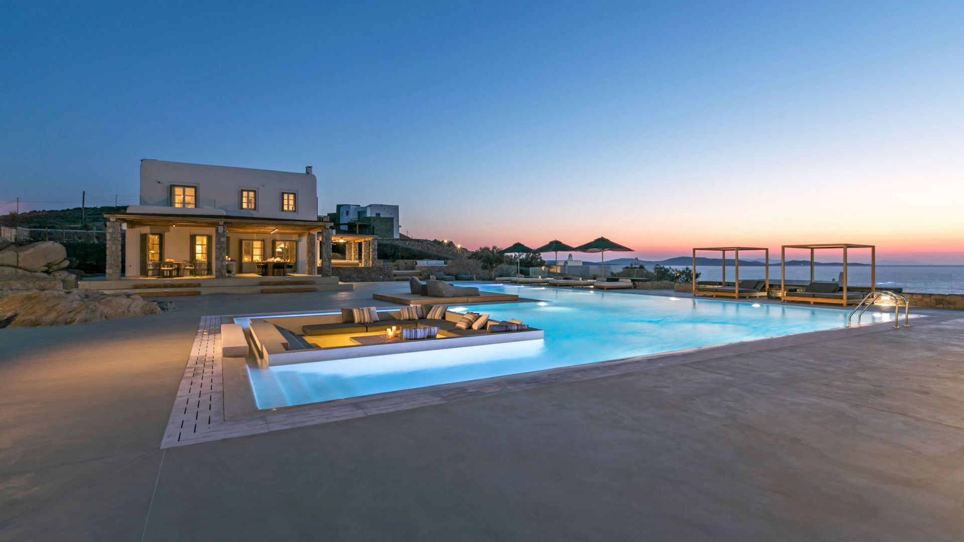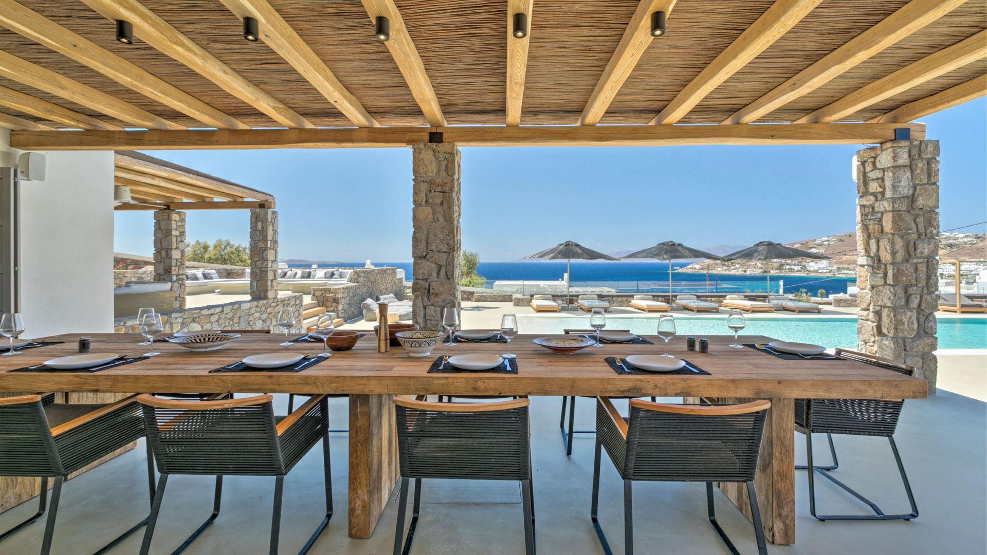De locatie biedt gemakkelijke toegang tot de populairste zuidelijke stranden terwijl het ook een klein eindje rijden is naar het ongeëvenaarde nachtleven van Mykonos-stad. Trouw aan de zomerse uitstraling van de villa zijn de buitenruimtes ontworpen om de hele dag comfortabel van te genieten. Ligstoelen, bedden in cabanastijl, zomerbanken, kussens en poefs omringen het grote privézwembad.