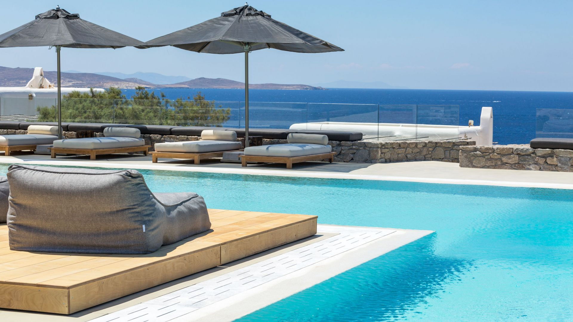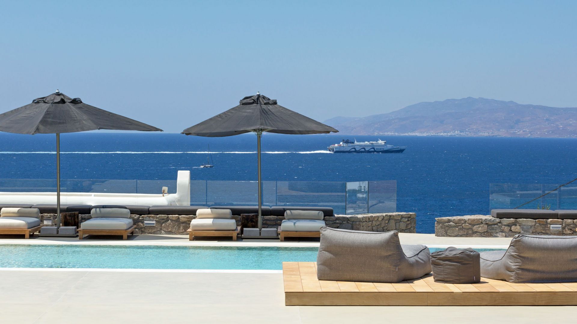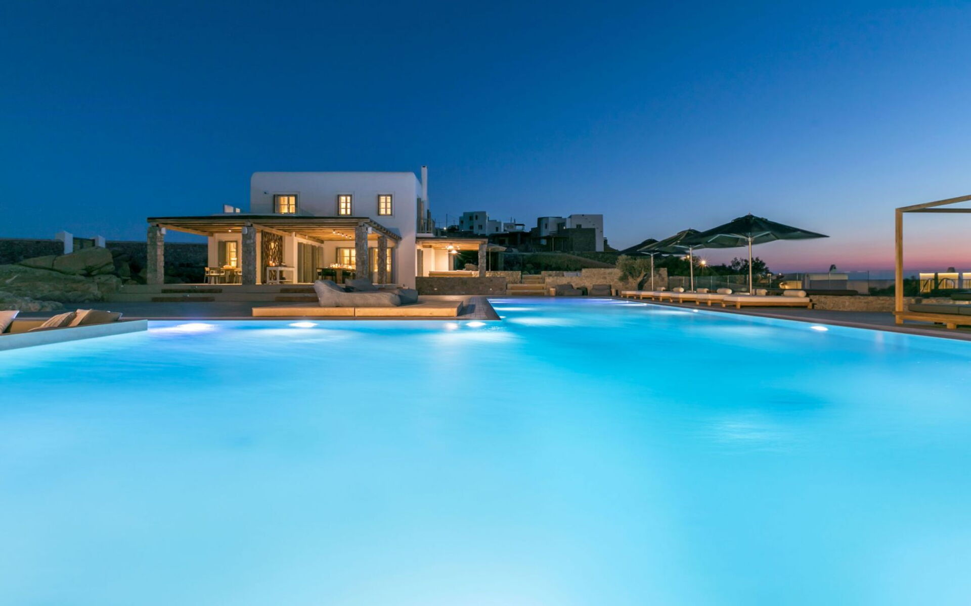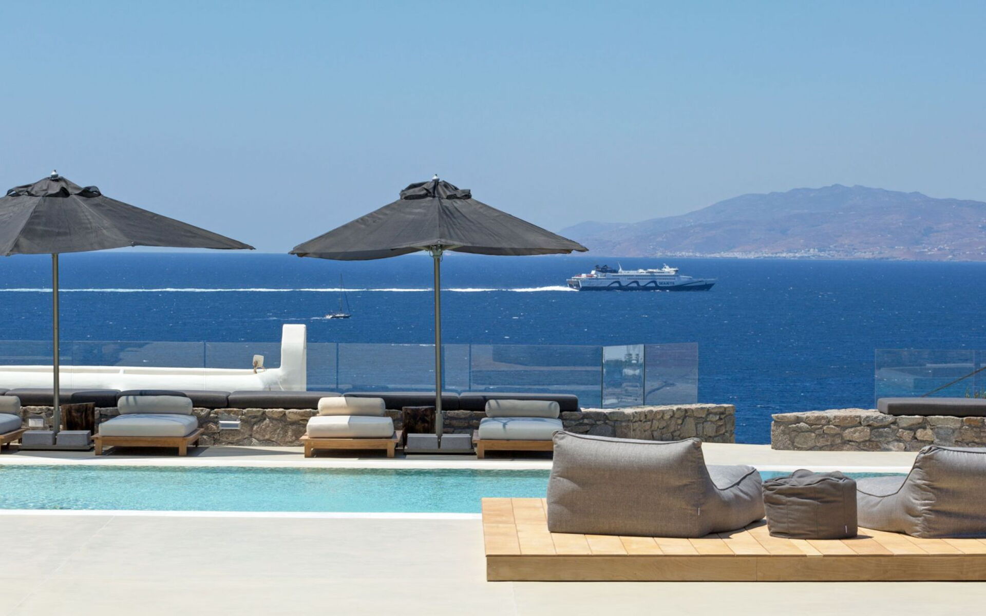 De locatie biedt gemakkelijke toegang tot de populairste zuidelijke stranden terwijl het ook een klein eindje rijden is naar het ongeëvenaarde nachtleven van Mykonos-stad. Trouw aan de zomerse uitstraling van de villa zijn de buitenruimtes ontworpen om de hele dag comfortabel van te genieten. Ligstoelen, bedden in cabanastijl, zomerbanken, kussens en poefs omringen het grote privézwembad.