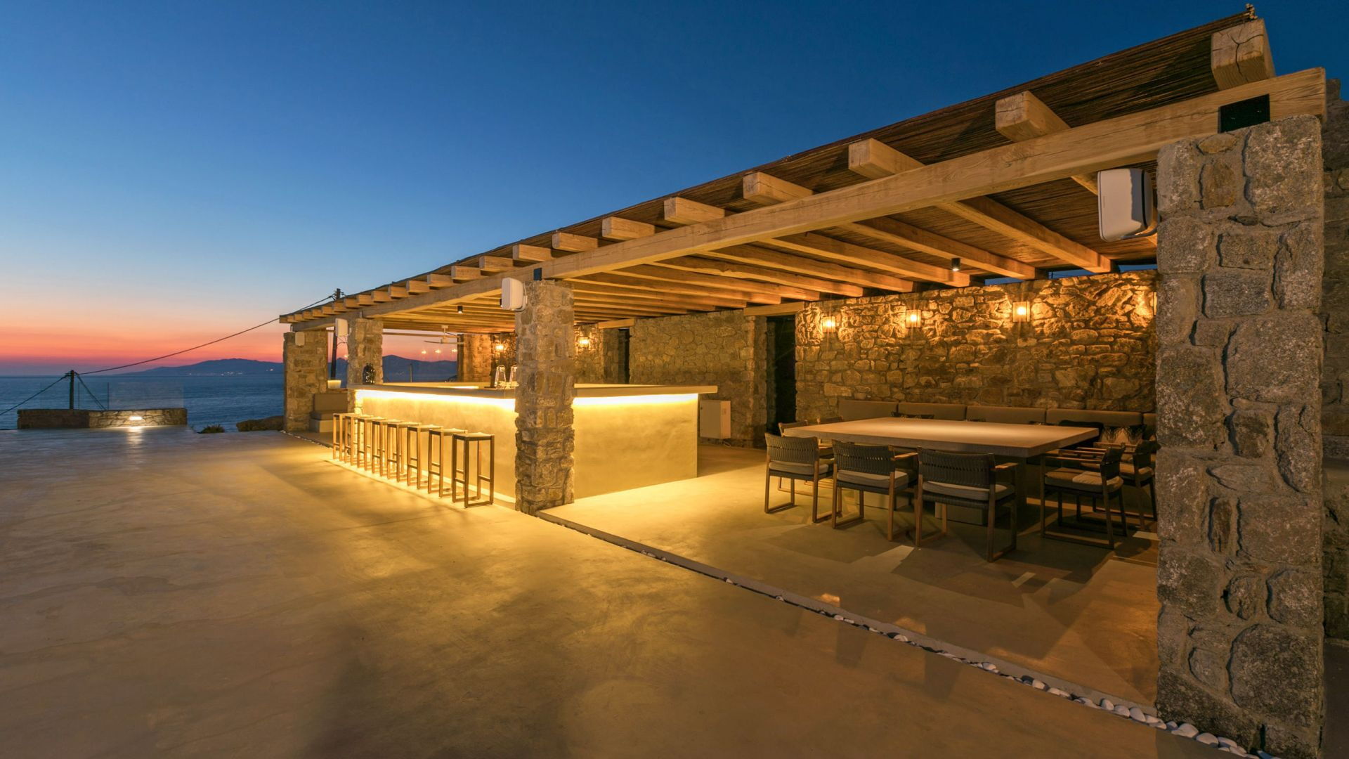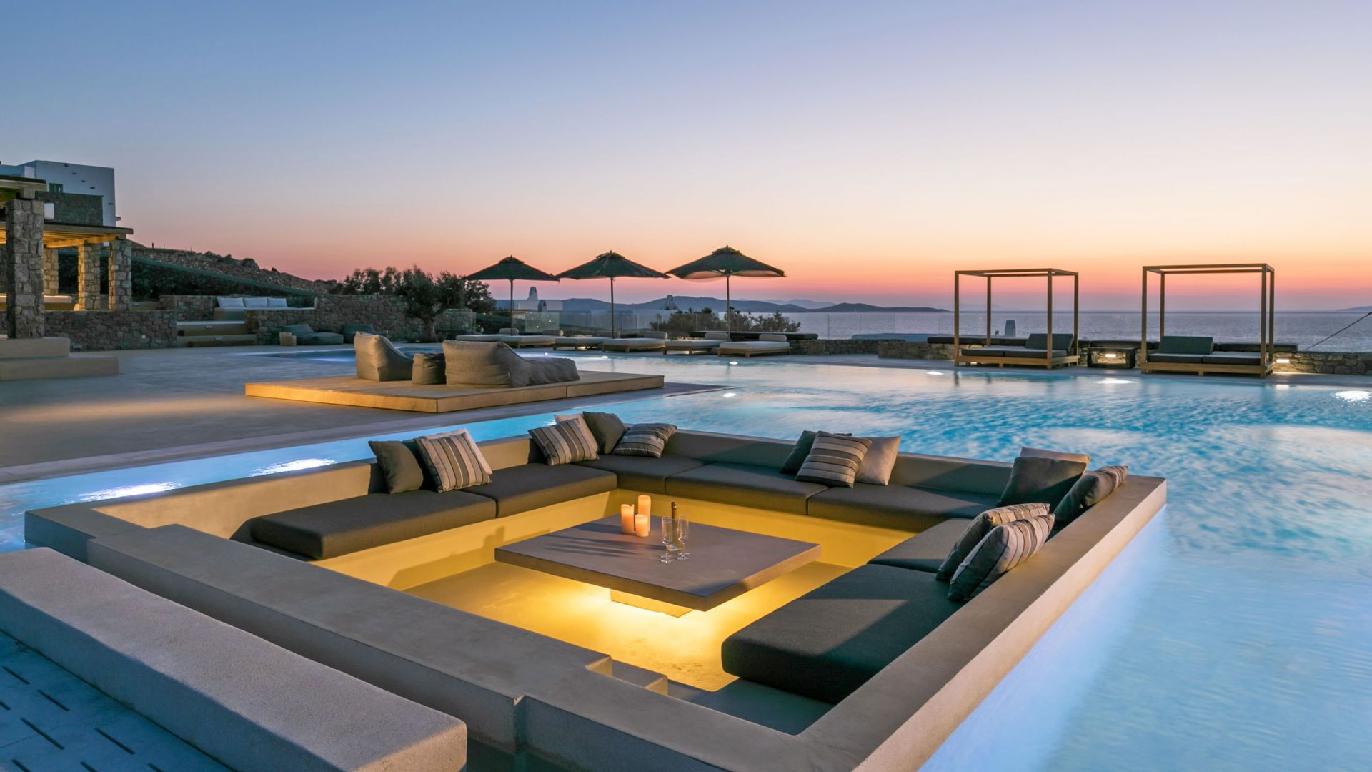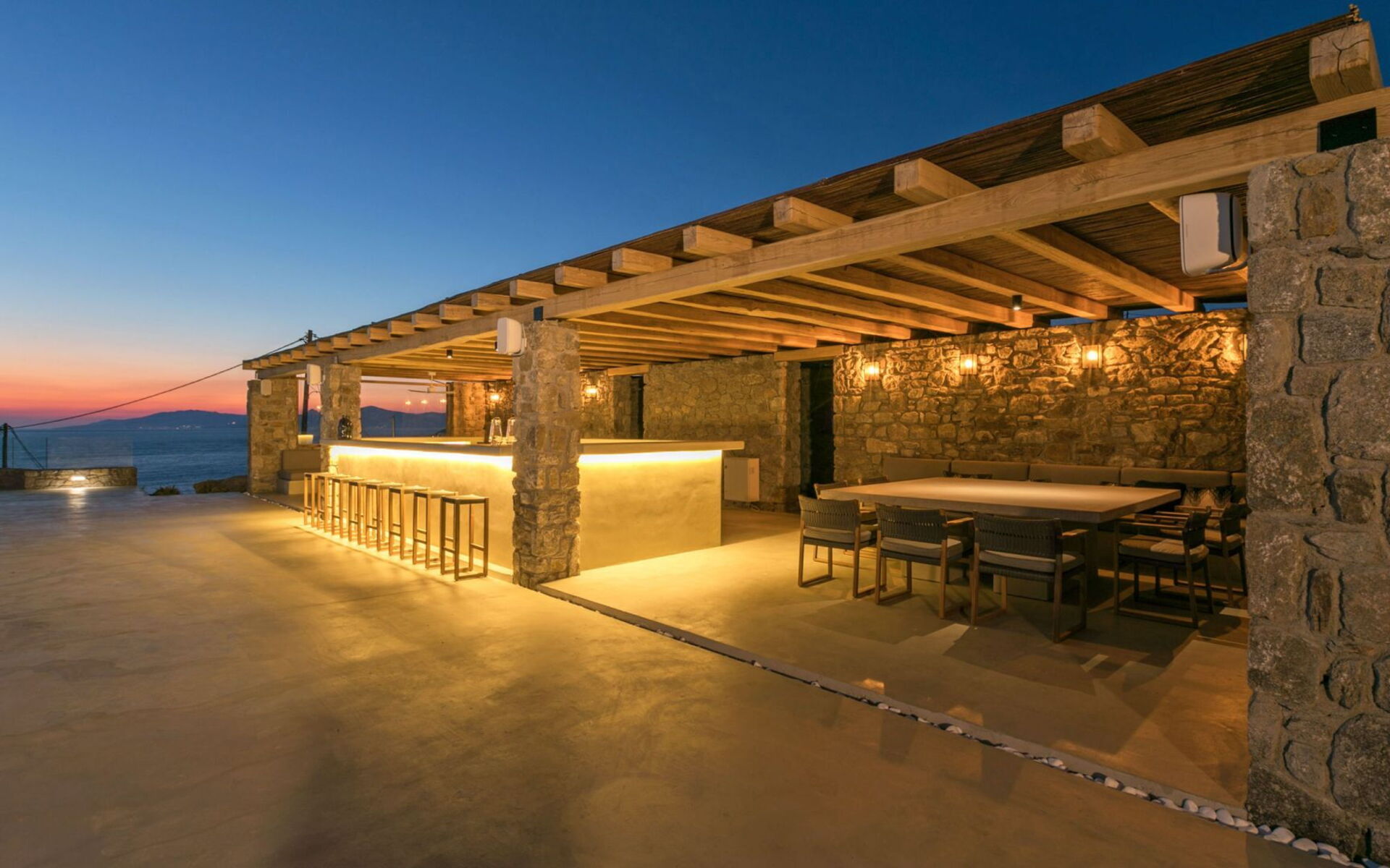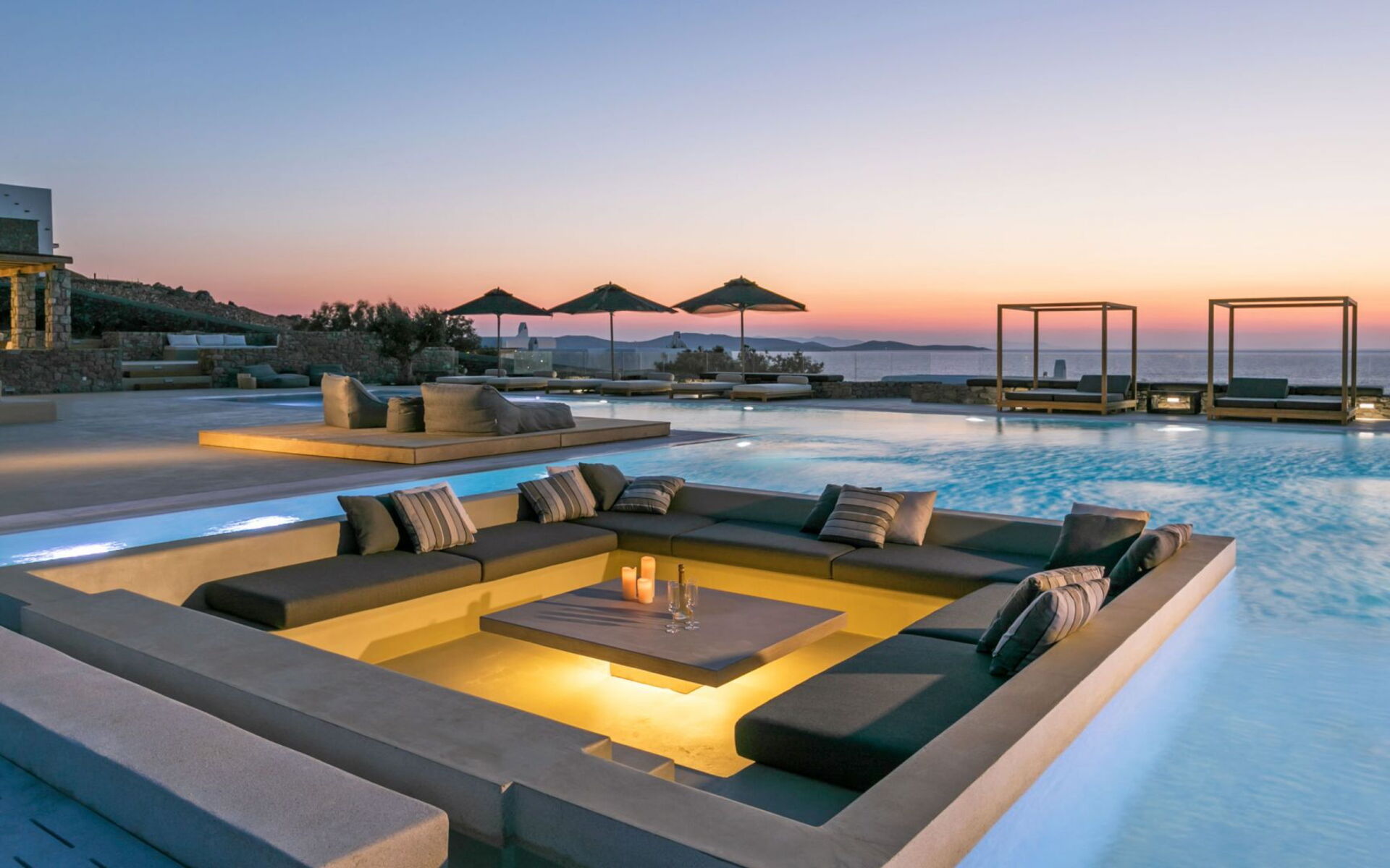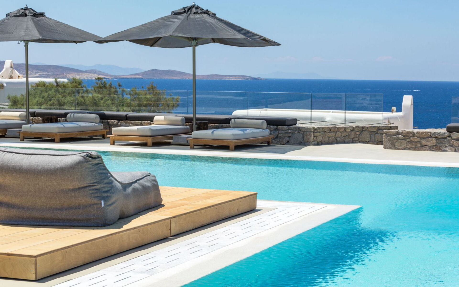 De locatie biedt gemakkelijke toegang tot de populairste zuidelijke stranden terwijl het ook een klein eindje rijden is naar het ongeëvenaarde nachtleven van Mykonos-stad. Trouw aan de zomerse uitstraling van de villa zijn de buitenruimtes ontworpen om de hele dag comfortabel van te genieten. Ligstoelen, bedden in cabanastijl, zomerbanken, kussens en poefs omringen het grote privézwembad.