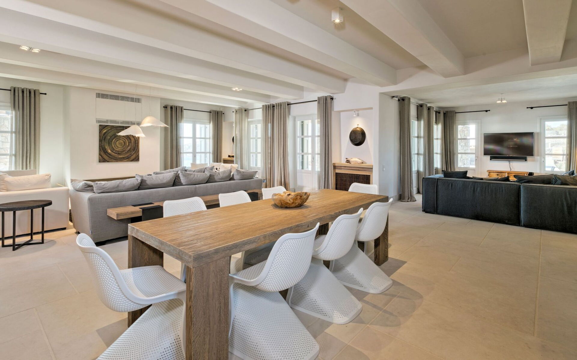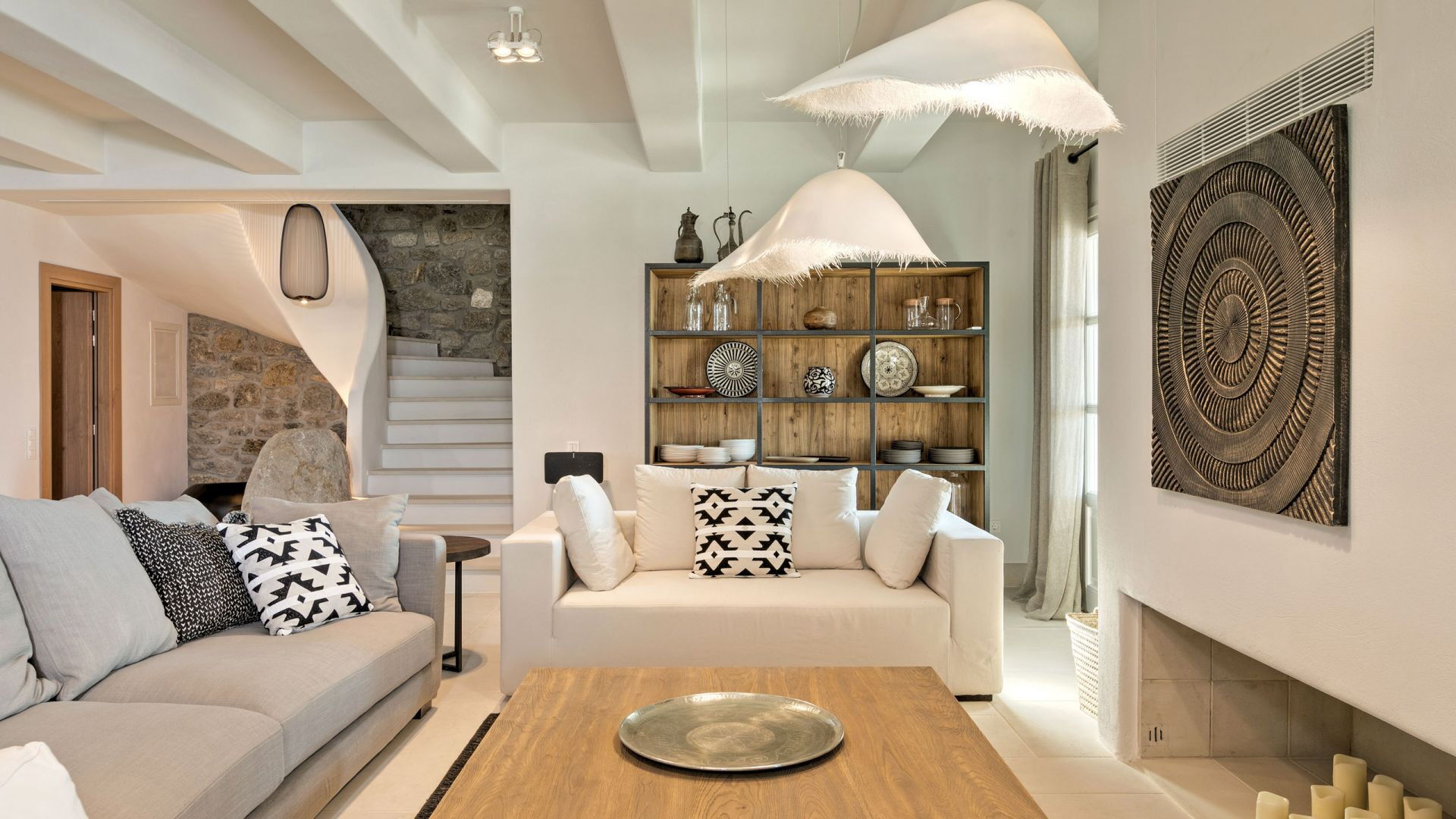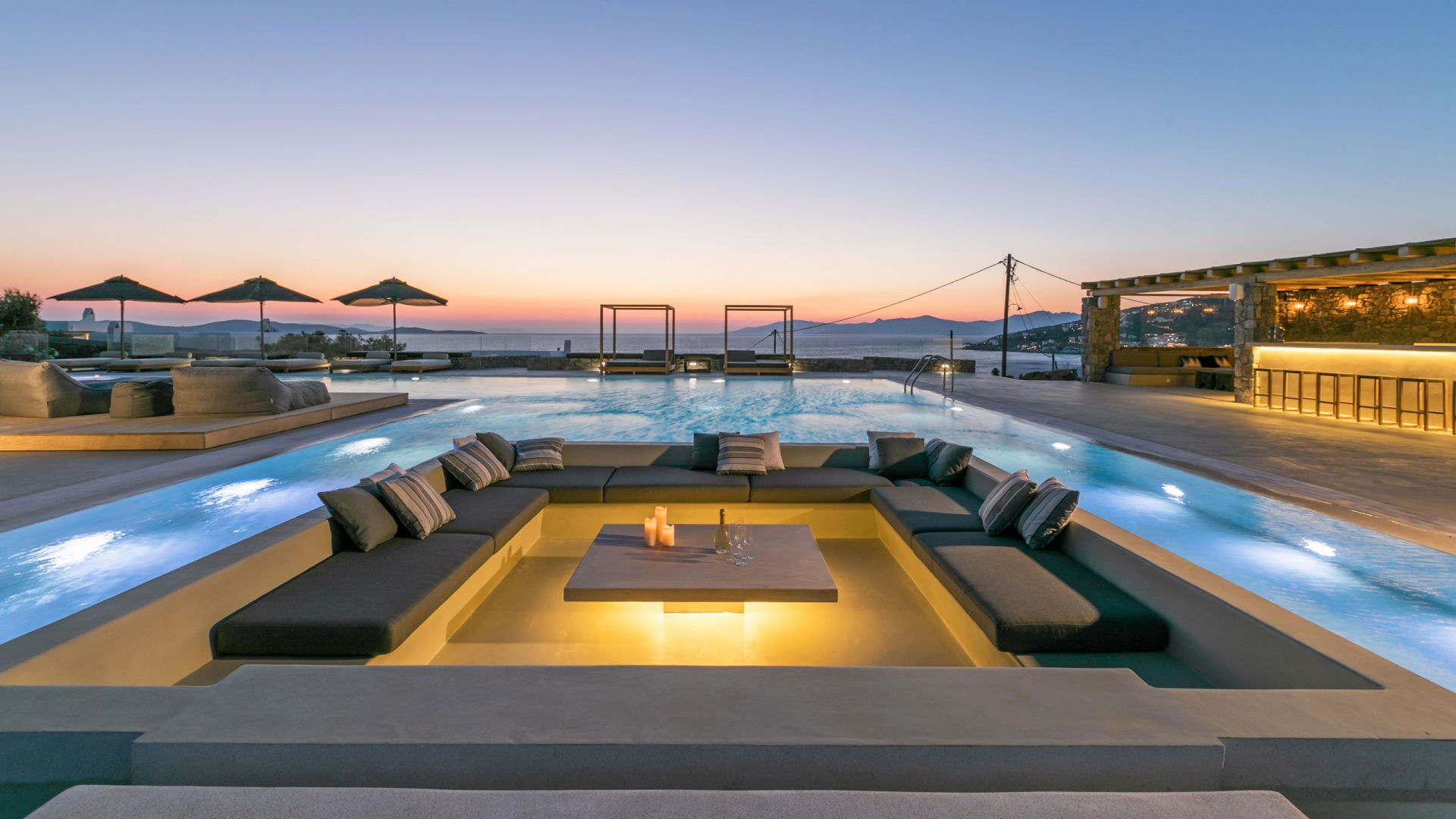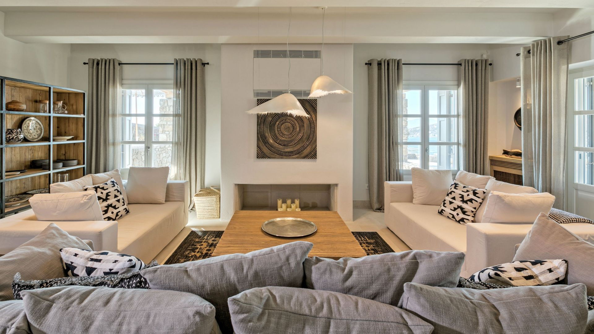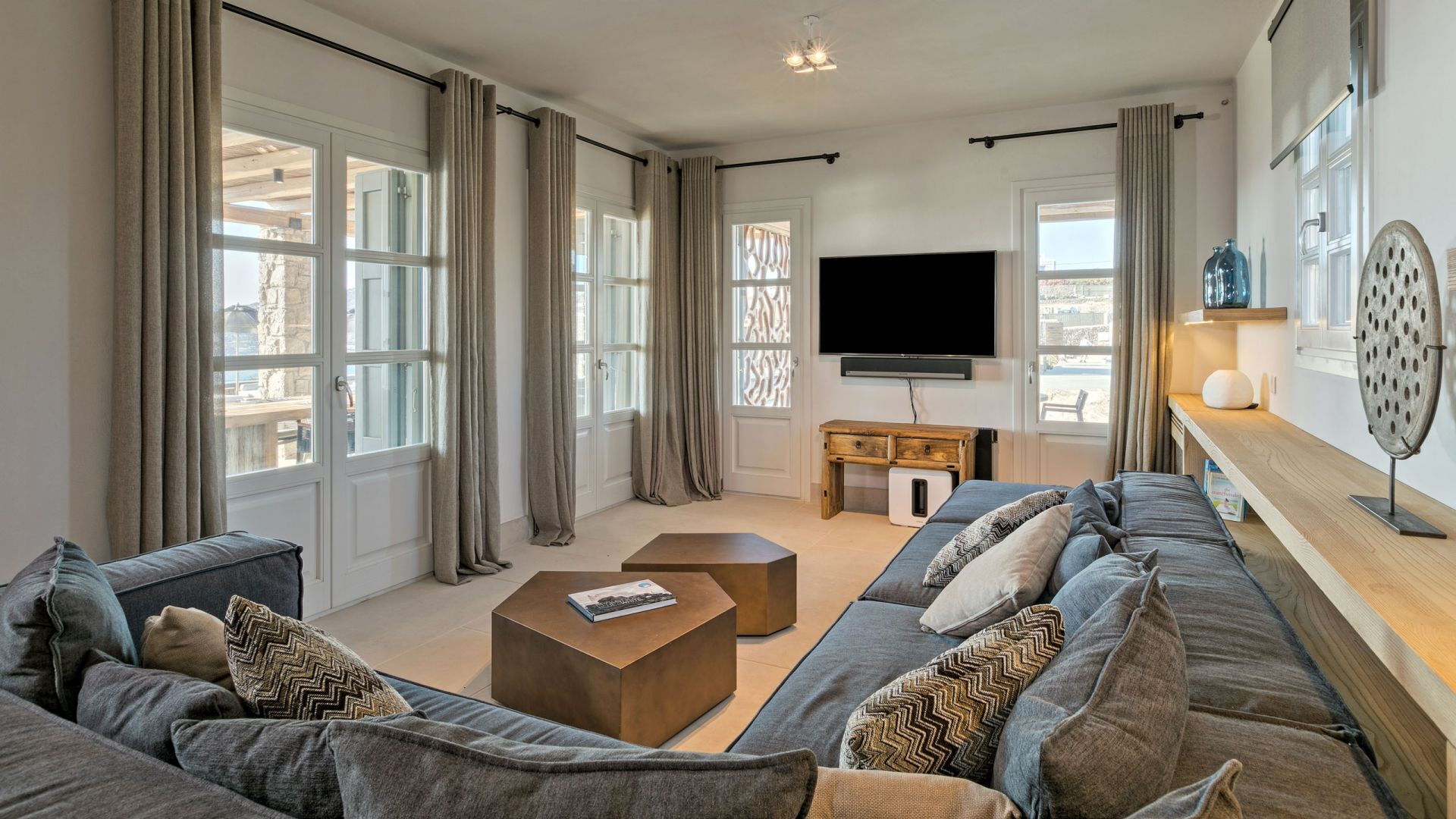 De locatie biedt gemakkelijke toegang tot de populairste zuidelijke stranden terwijl het ook een klein eindje rijden is naar het ongeëvenaarde nachtleven van Mykonos-stad. Trouw aan de zomerse uitstraling van de villa zijn de buitenruimtes ontworpen om de hele dag comfortabel van te genieten. Ligstoelen, bedden in cabanastijl, zomerbanken, kussens en poefs omringen het grote privézwembad.