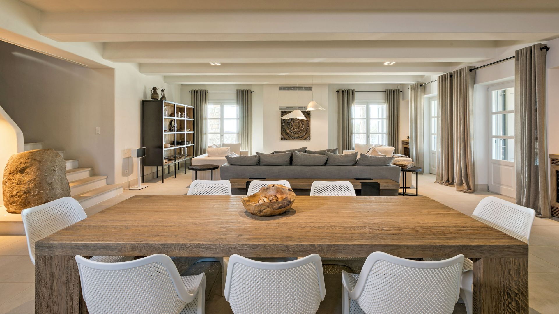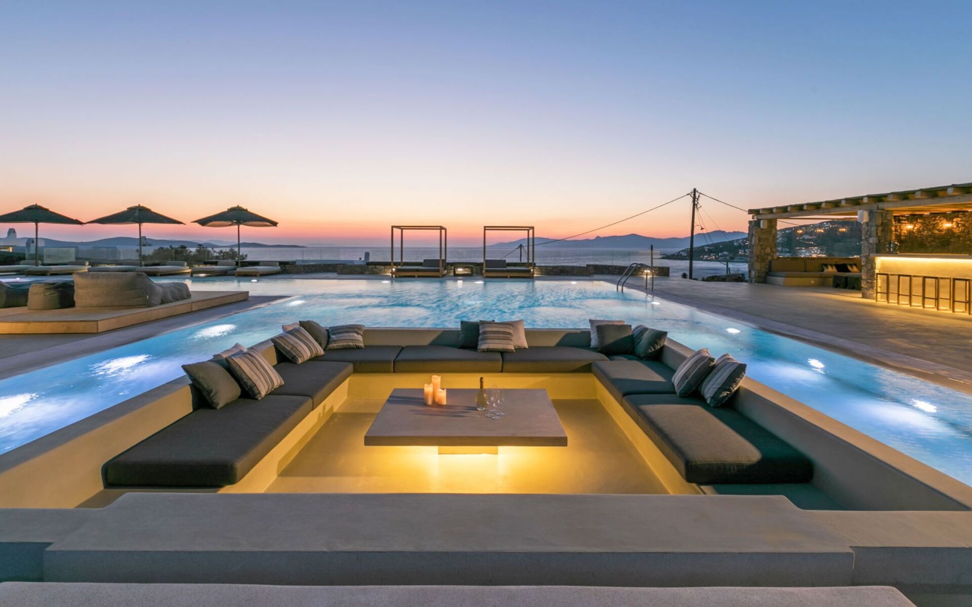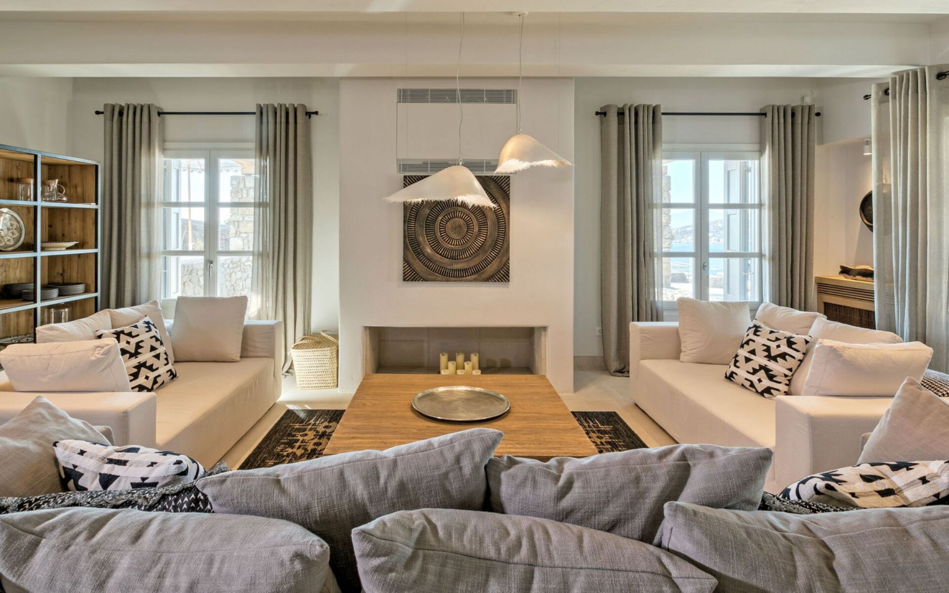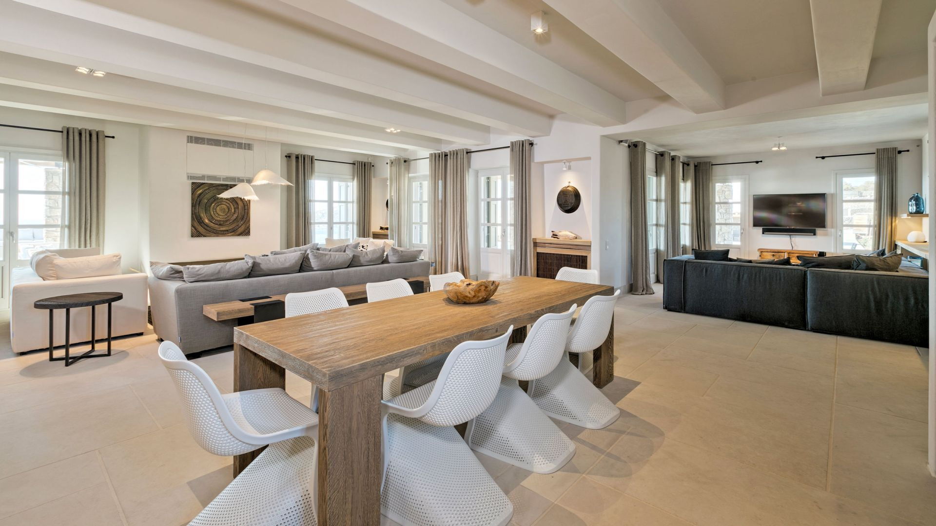 De locatie biedt gemakkelijke toegang tot de populairste zuidelijke stranden terwijl het ook een klein eindje rijden is naar het ongeëvenaarde nachtleven van Mykonos-stad. Trouw aan de zomerse uitstraling van de villa zijn de buitenruimtes ontworpen om de hele dag comfortabel van te genieten. Ligstoelen, bedden in cabanastijl, zomerbanken, kussens en poefs omringen het grote privézwembad.