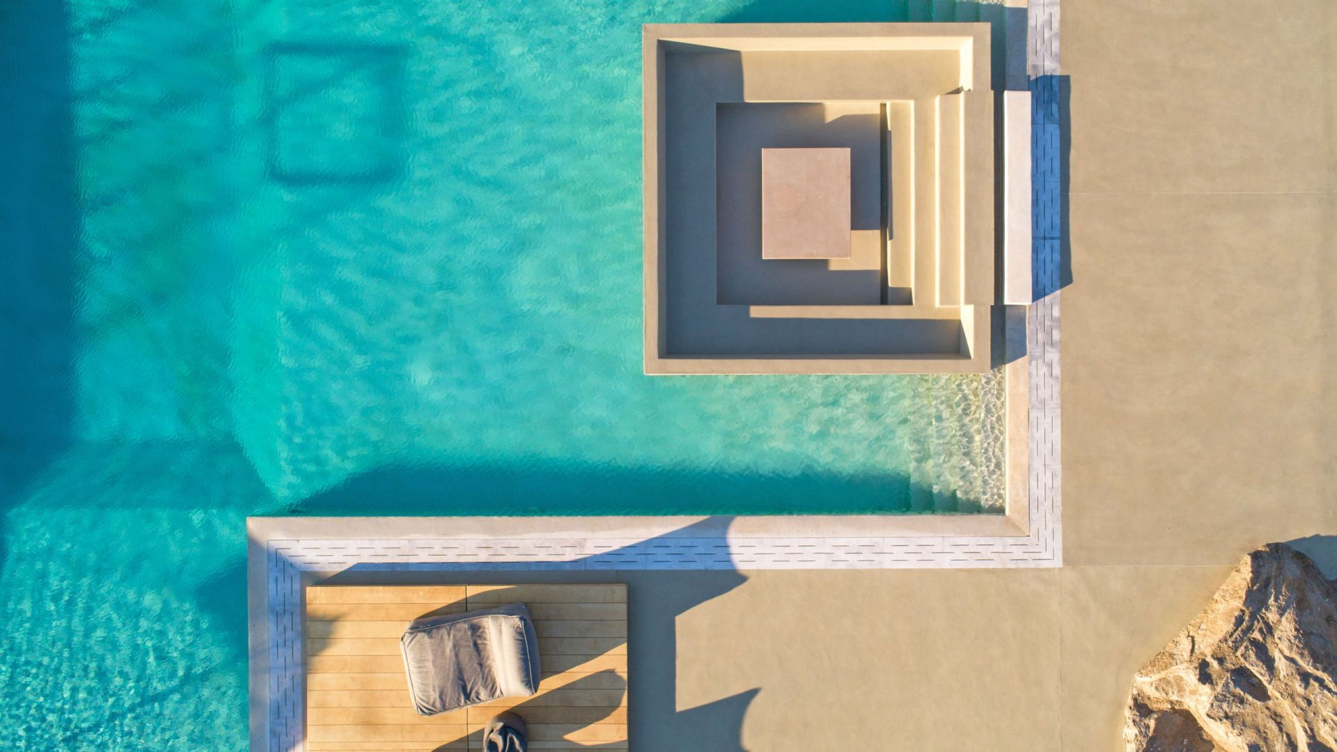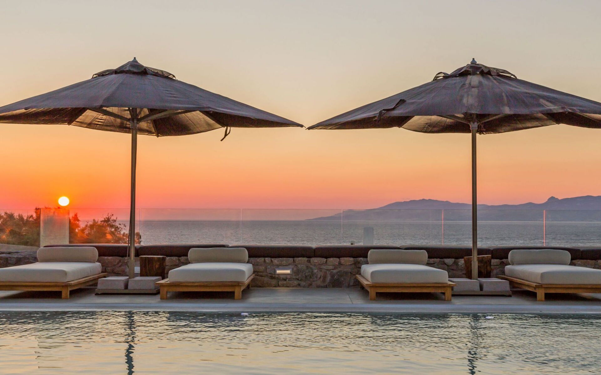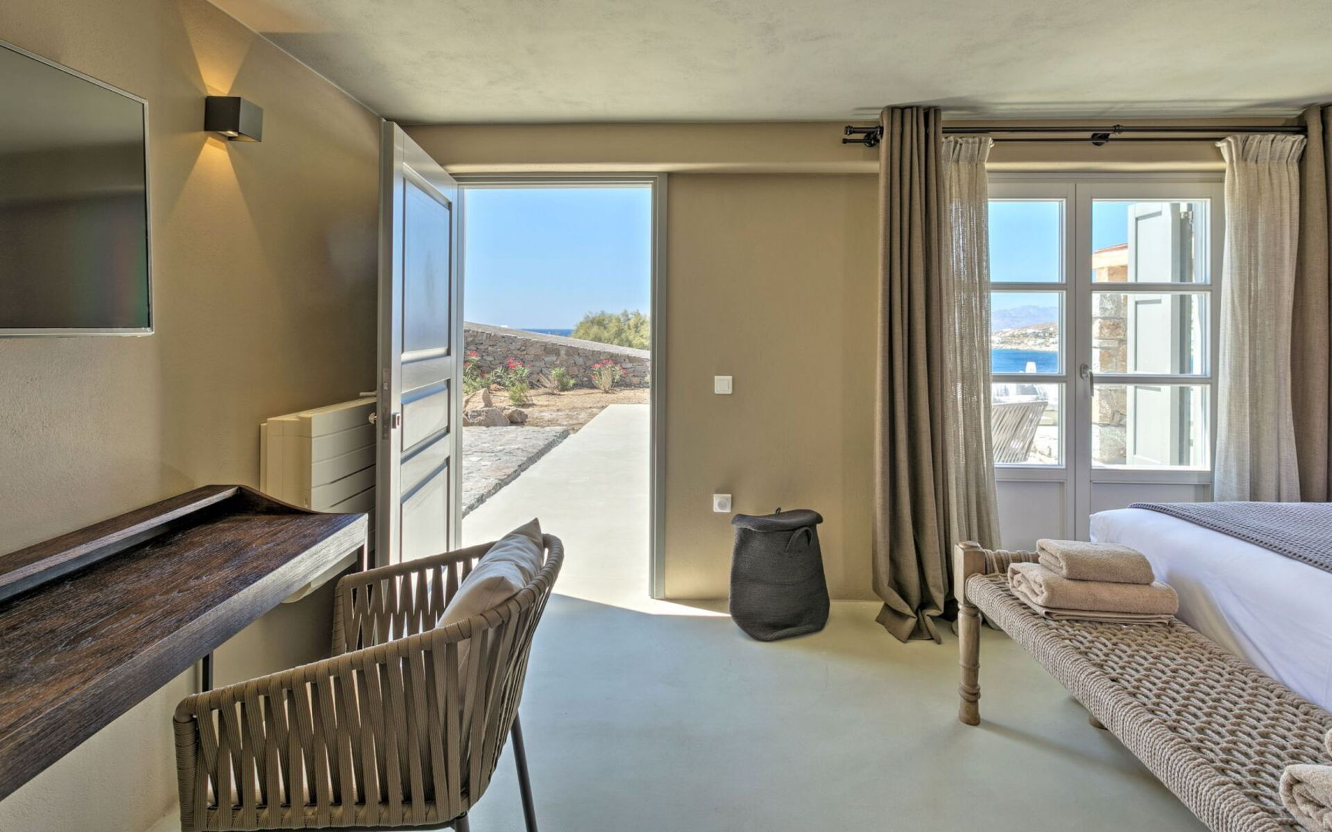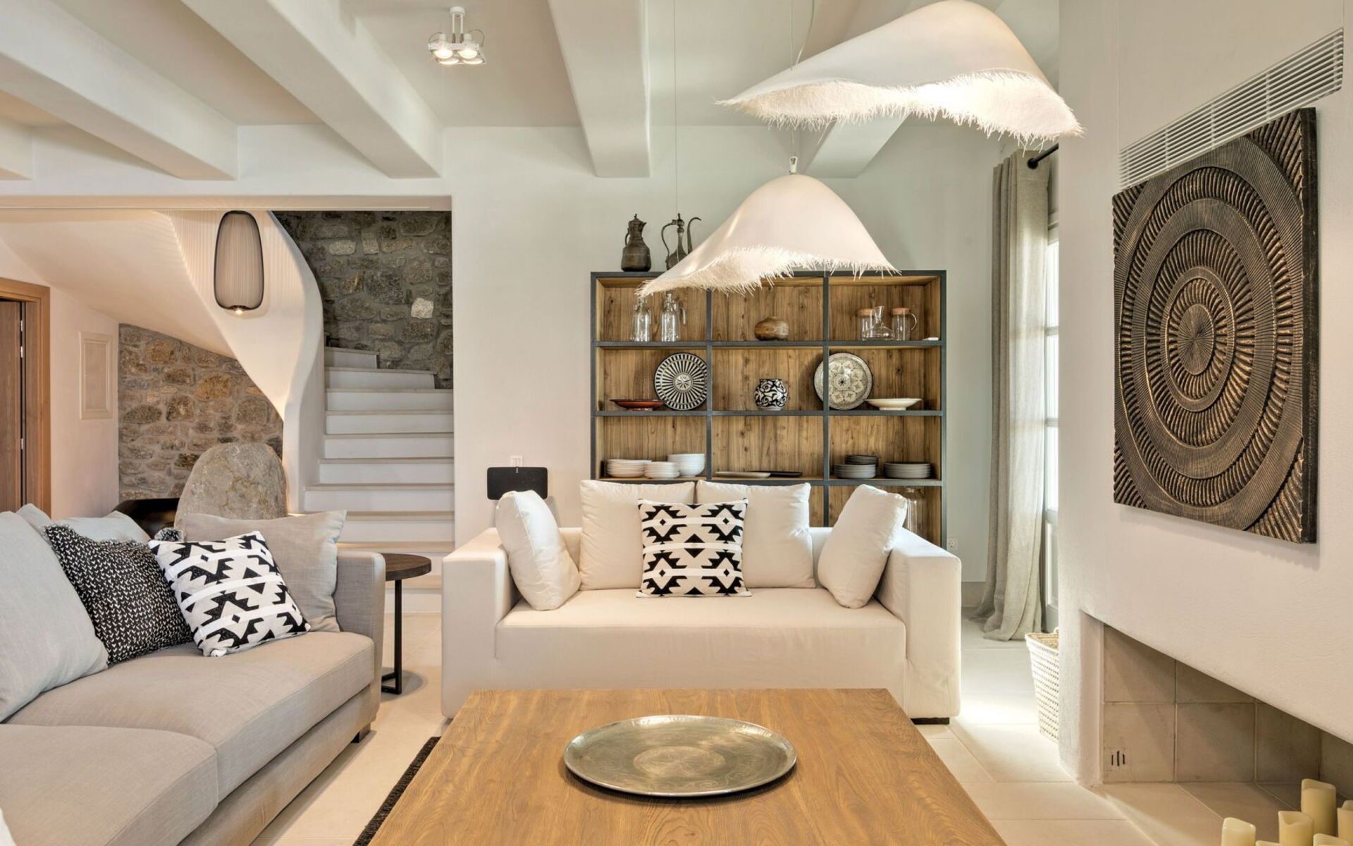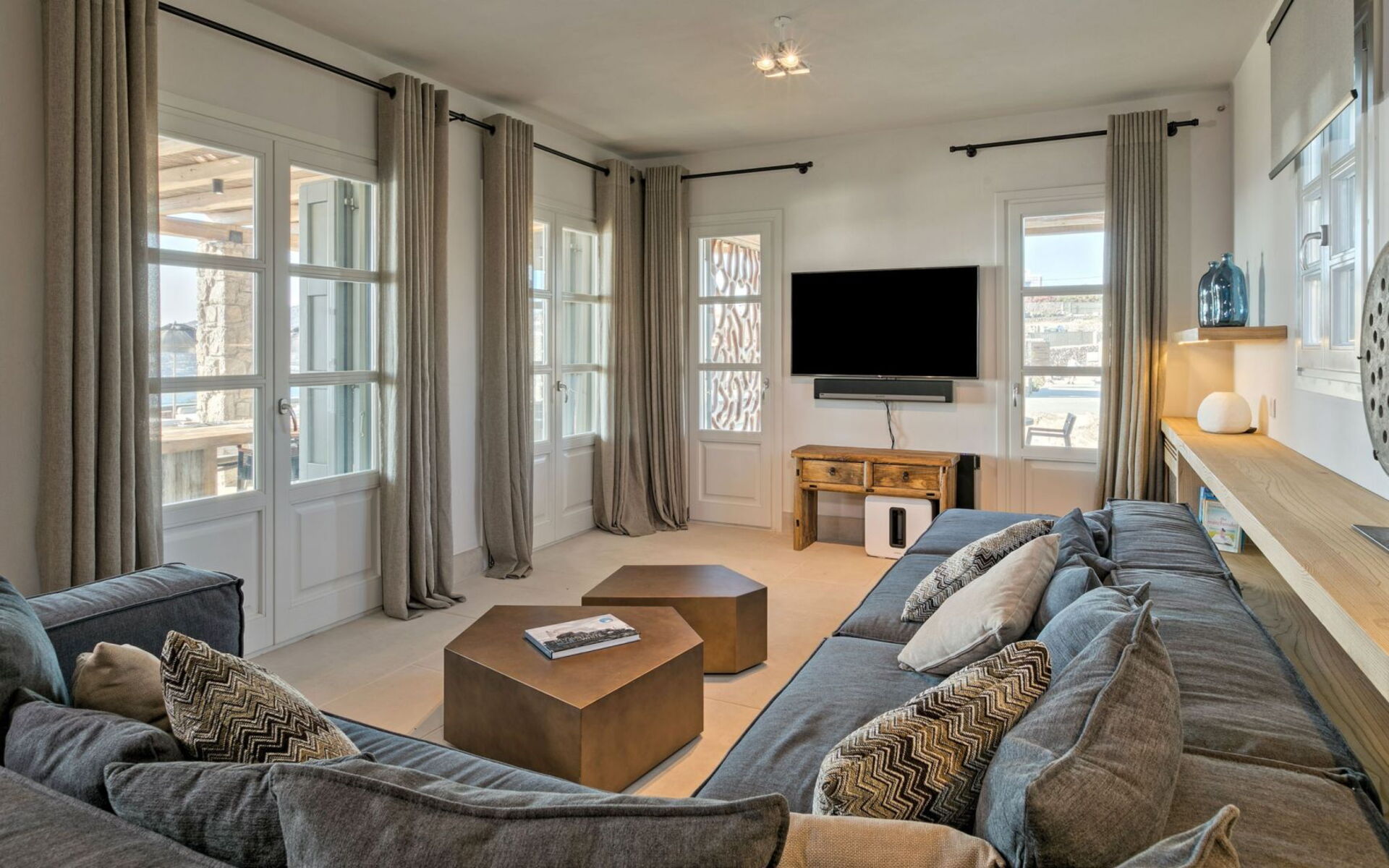 De locatie biedt gemakkelijke toegang tot de populairste zuidelijke stranden terwijl het ook een klein eindje rijden is naar het ongeëvenaarde nachtleven van Mykonos-stad. Trouw aan de zomerse uitstraling van de villa zijn de buitenruimtes ontworpen om de hele dag comfortabel van te genieten. Ligstoelen, bedden in cabanastijl, zomerbanken, kussens en poefs omringen het grote privézwembad.