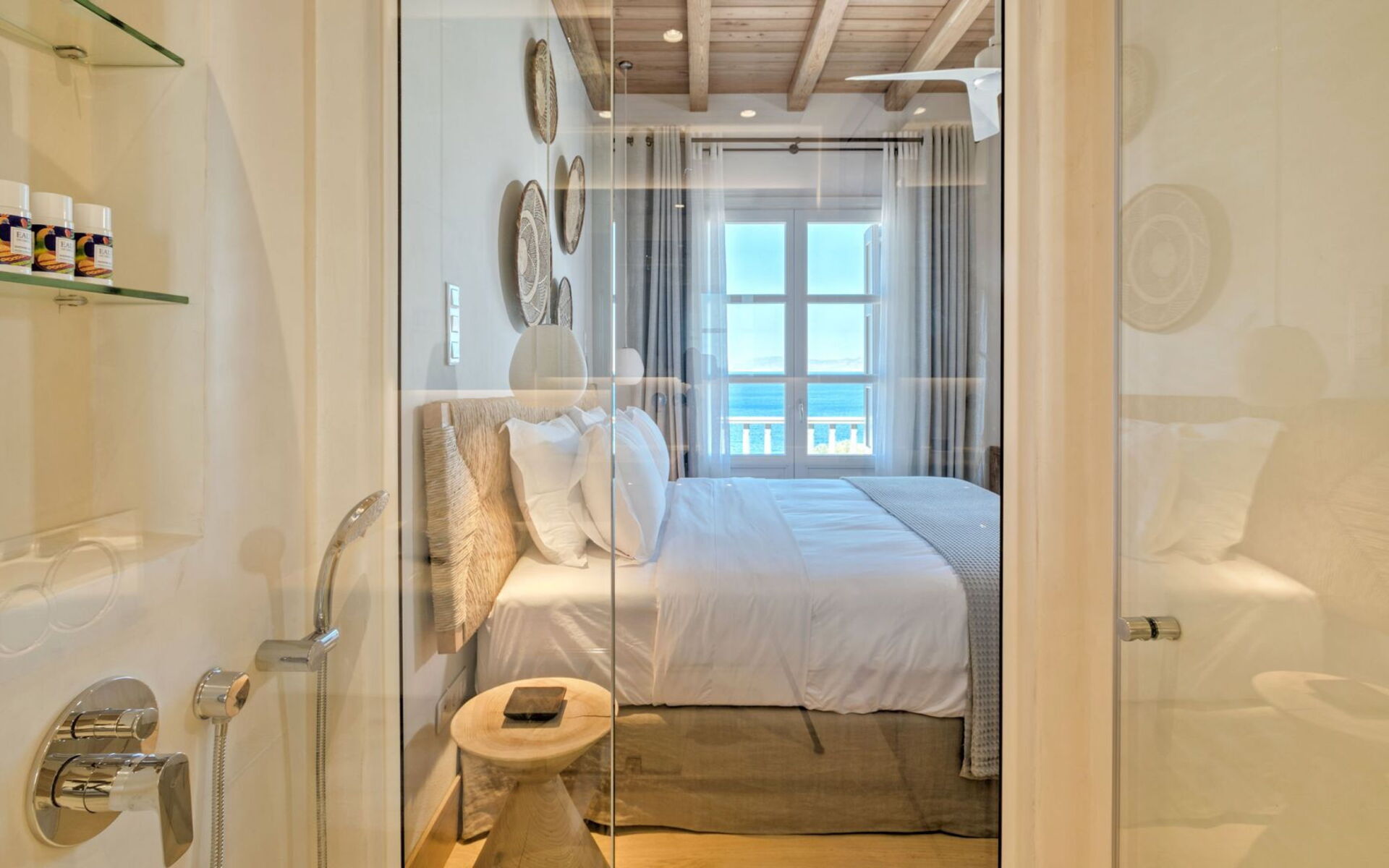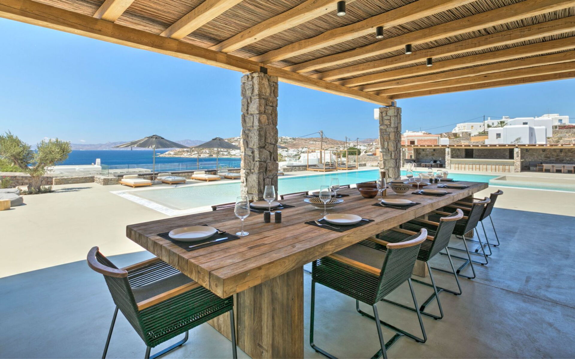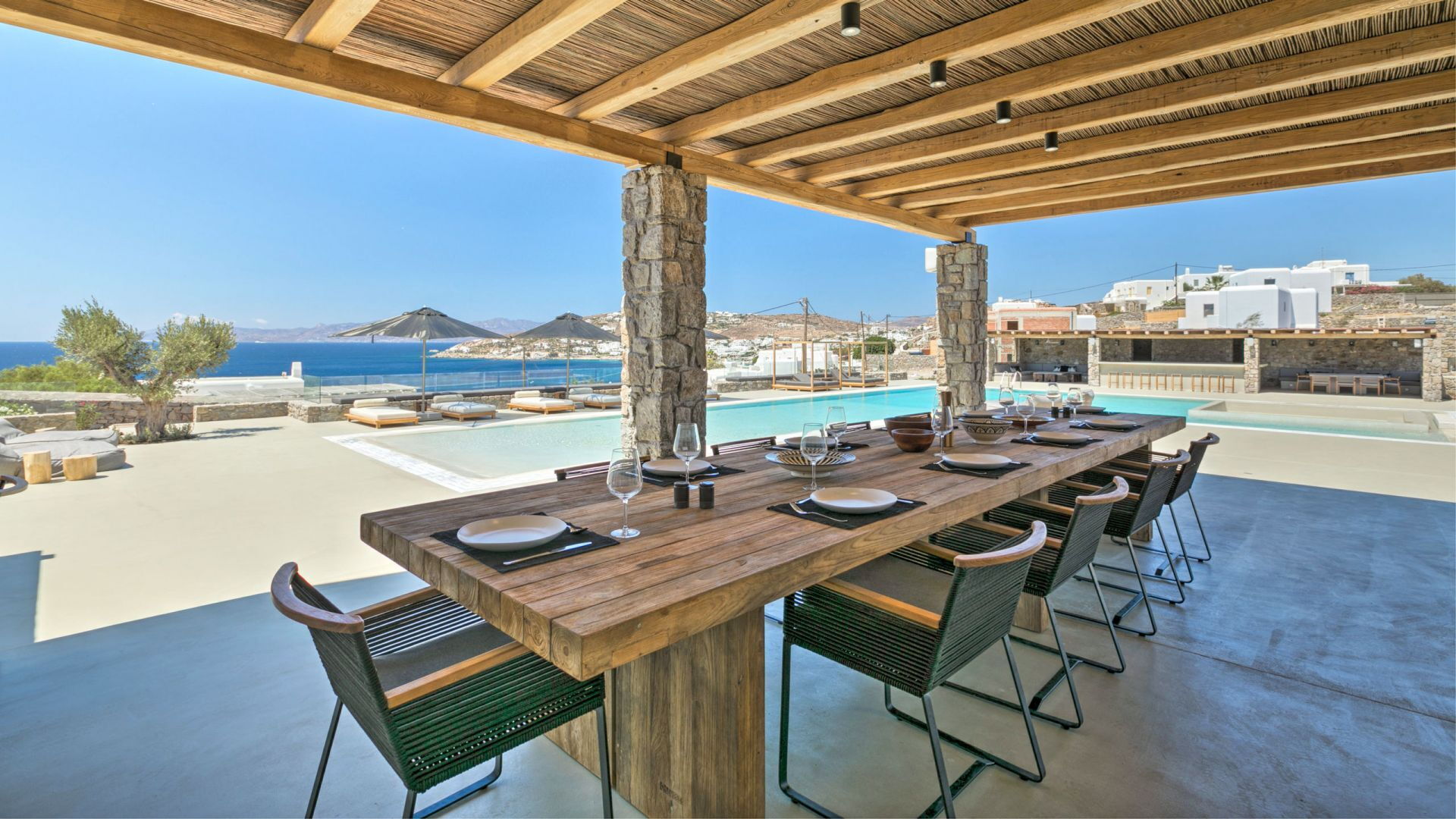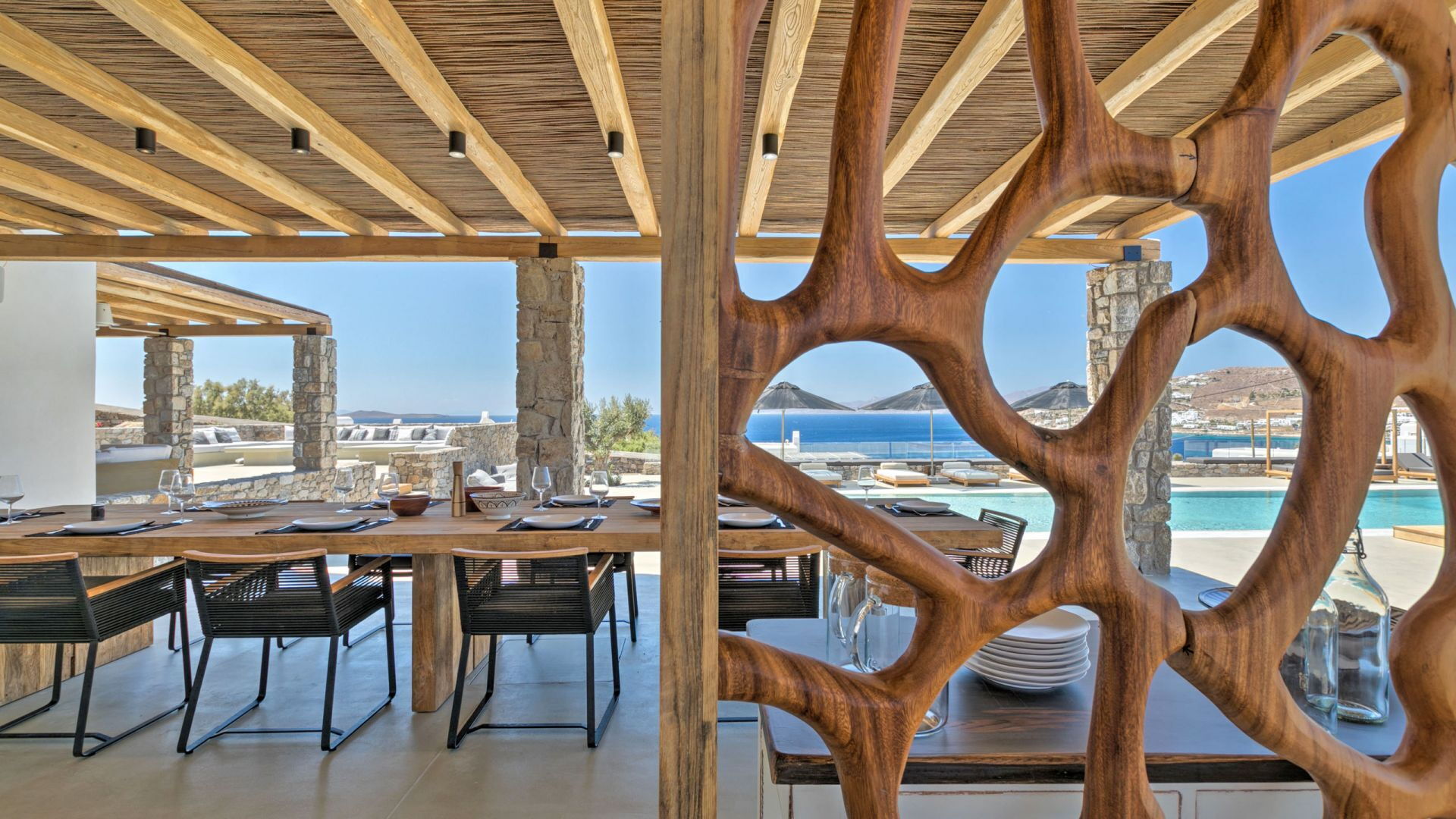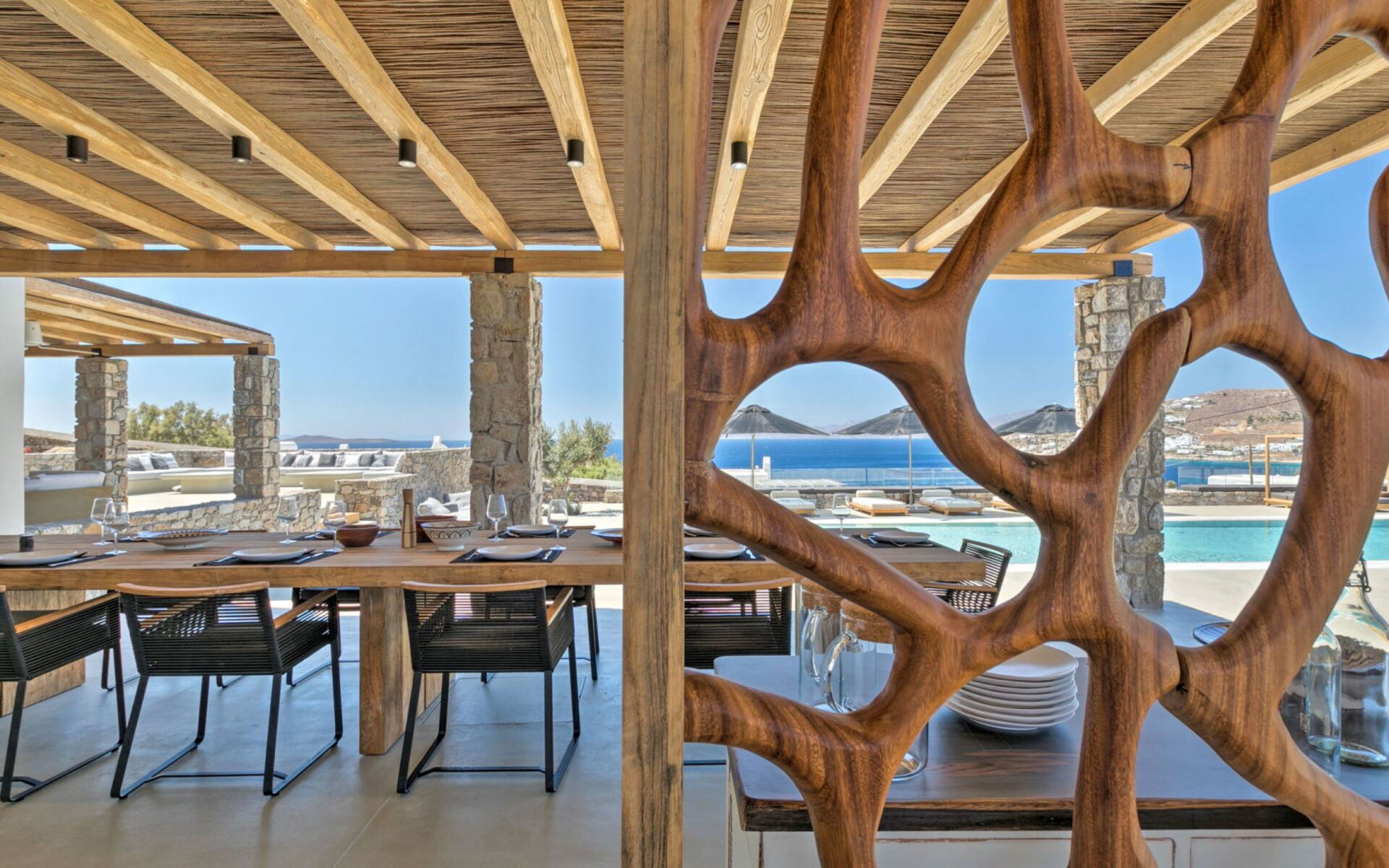 Pergola's strekken zich uit over twee verschillende eettafels, een bar bij het zwembad en een loungehoek bij zonsondergang. Gasten worden echt verwend te midden van al deze elegante buitenvoorzieningen. Houten oppervlakken, etnische patronen en designmeubels onderscheiden het interieur van Delphine, terwijl de architectuur modern Cycladisch op zijn best is.