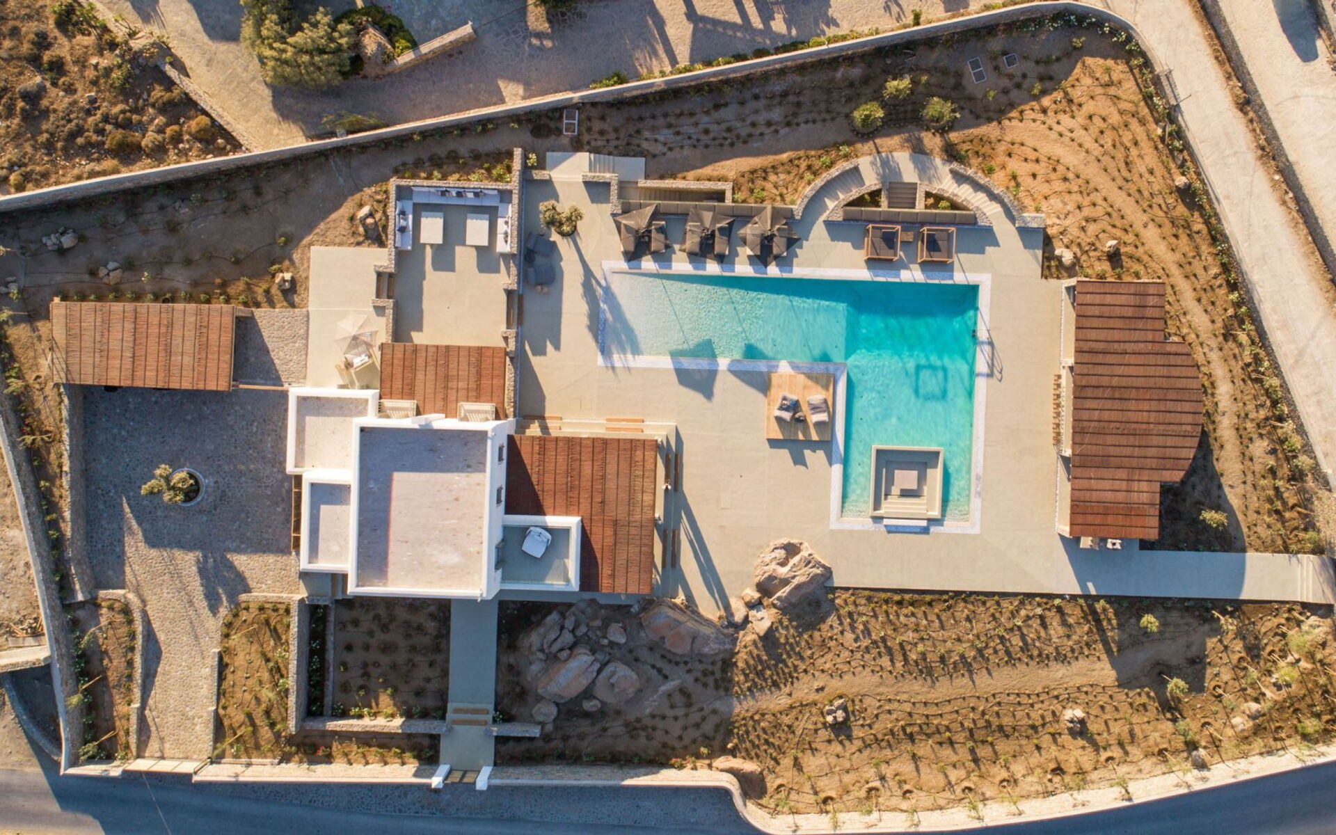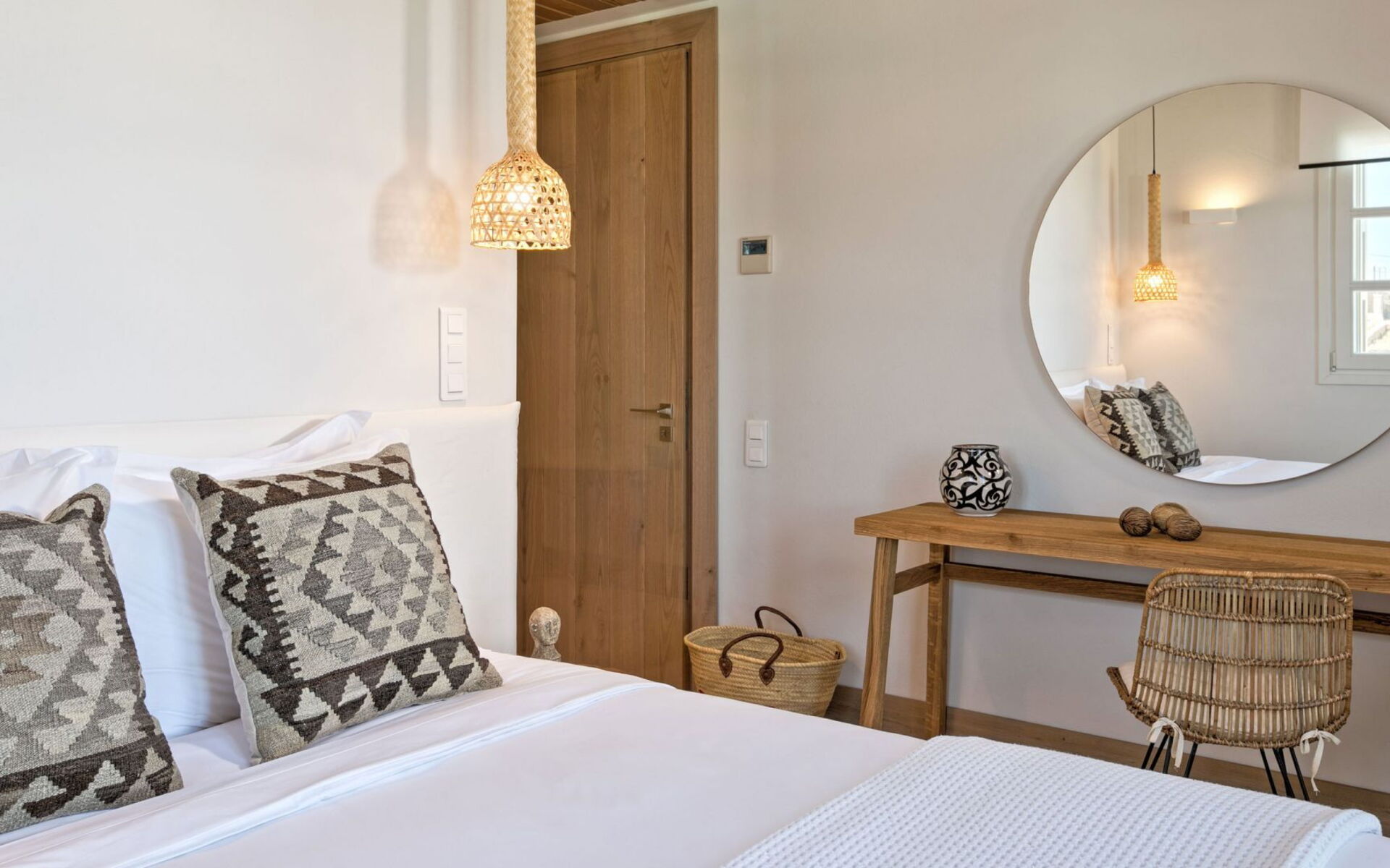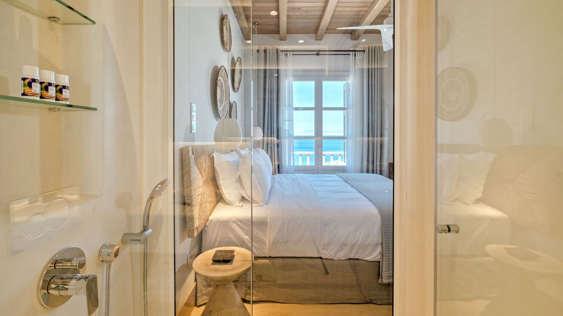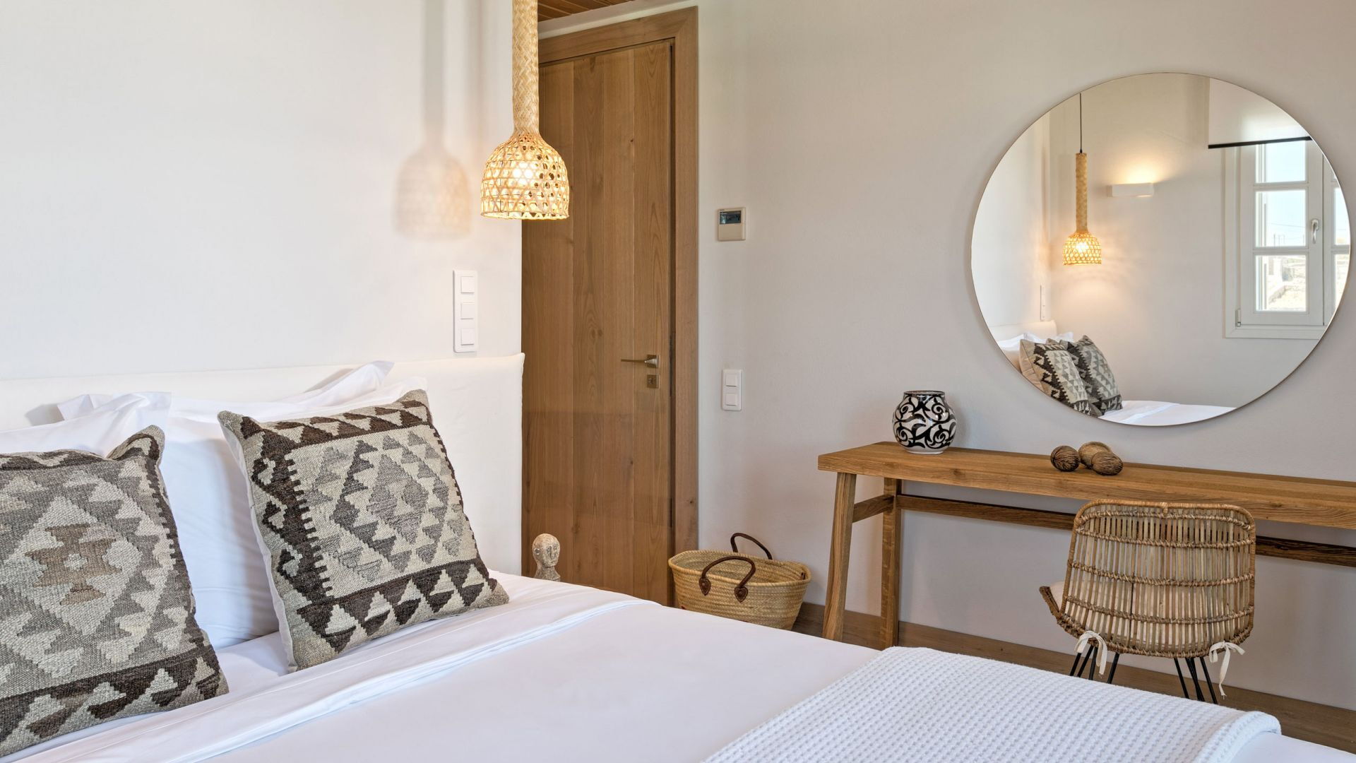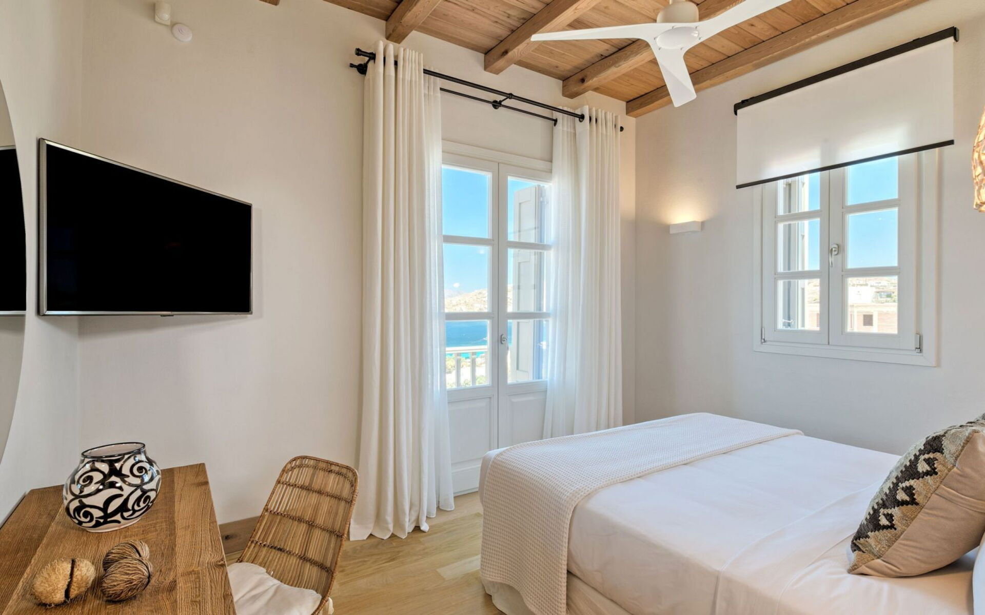 Pergola's strekken zich uit over twee verschillende eettafels, een bar bij het zwembad en een loungehoek bij zonsondergang. Gasten worden echt verwend te midden van al deze elegante buitenvoorzieningen. Houten oppervlakken, etnische patronen en designmeubels onderscheiden het interieur van Delphine, terwijl de architectuur modern Cycladisch op zijn best is.