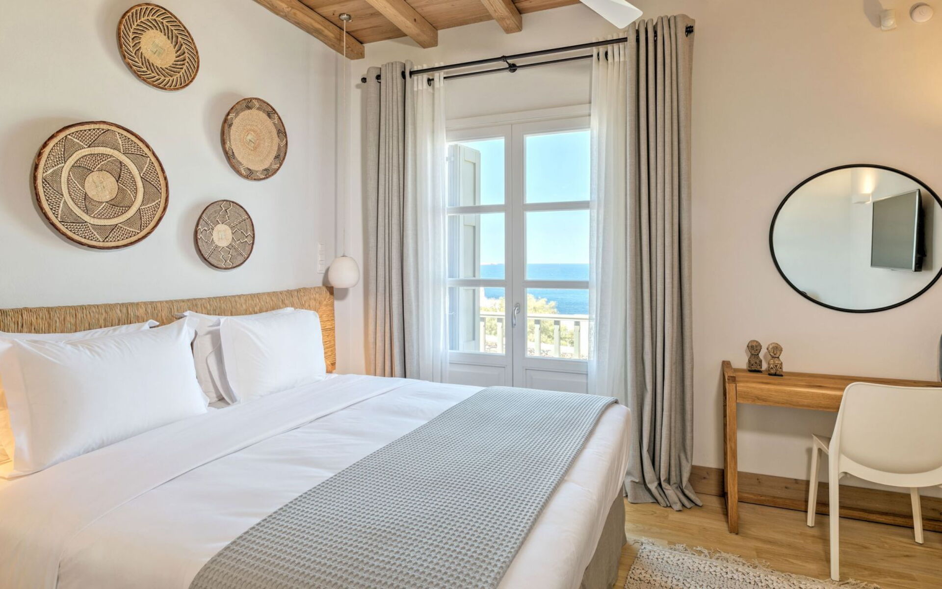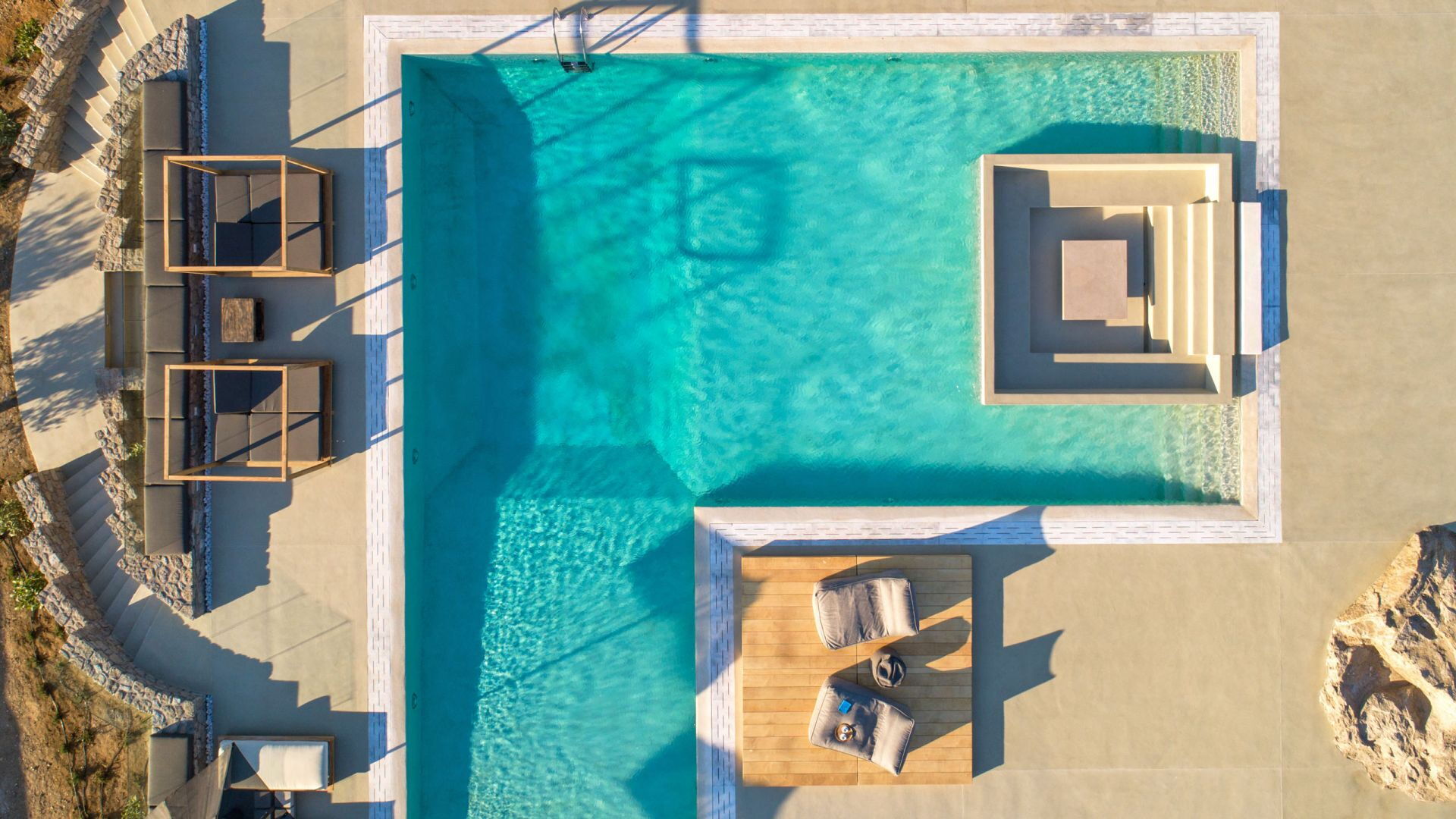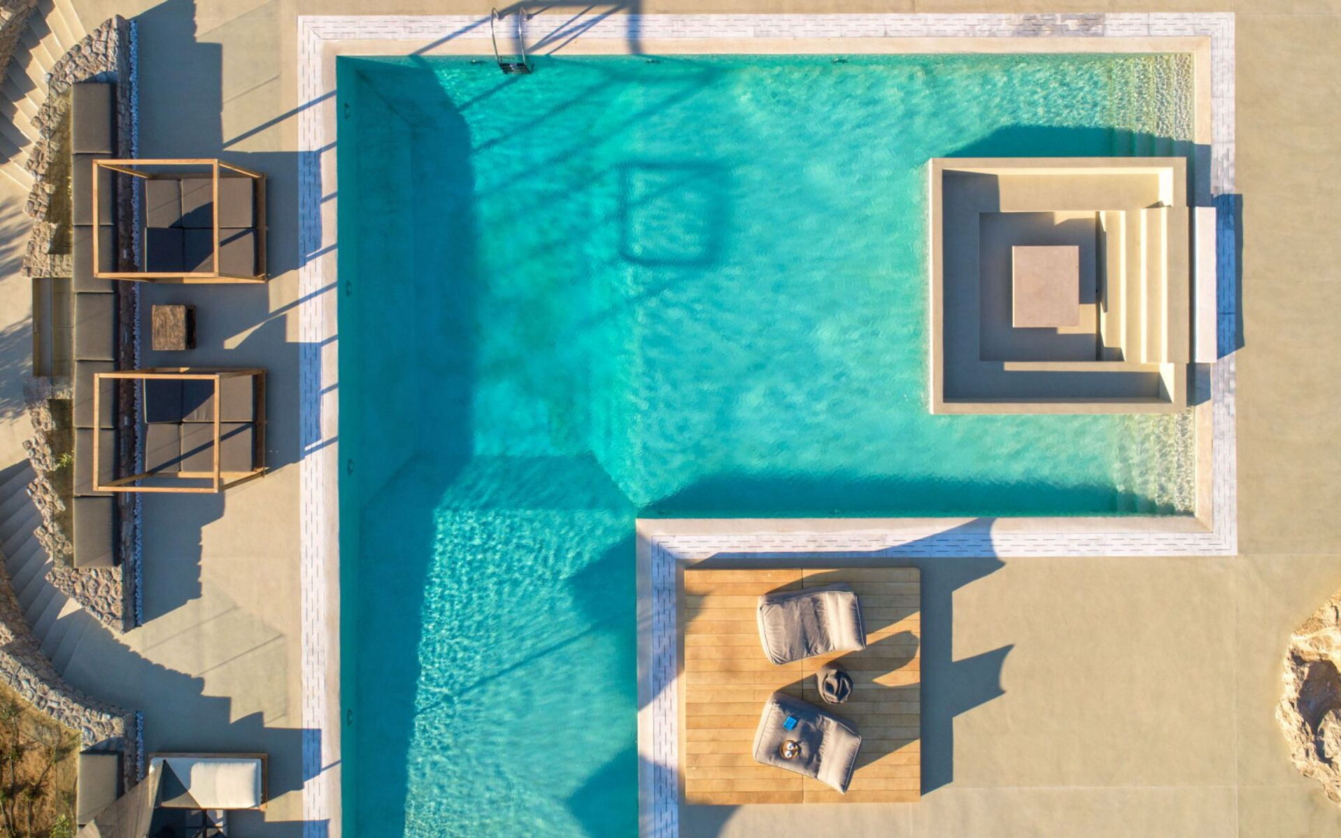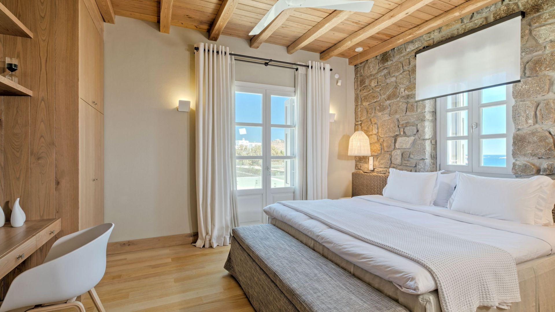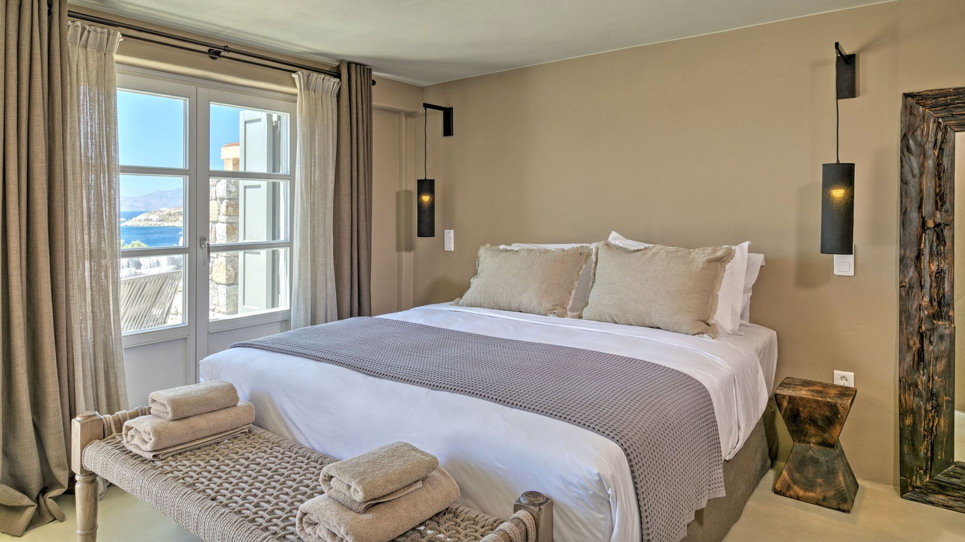Pergola's strekken zich uit over twee verschillende eettafels, een bar bij het zwembad en een loungehoek bij zonsondergang. Gasten worden echt verwend te midden van al deze elegante buitenvoorzieningen. Houten oppervlakken, etnische patronen en designmeubels onderscheiden het interieur van Delphine, terwijl de architectuur modern Cycladisch op zijn best is.