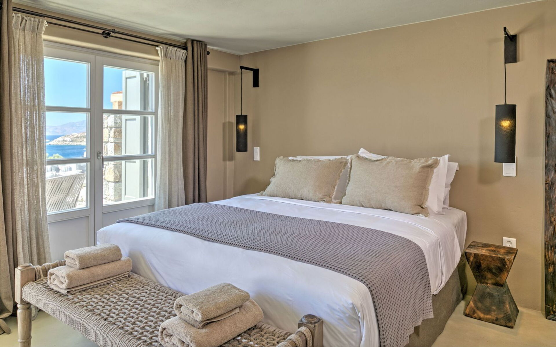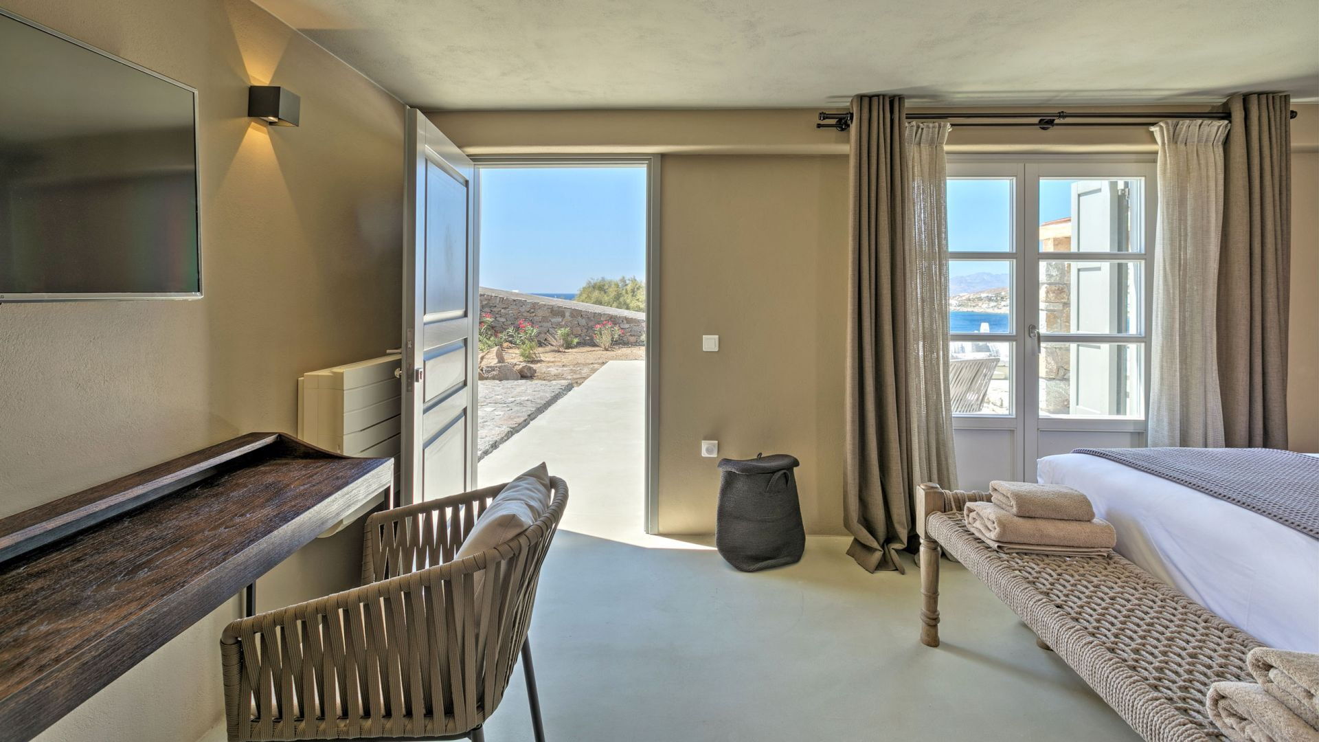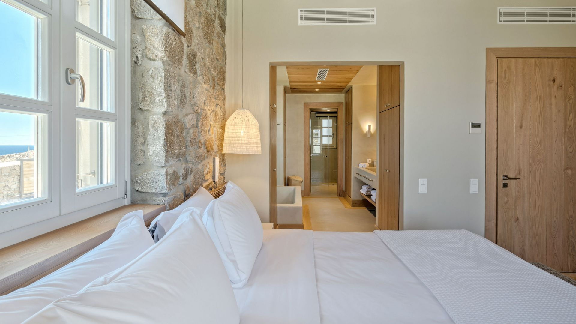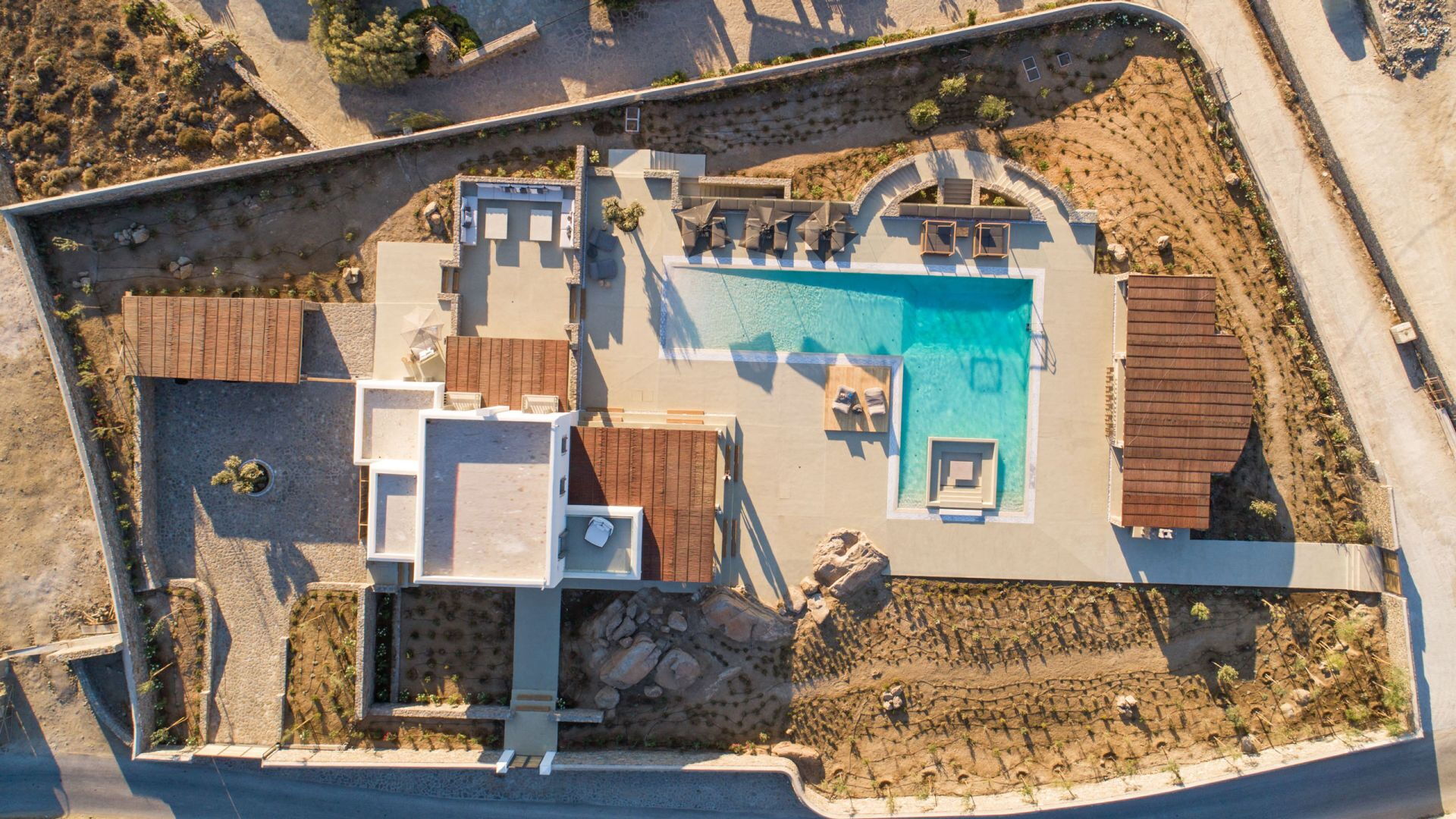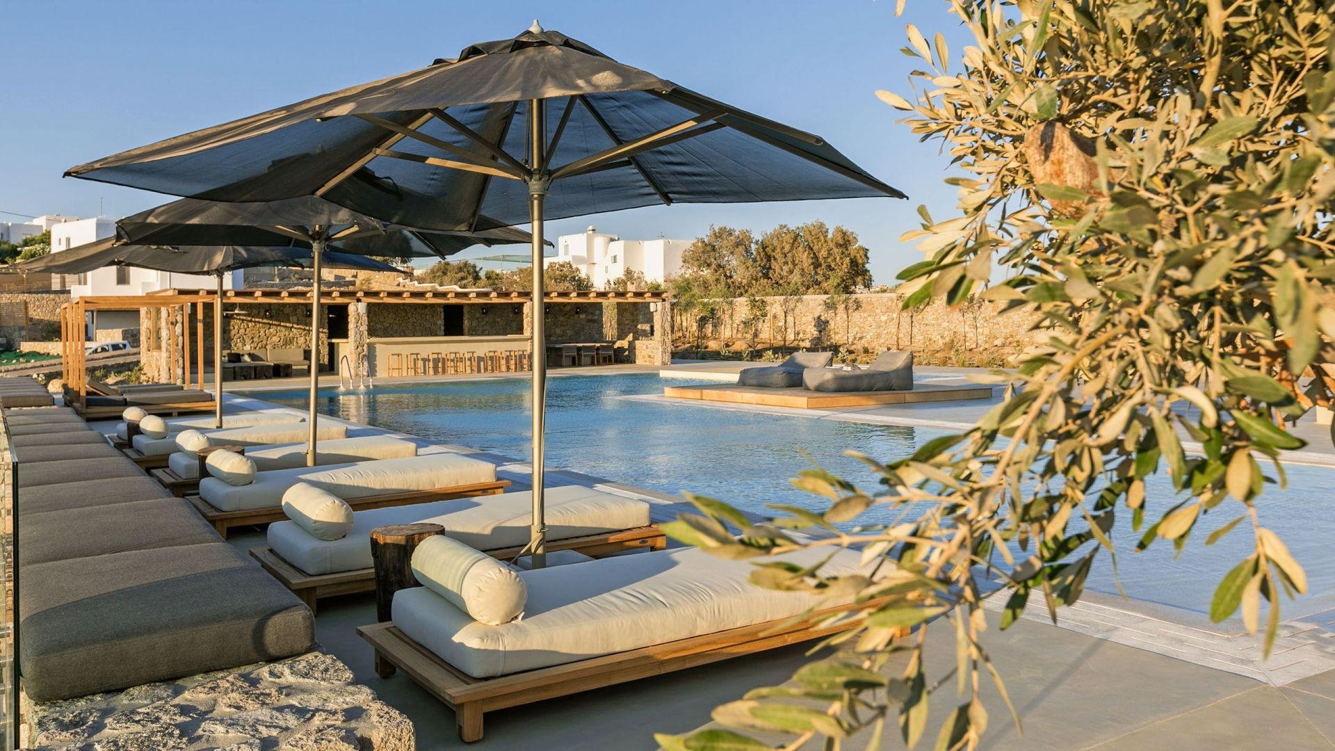Pergola's strekken zich uit over twee verschillende eettafels, een bar bij het zwembad en een loungehoek bij zonsondergang. Gasten worden echt verwend te midden van al deze elegante buitenvoorzieningen. Houten oppervlakken, etnische patronen en designmeubels onderscheiden het interieur van Delphine, terwijl de architectuur modern Cycladisch op zijn best is.