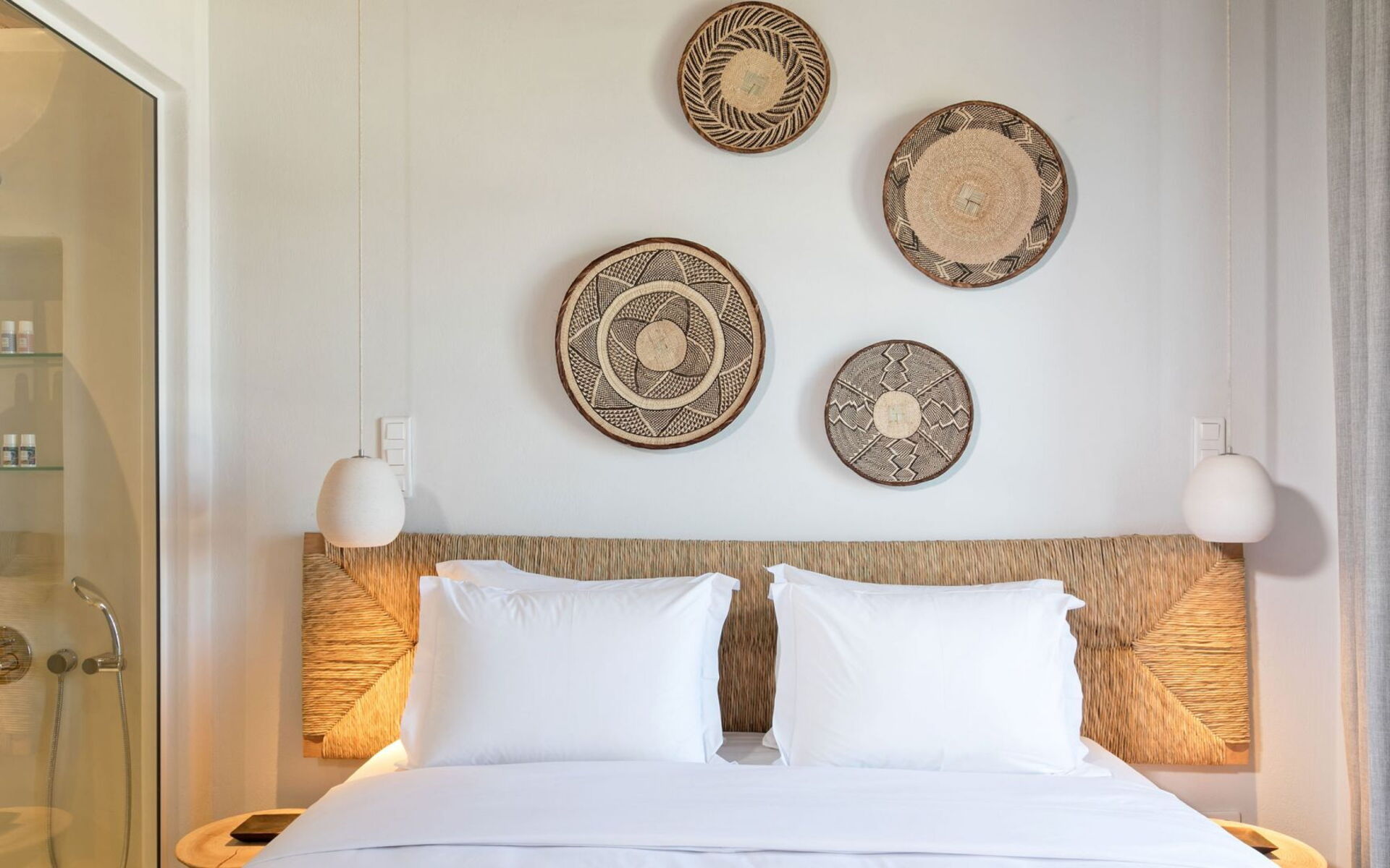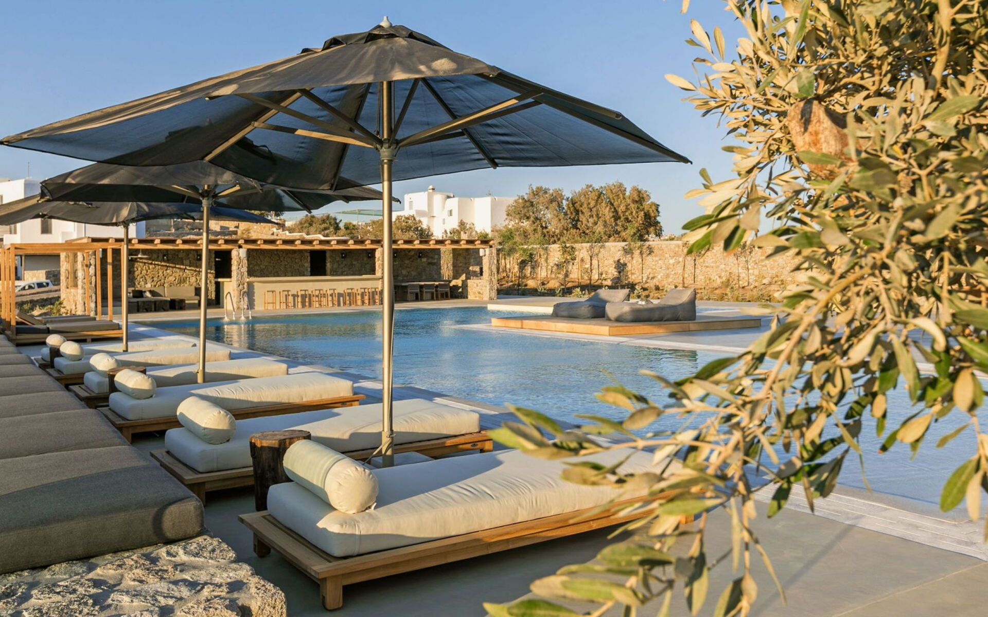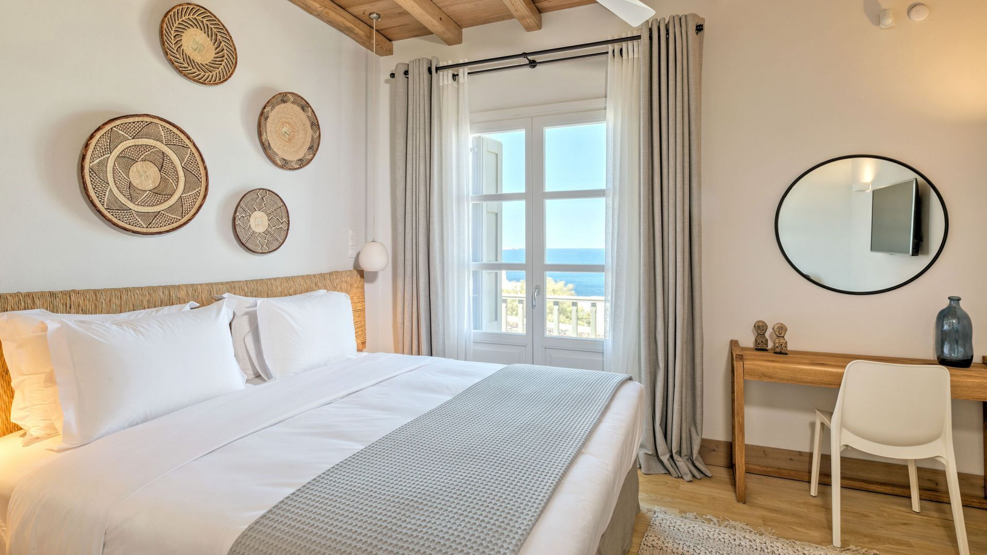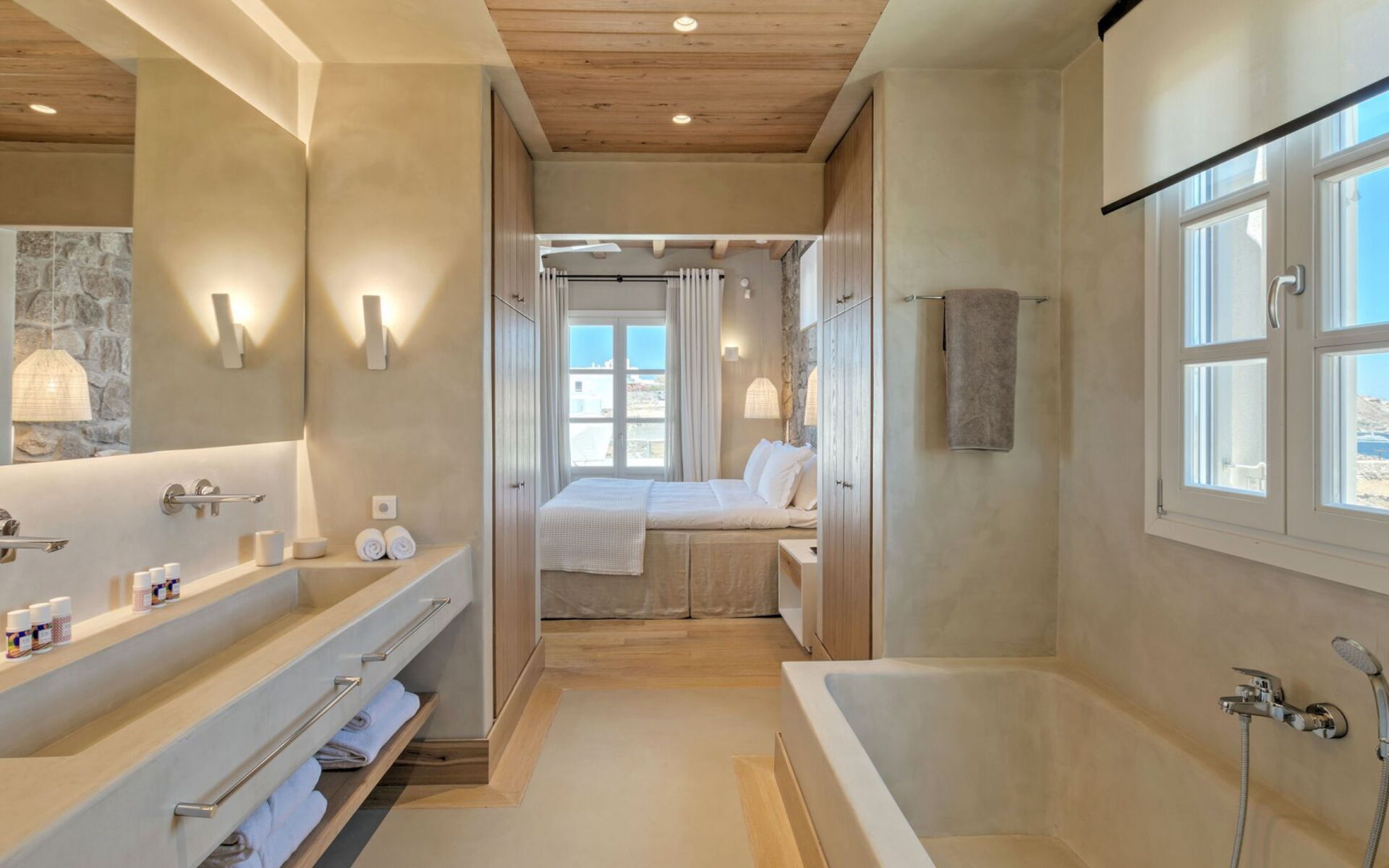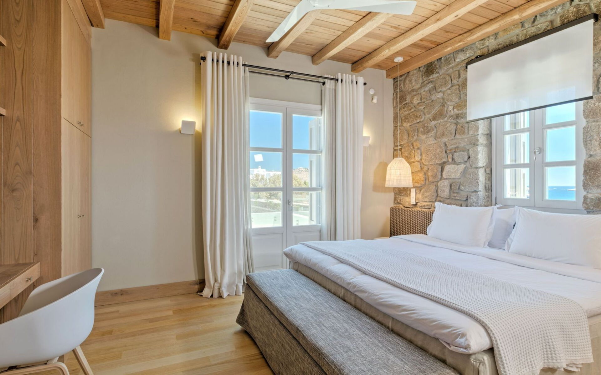 Pergola's strekken zich uit over twee verschillende eettafels, een bar bij het zwembad en een loungehoek bij zonsondergang. Gasten worden echt verwend te midden van al deze elegante buitenvoorzieningen. Houten oppervlakken, etnische patronen en designmeubels onderscheiden het interieur van Delphine, terwijl de architectuur modern Cycladisch op zijn best is.
