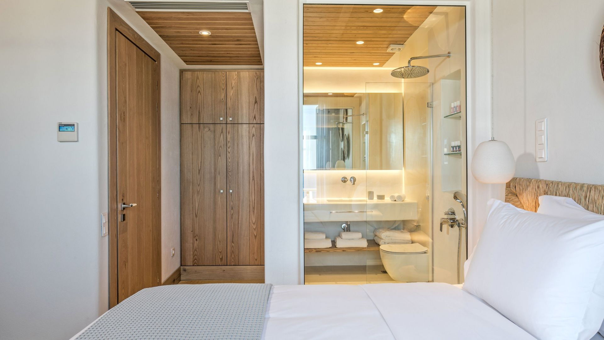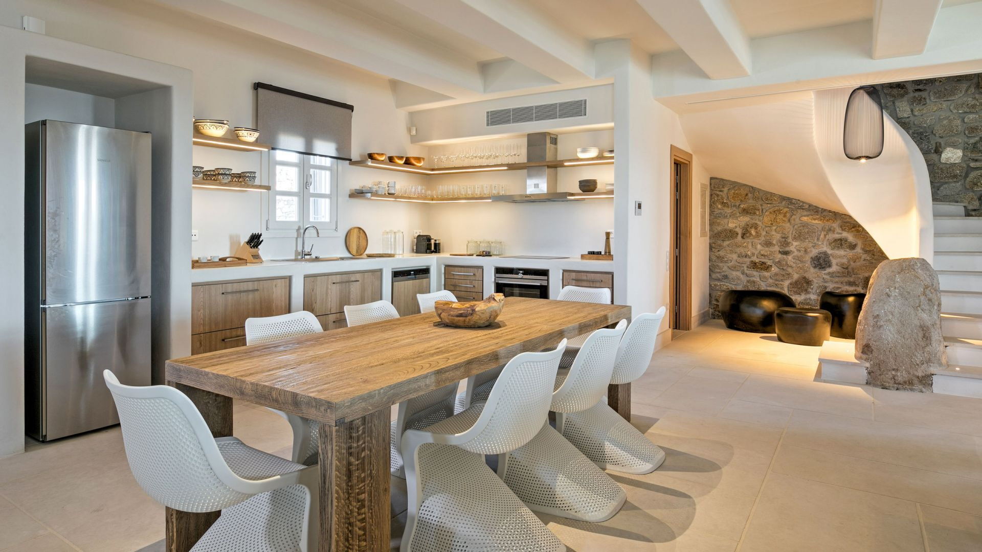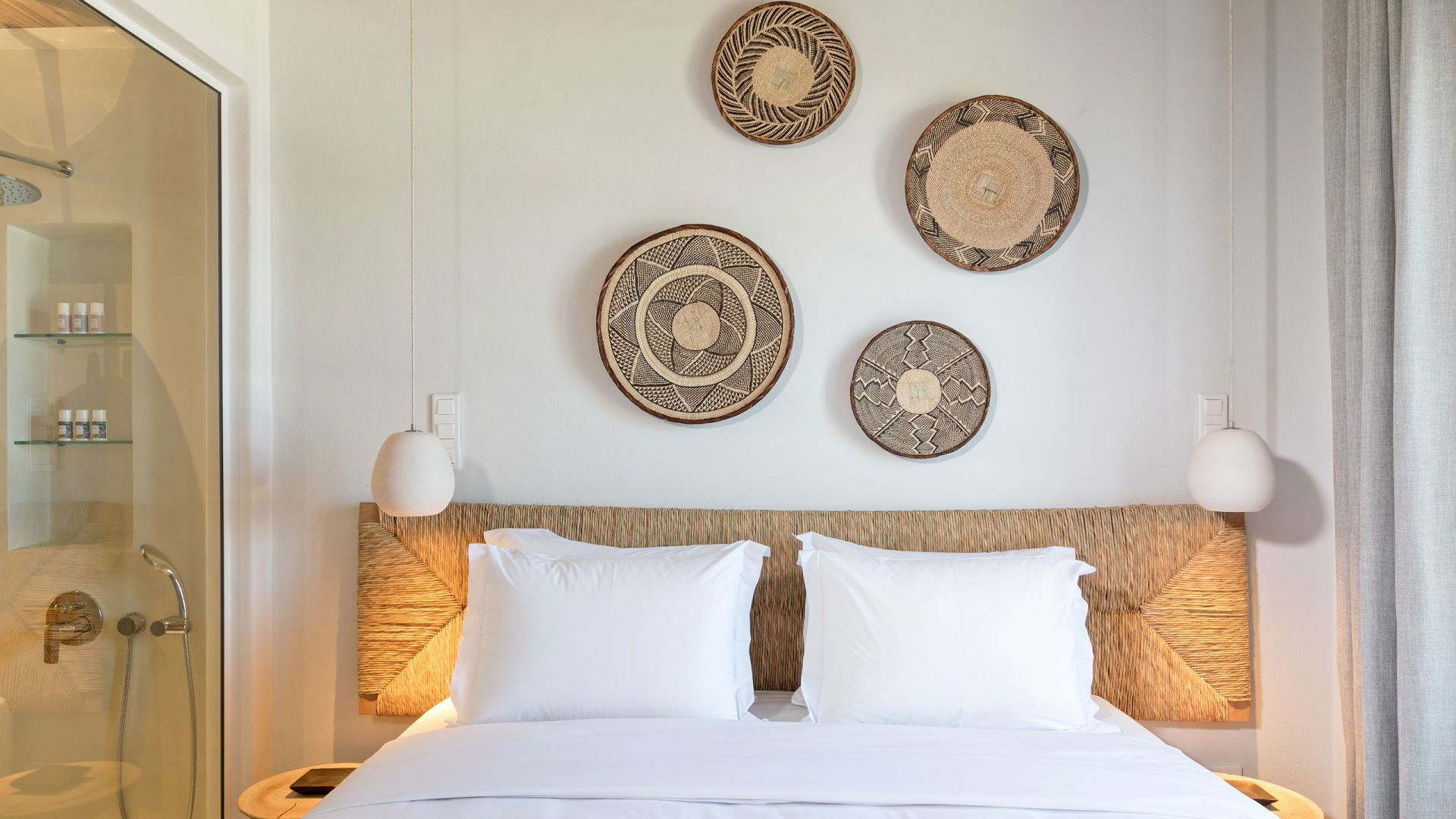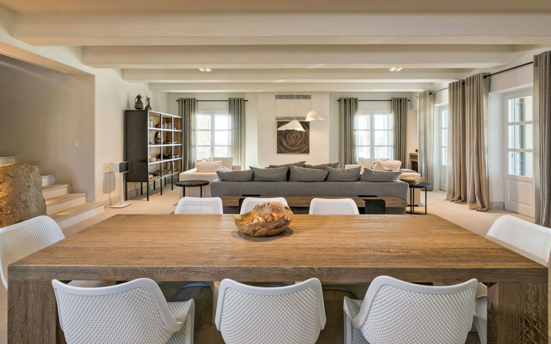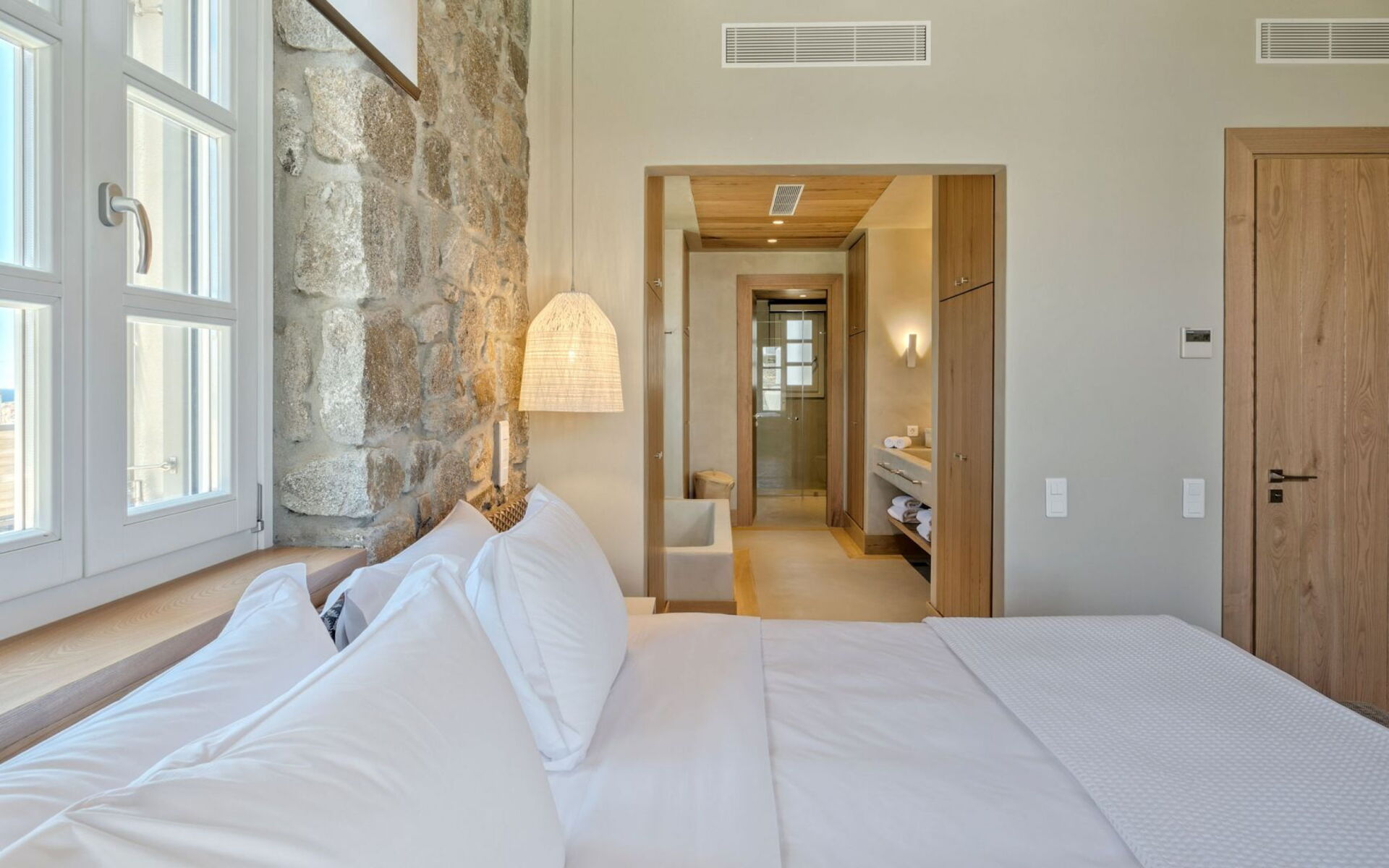 Pergola's strekken zich uit over twee verschillende eettafels, een bar bij het zwembad en een loungehoek bij zonsondergang. Gasten worden echt verwend te midden van al deze elegante buitenvoorzieningen. Houten oppervlakken, etnische patronen en designmeubels onderscheiden het interieur van Delphine, terwijl de architectuur modern Cycladisch op zijn best is.