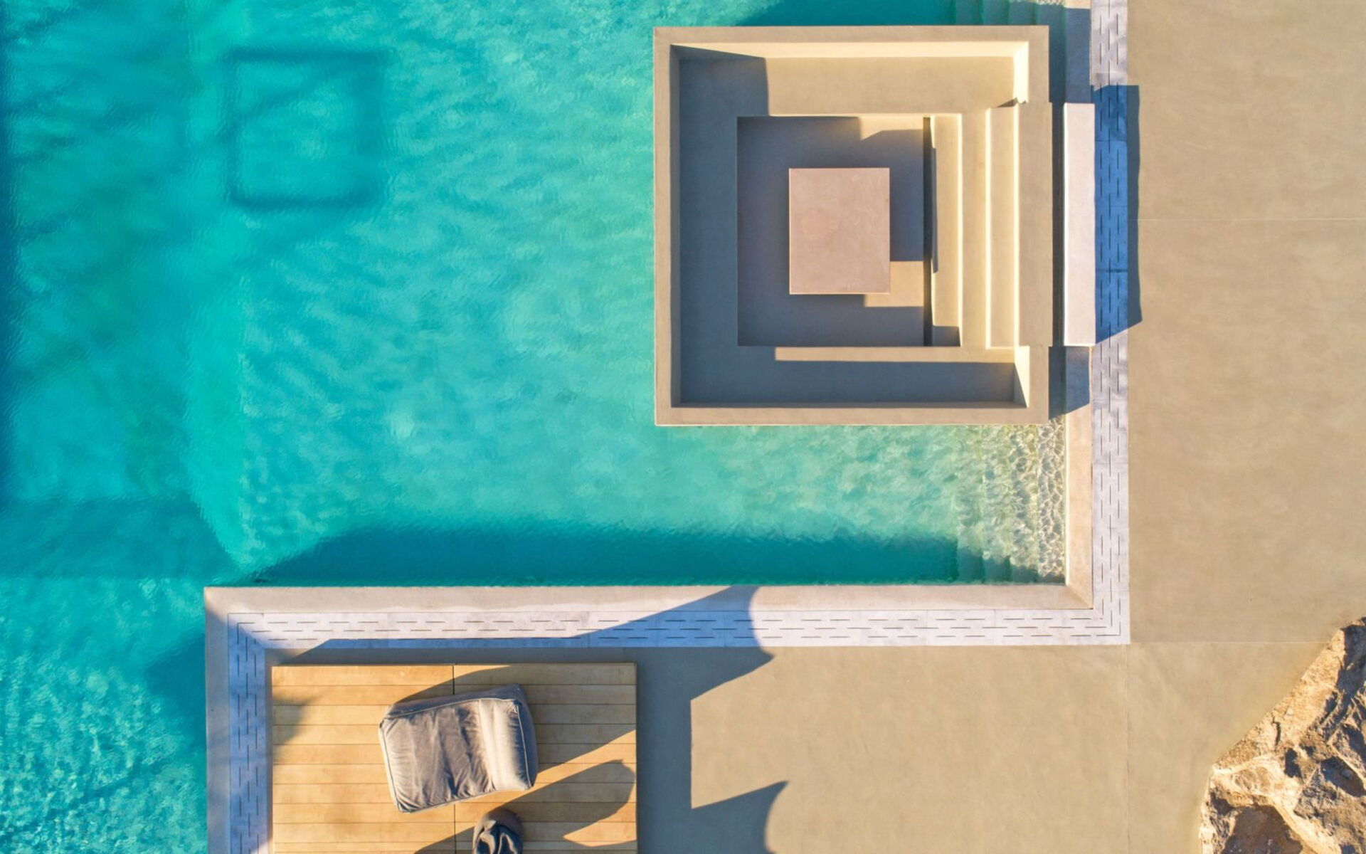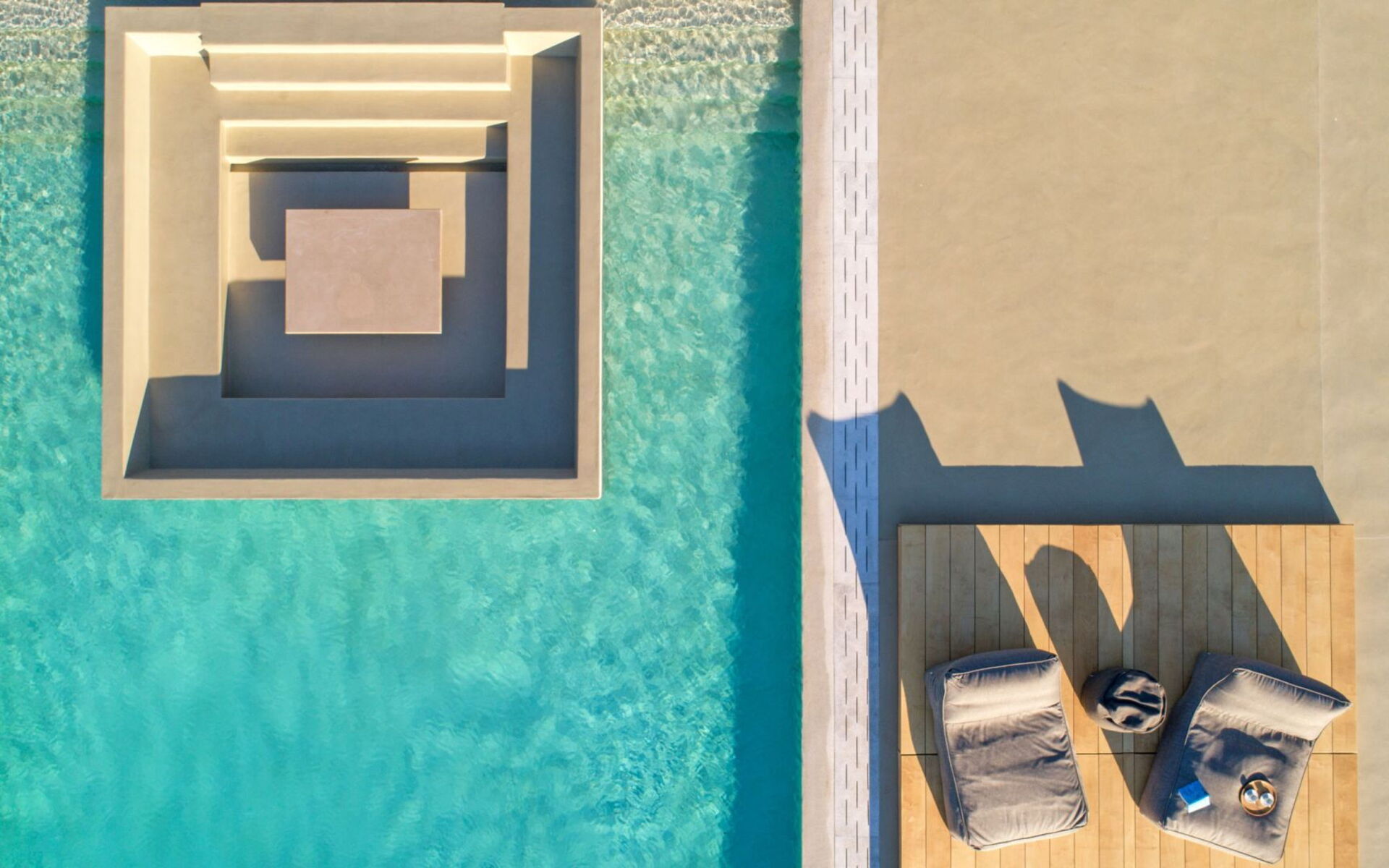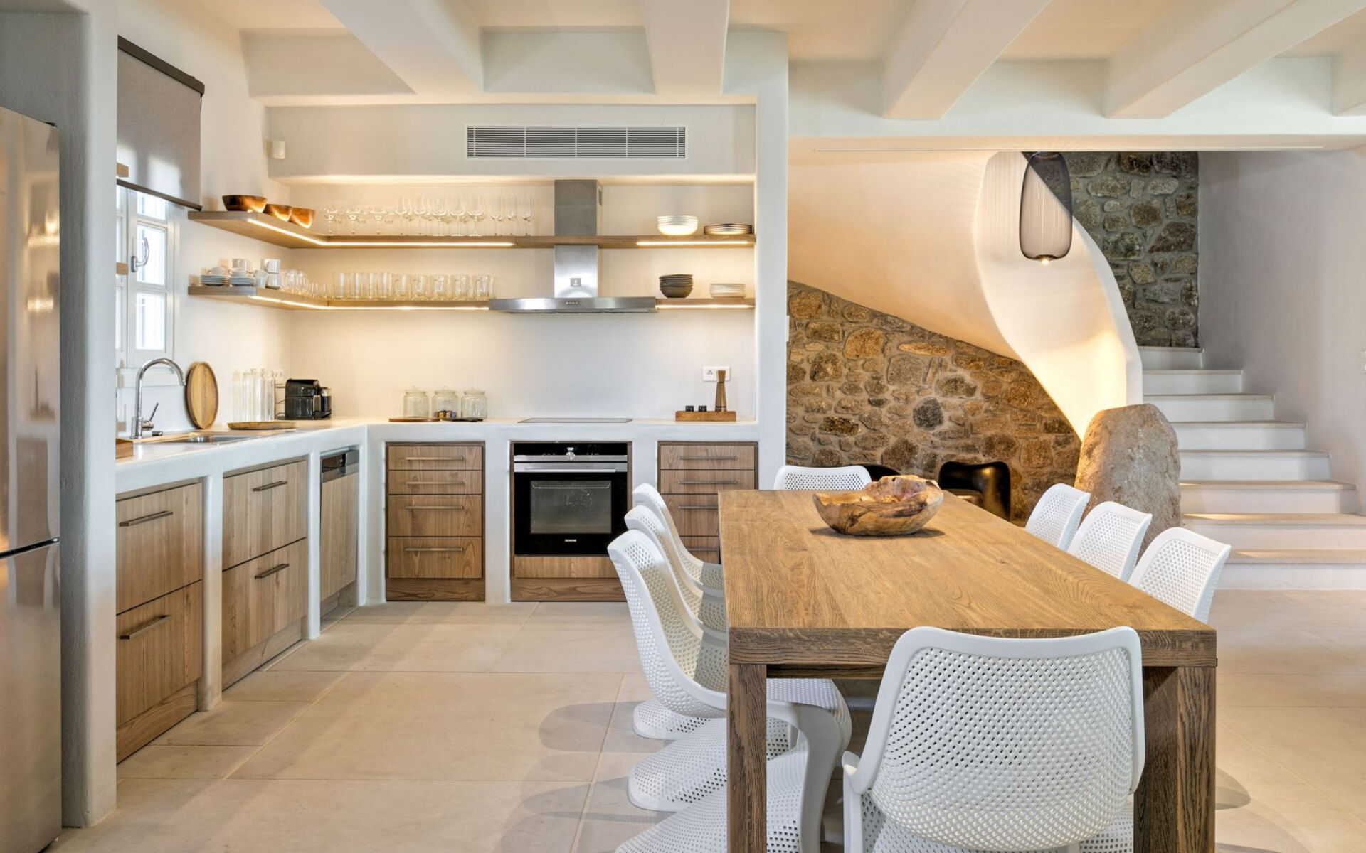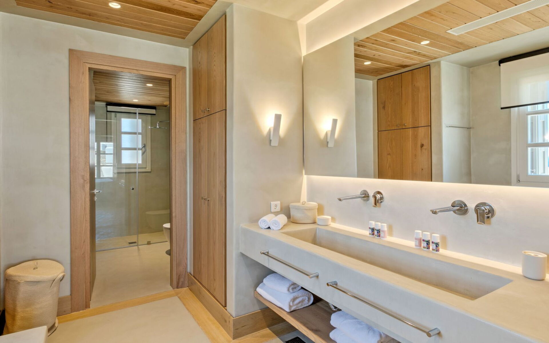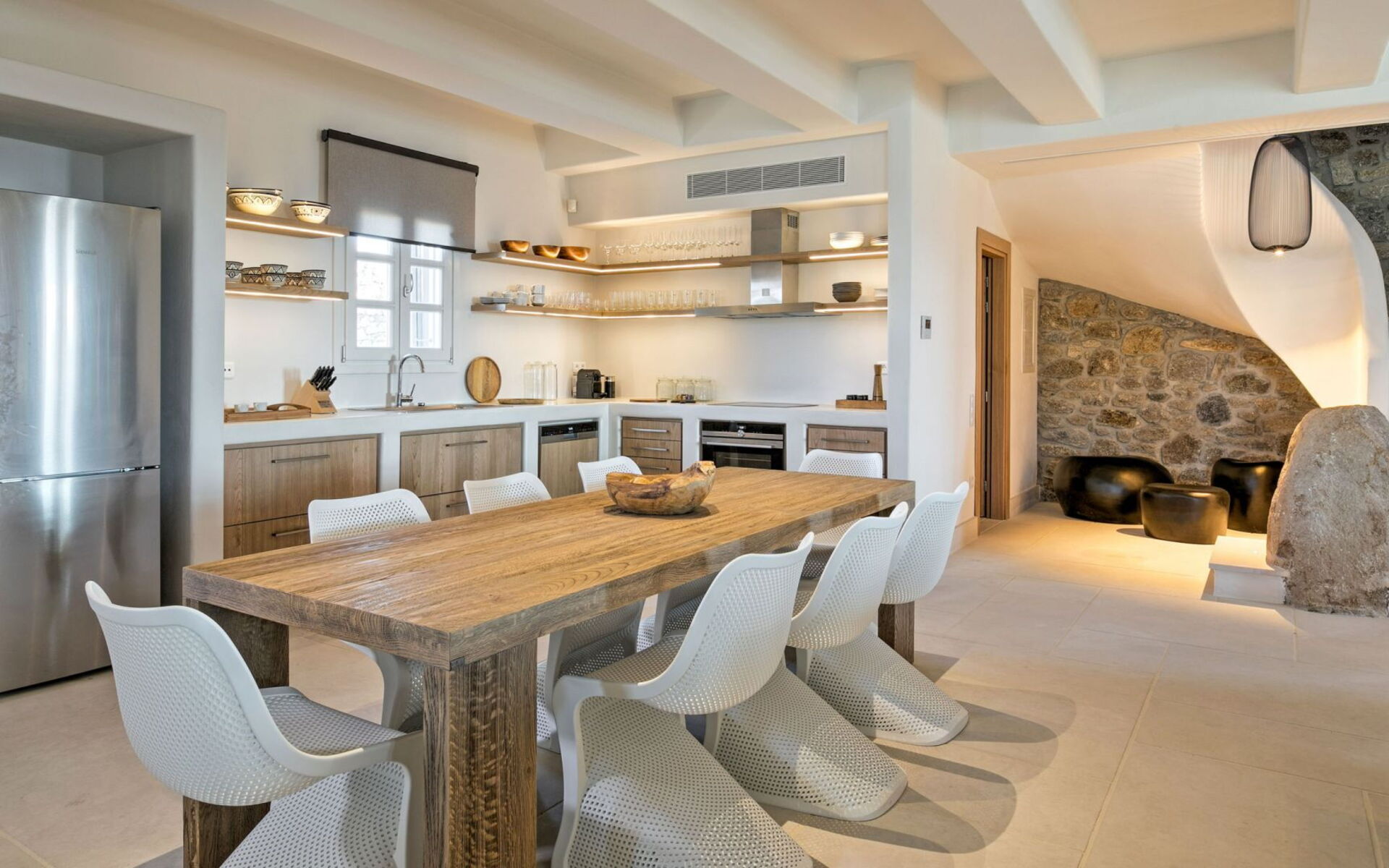 Pergola's strekken zich uit over twee verschillende eettafels, een bar bij het zwembad en een loungehoek bij zonsondergang. Gasten worden echt verwend te midden van al deze elegante buitenvoorzieningen. Houten oppervlakken, etnische patronen en designmeubels onderscheiden het interieur van Delphine, terwijl de architectuur modern Cycladisch op zijn best is.