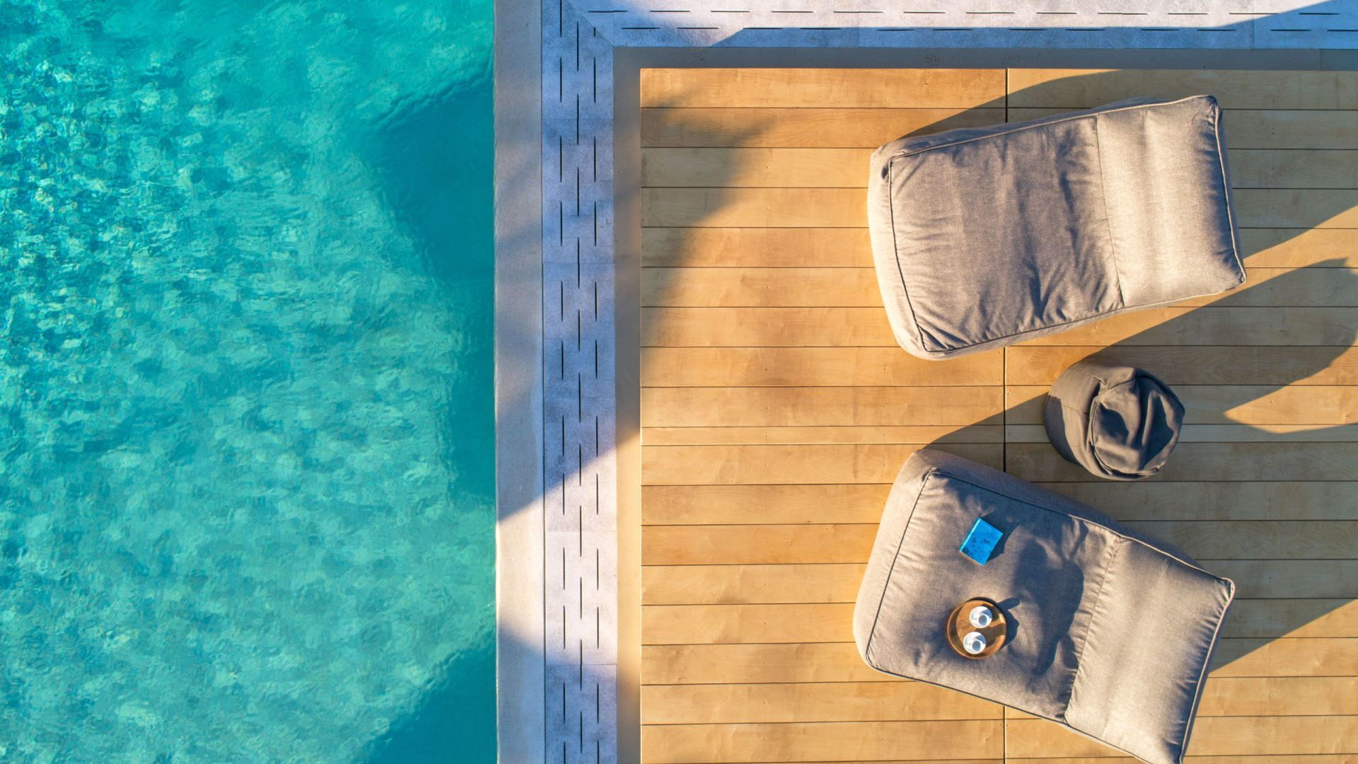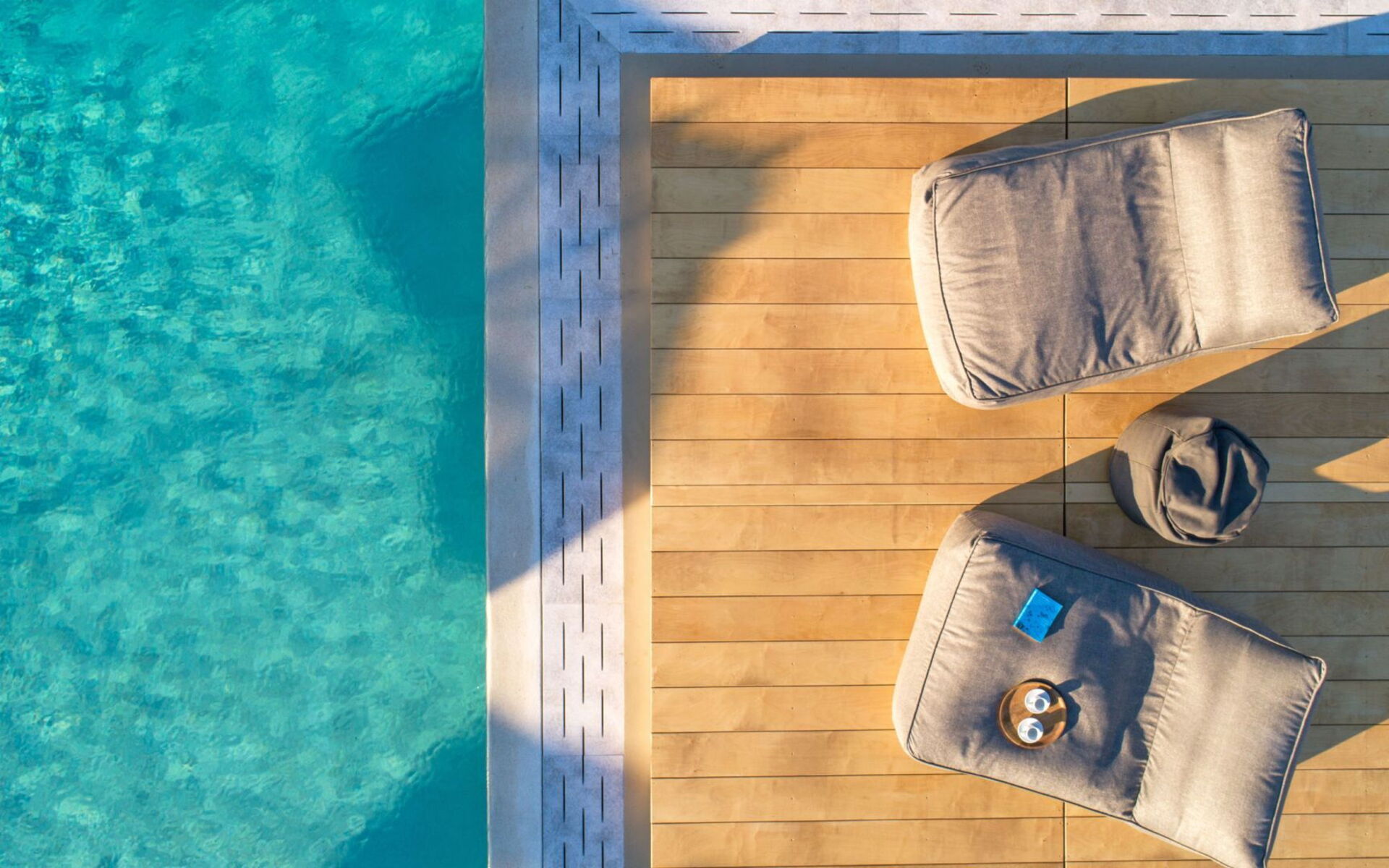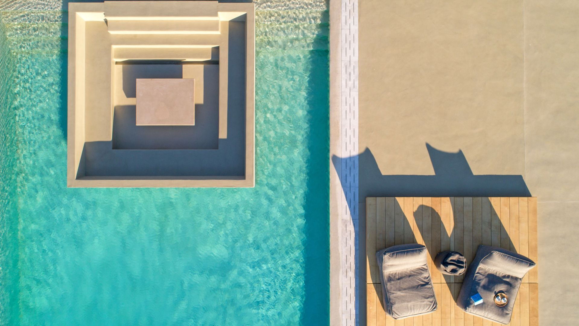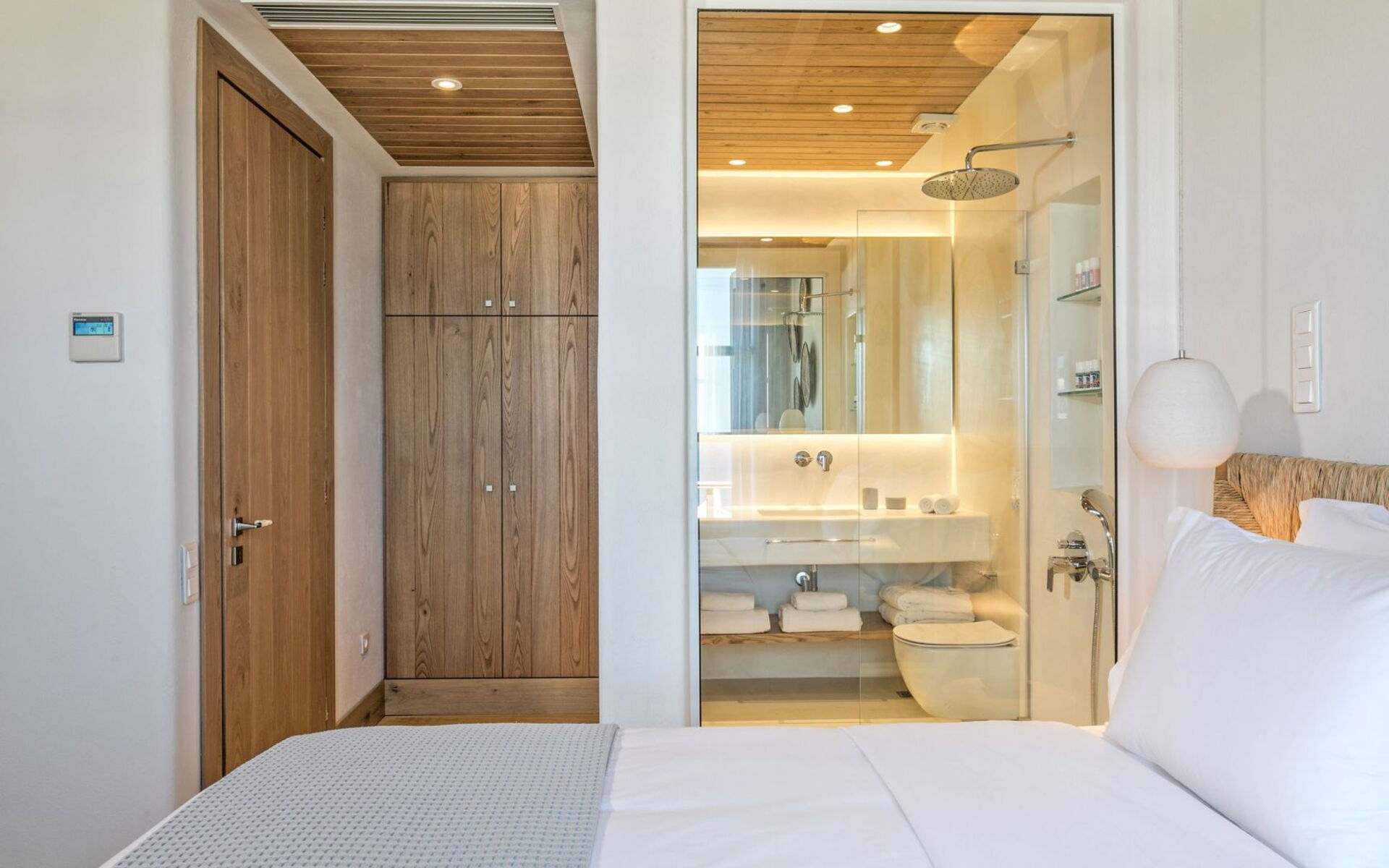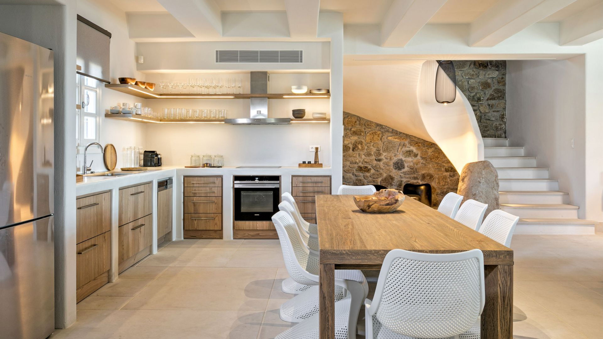 Pergola's strekken zich uit over twee verschillende eettafels, een bar bij het zwembad en een loungehoek bij zonsondergang. Gasten worden echt verwend te midden van al deze elegante buitenvoorzieningen. Houten oppervlakken, etnische patronen en designmeubels onderscheiden het interieur van Delphine, terwijl de architectuur modern Cycladisch op zijn best is.