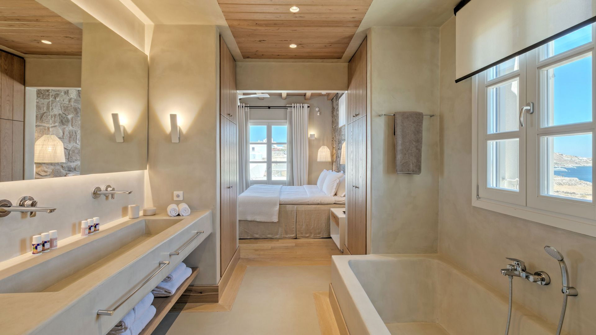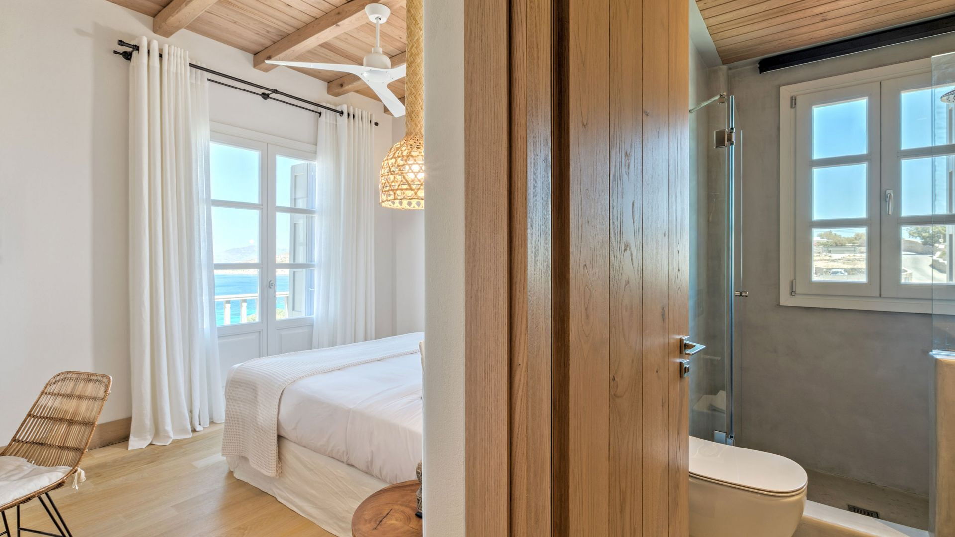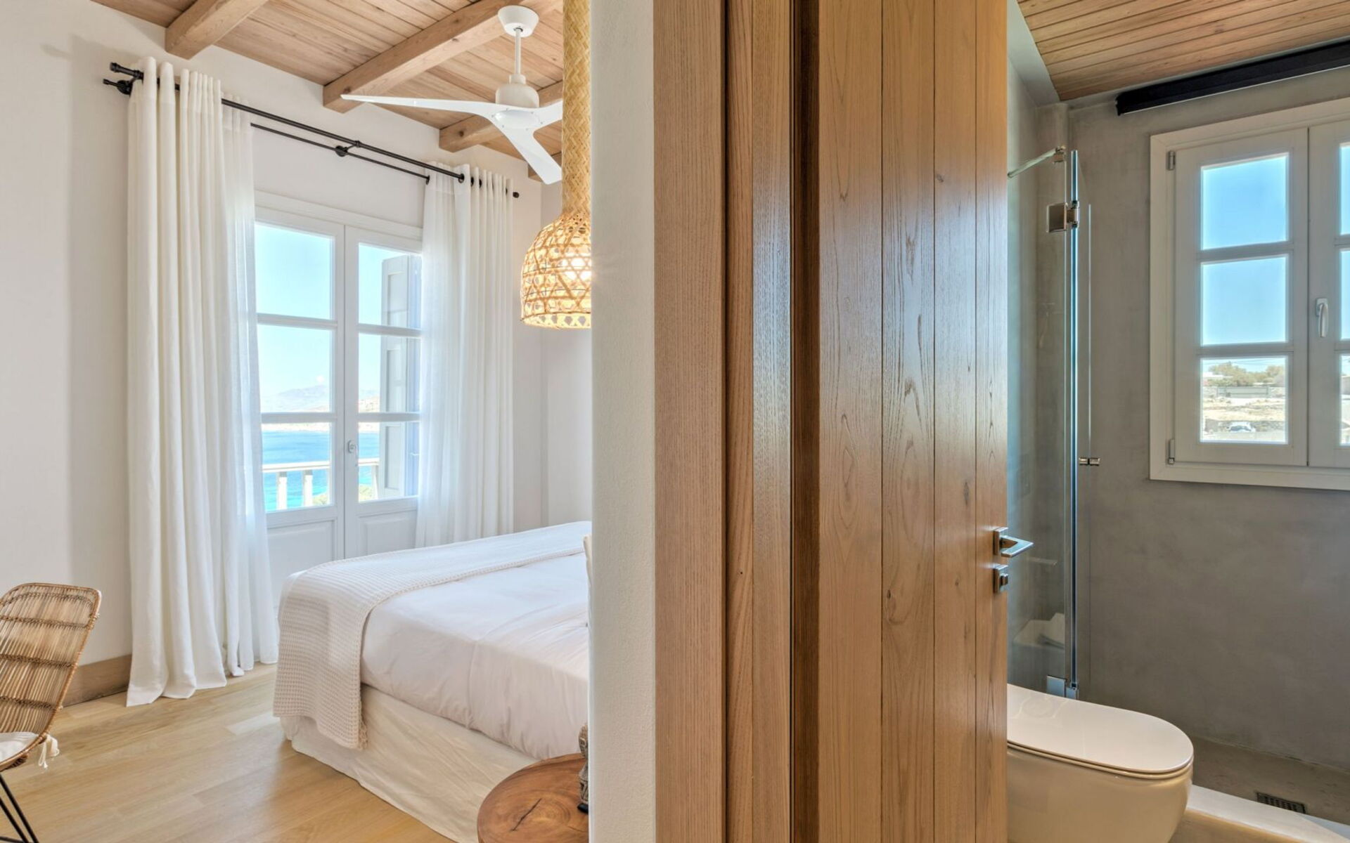 1 Master suite met tweepersoonsbed, airconditioning, en-suite badkamer met bad en douche, toegang tot privébalkon, uitzicht op zee