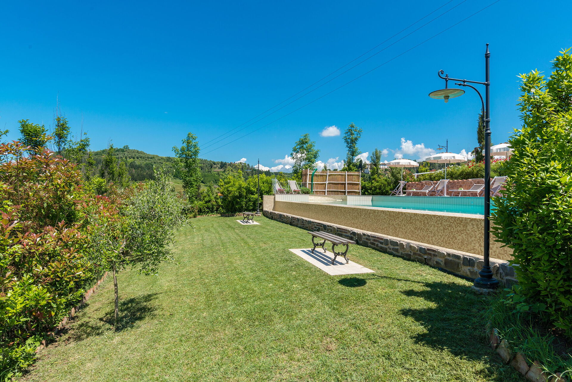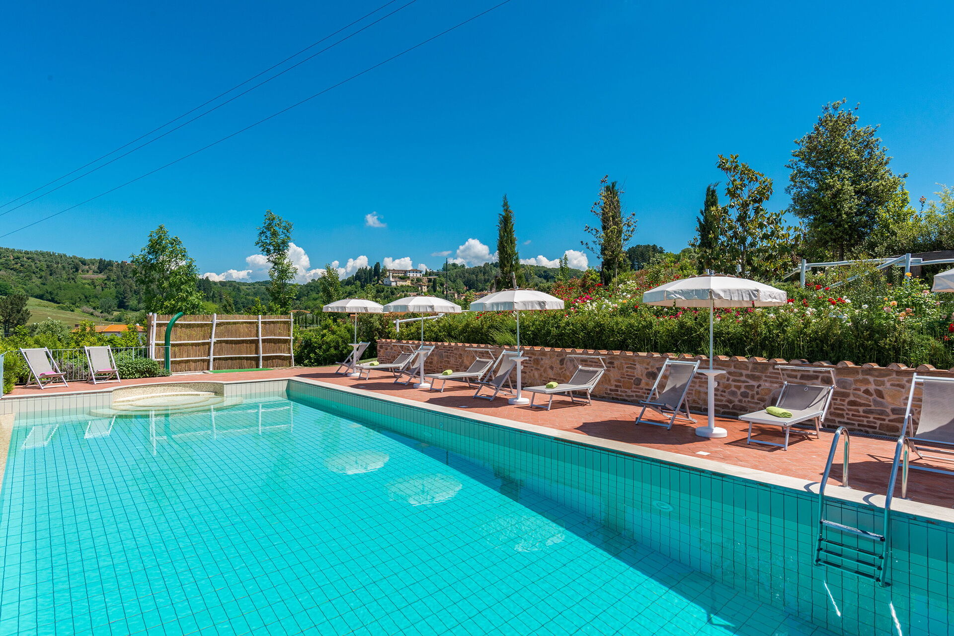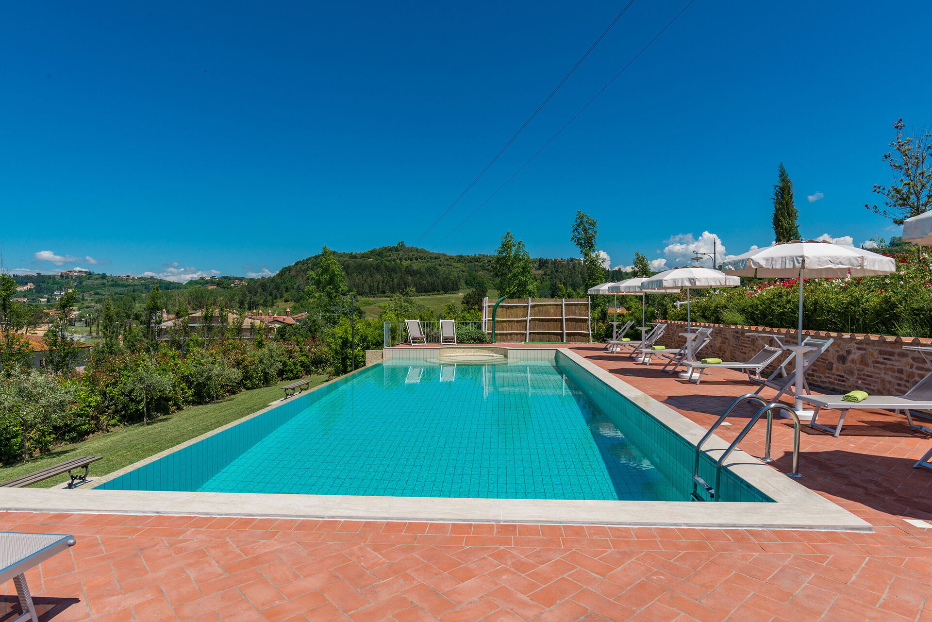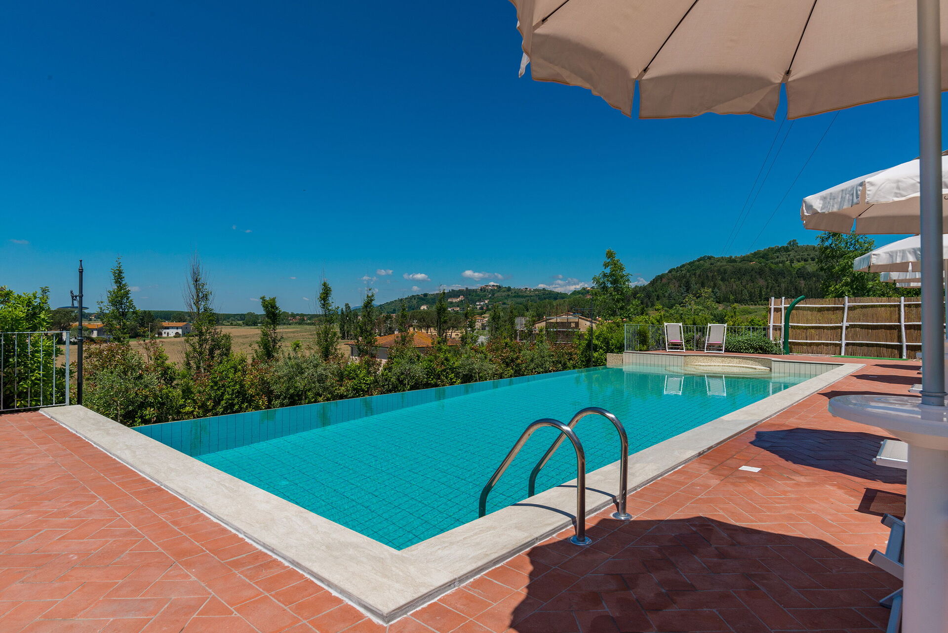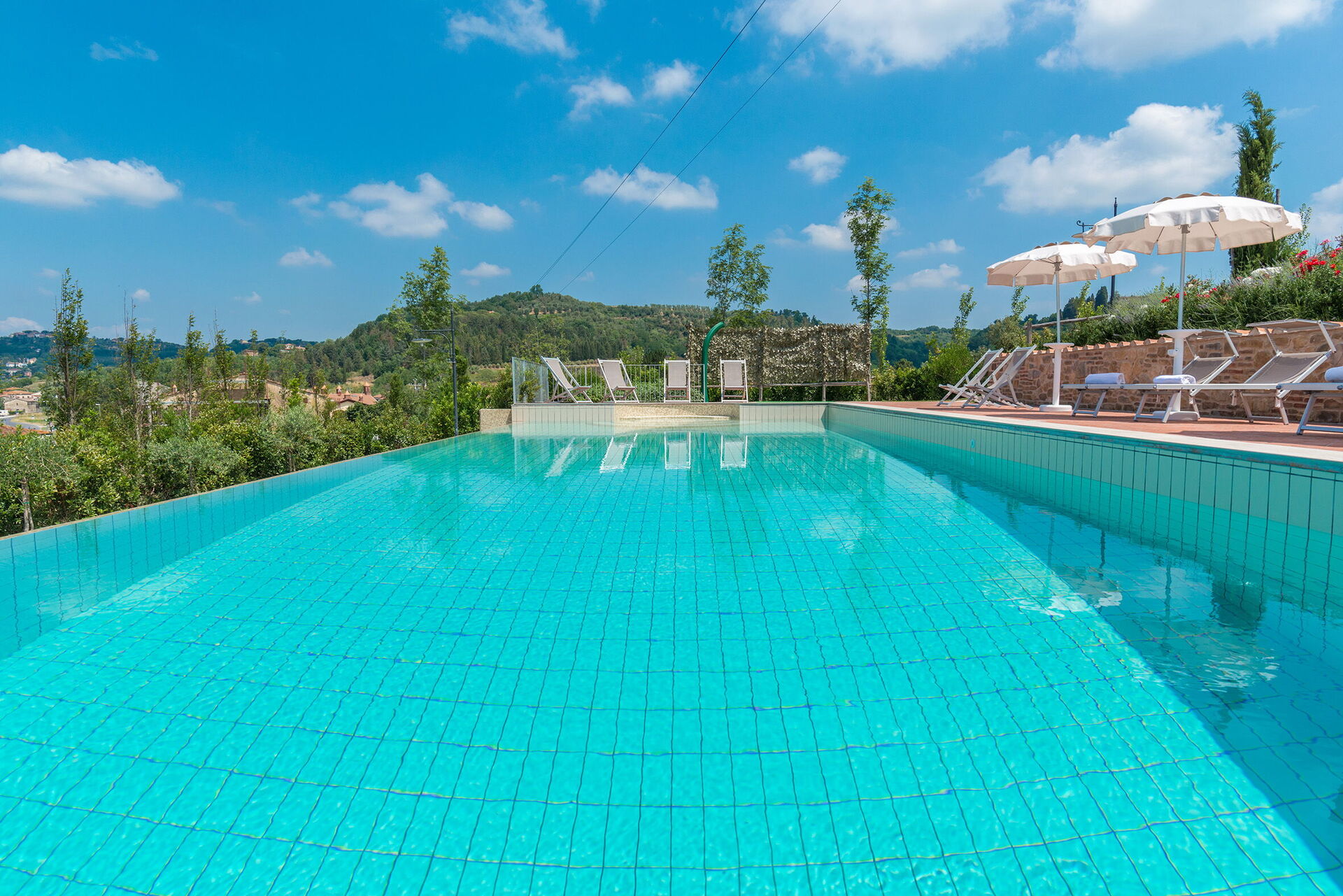 In het midden van het landgoed ligt een spectaculair infinity zwembad, gelegen op een privé panoramische locatie. Hier kun je genieten van de Toscaanse zon, de wijngaarden beneden bewonderen en de geur van lavendel en rozemarijn opsnuiven die de warme bries parfumeert.