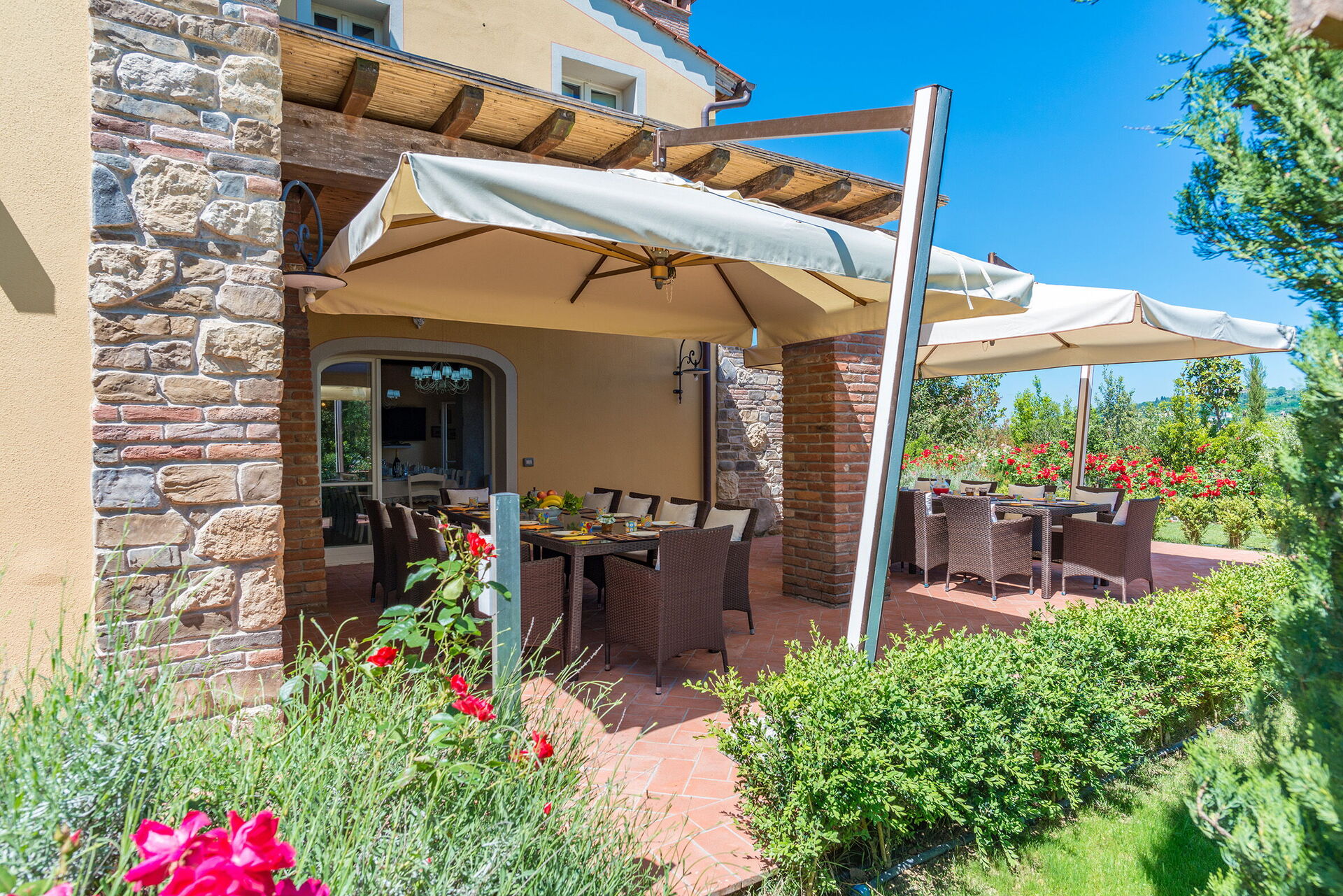 De villa wordt omgeven door twee hectare olijfboomgaarden en een mediterrane tuin vol aromatische kruiden, laurier, cipressen en bloeiende magnolia's. Verschillende terrassen om buiten te eten, een schaduwrijke pergola en een groot infinity zwembad met zout water (6x14 m) met Romeinse traptreden zorgen voor een echt bijzondere buitenbeleving. Gezinnen zullen ook genieten van het prieel, compleet met tafeltennistafel, tafelvoetbal en een kleine speelruimte voor kinderen.