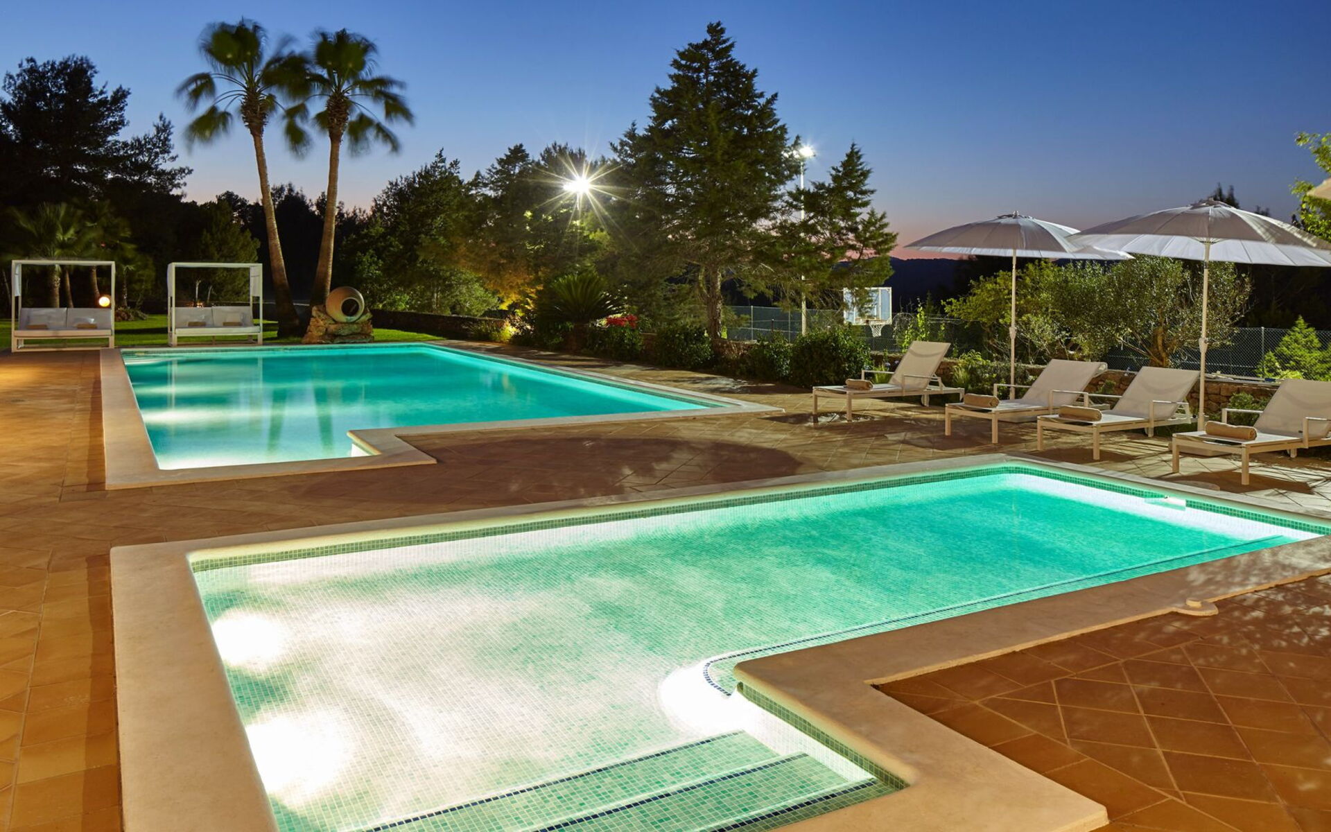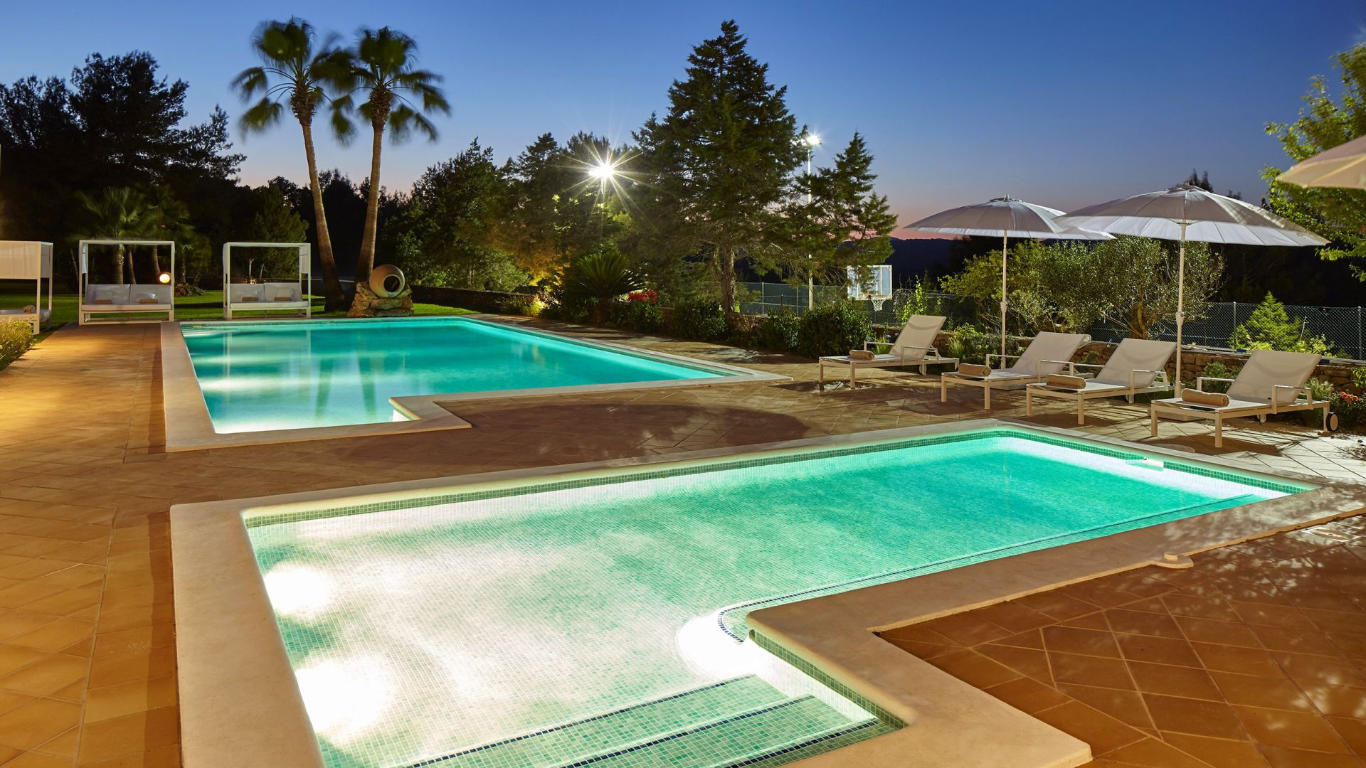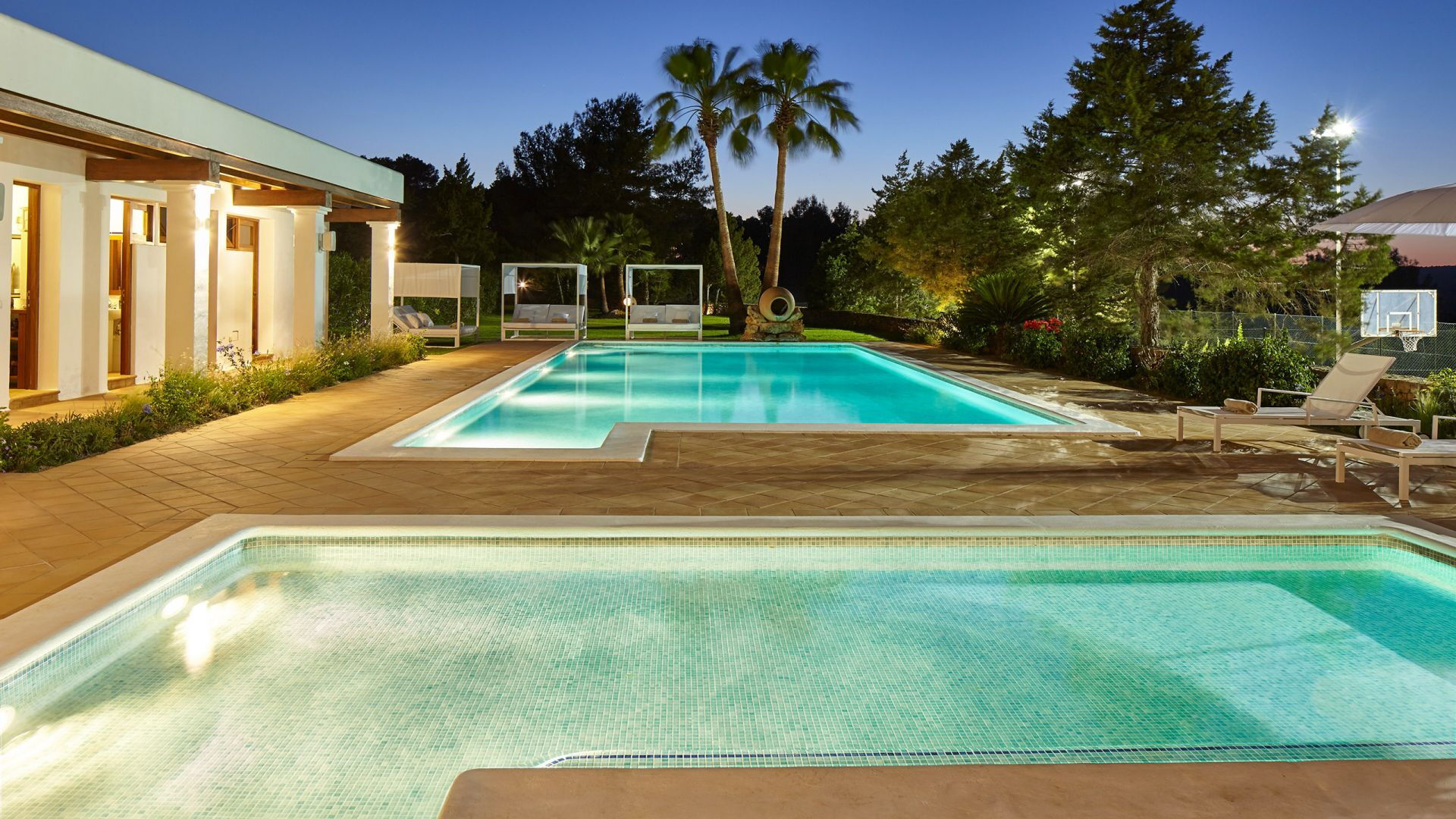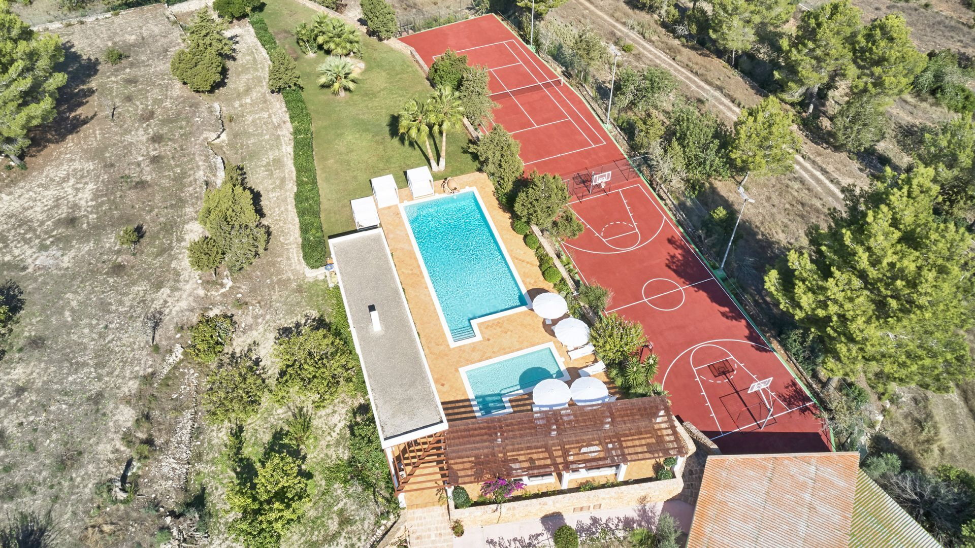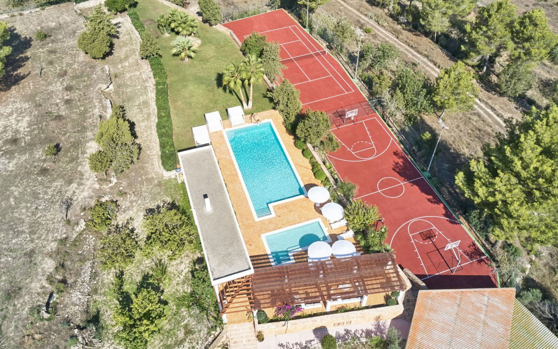 Het belang van ruimte is buiten meteen duidelijk; het landgoed strekt zich uit over ongeveer 150.000 vierkante meter en biedt gasten twee zwembaden, een tennisbaan en een basketbalveld - een echte zeldzaamheid, zelfs als je kijkt naar de meest prestigieuze villa's van het eiland. Dit gebied gewijd aan entertainment en ontspanning voor gasten is goed ontworpen en bevat ook een pergola om aangenaam te dineren, allemaal op gepaste afstand van het hoofdgebouw voor wie op zoek is naar privacy.