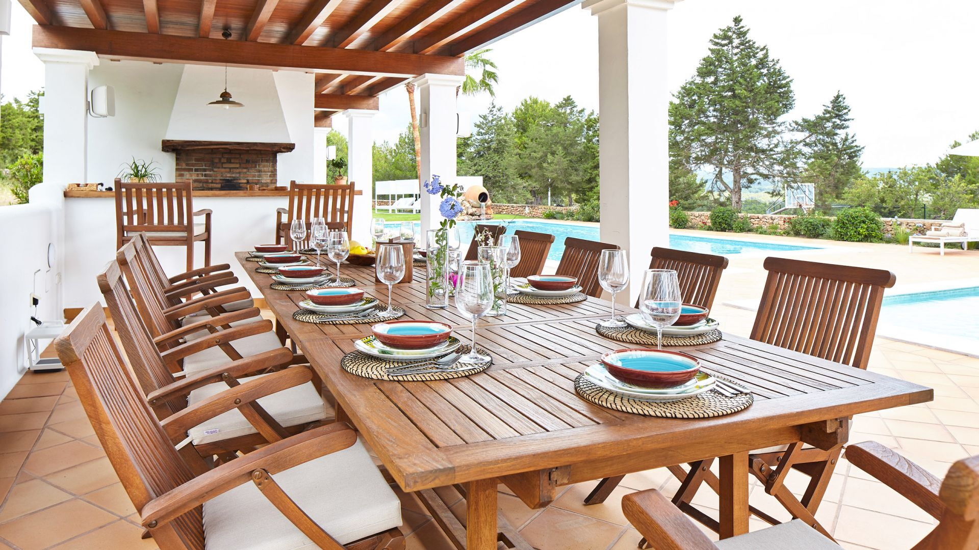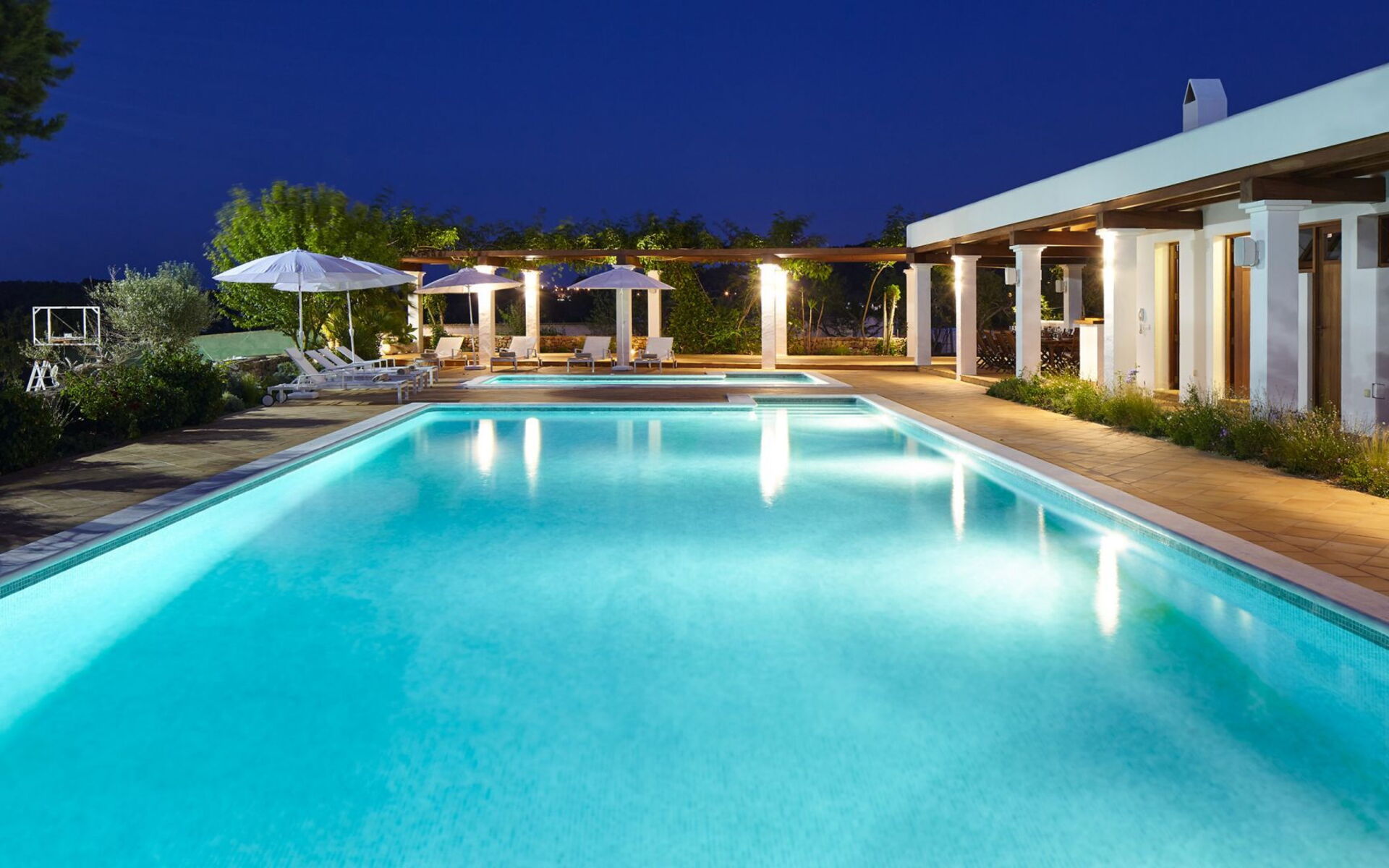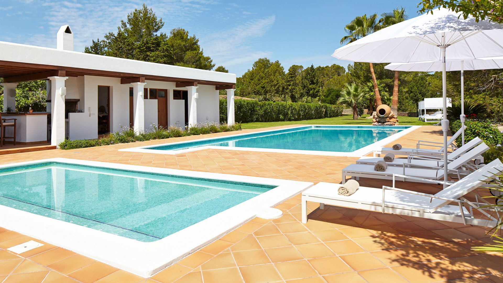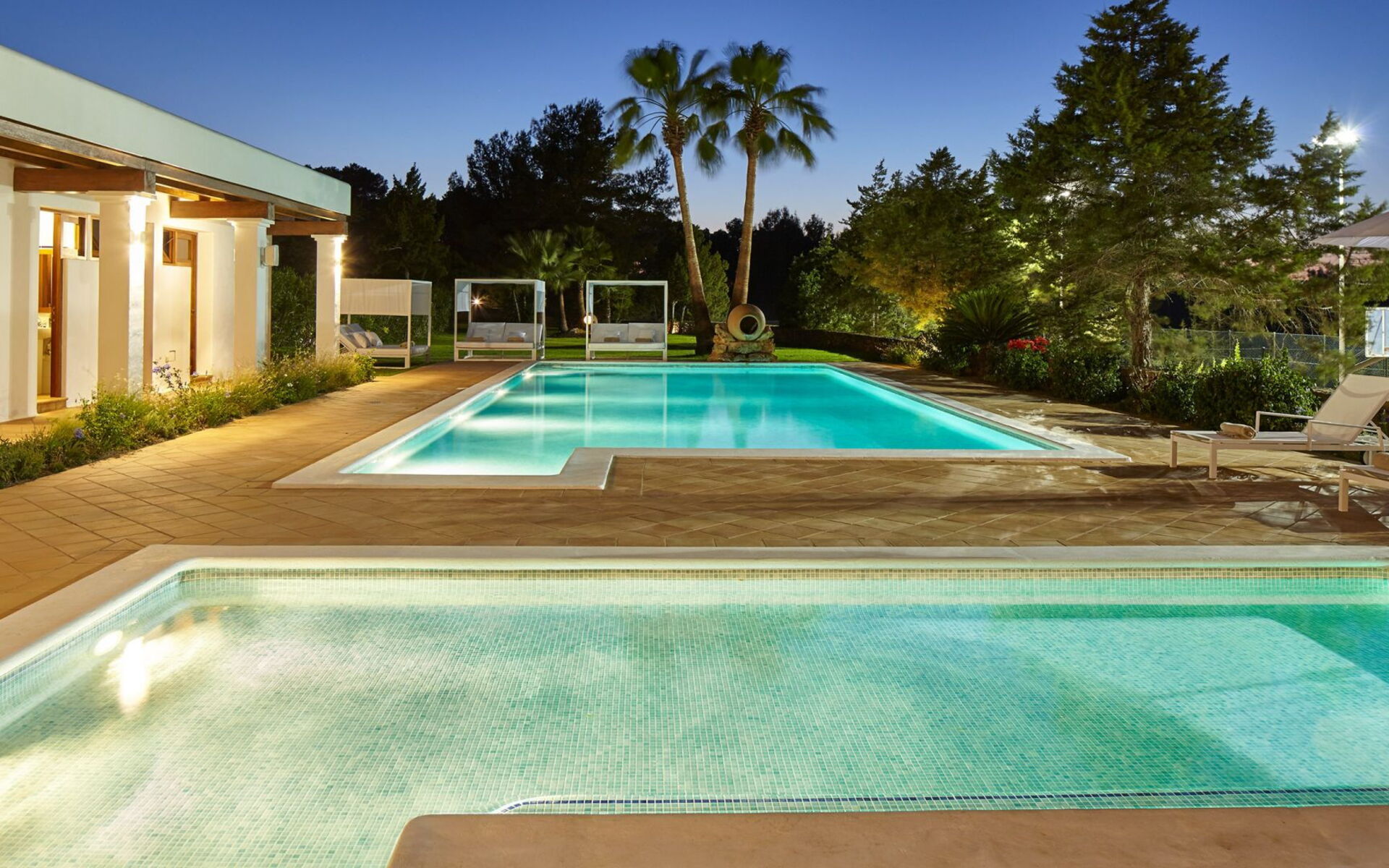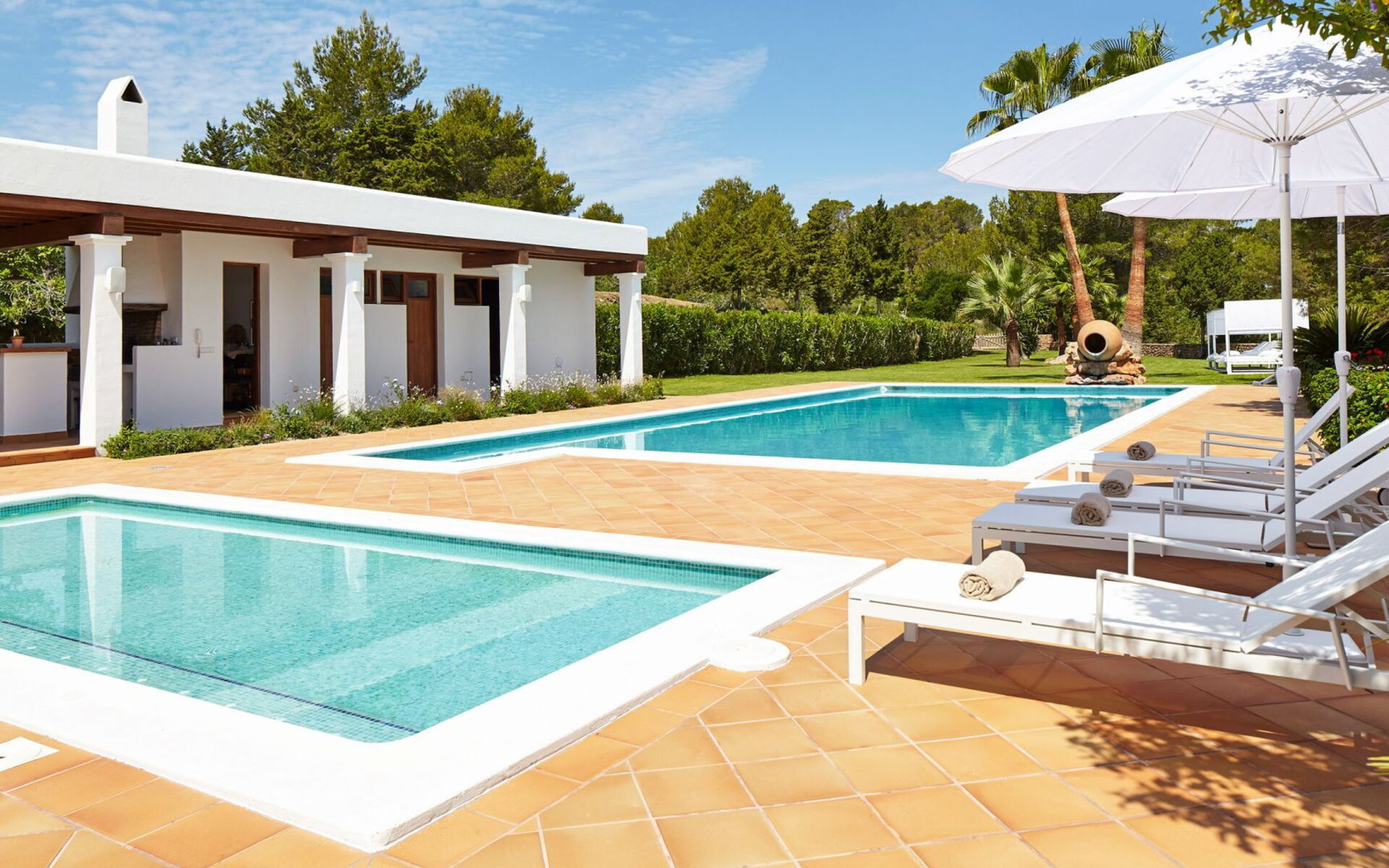Het belang van ruimte is buiten meteen duidelijk; het landgoed strekt zich uit over ongeveer 150.000 vierkante meter en biedt gasten twee zwembaden, een tennisbaan en een basketbalveld - een echte zeldzaamheid, zelfs als je kijkt naar de meest prestigieuze villa's van het eiland. Dit gebied gewijd aan entertainment en ontspanning voor gasten is goed ontworpen en bevat ook een pergola om aangenaam te dineren, allemaal op gepaste afstand van het hoofdgebouw voor wie op zoek is naar privacy.