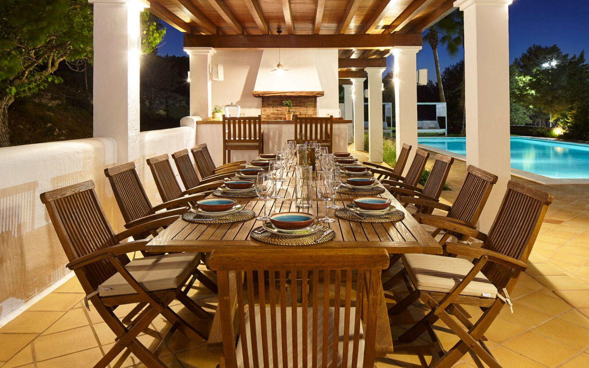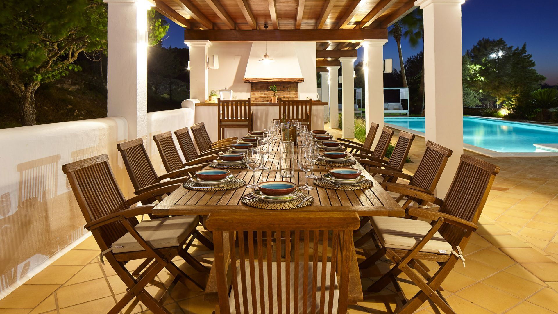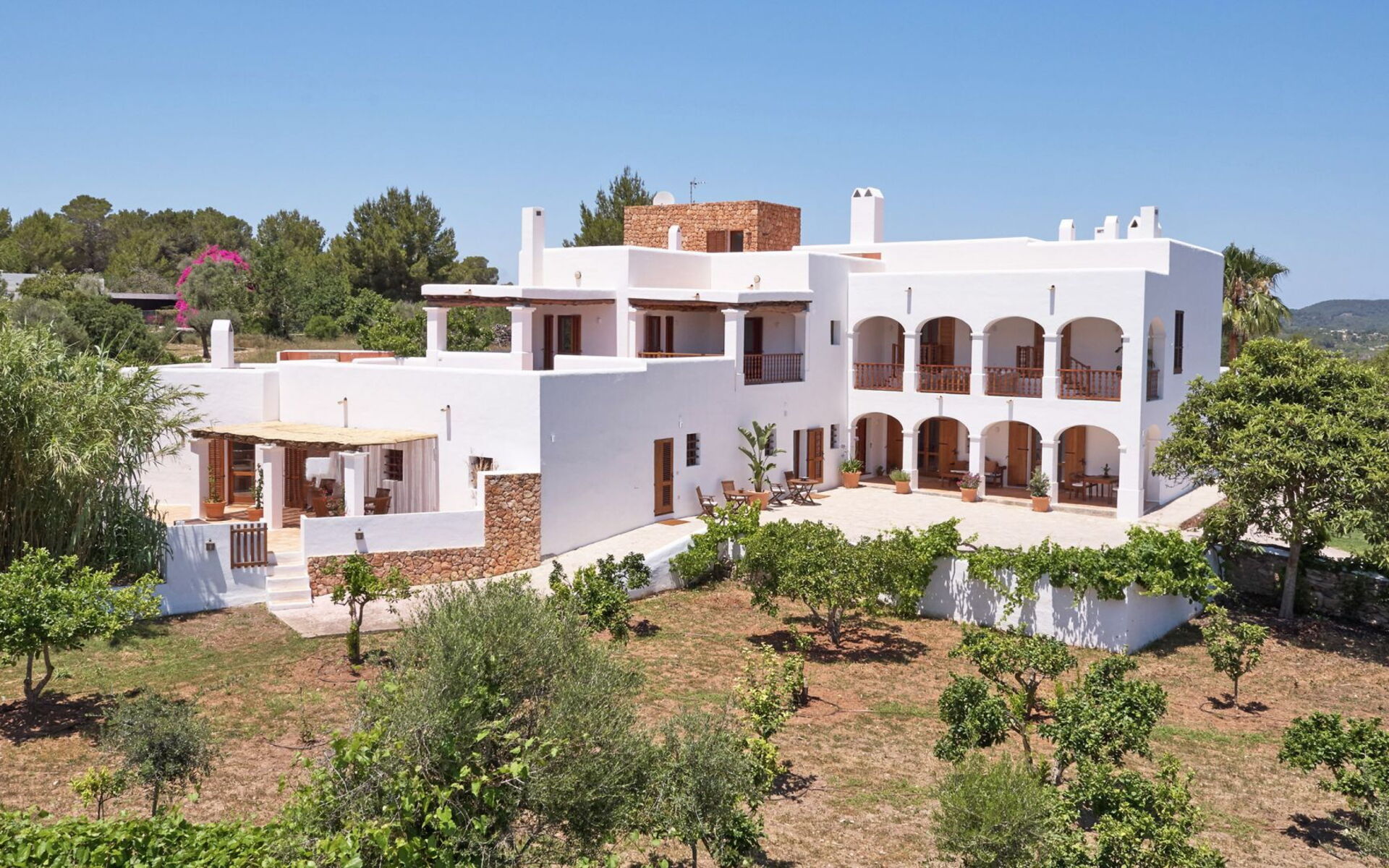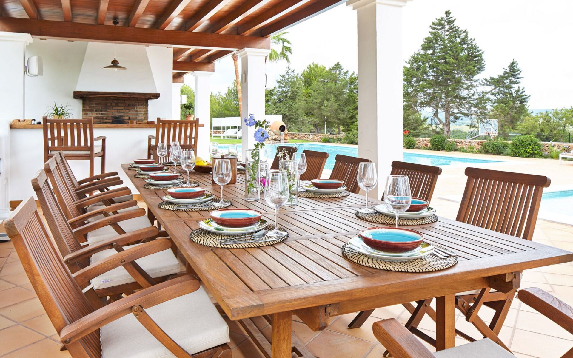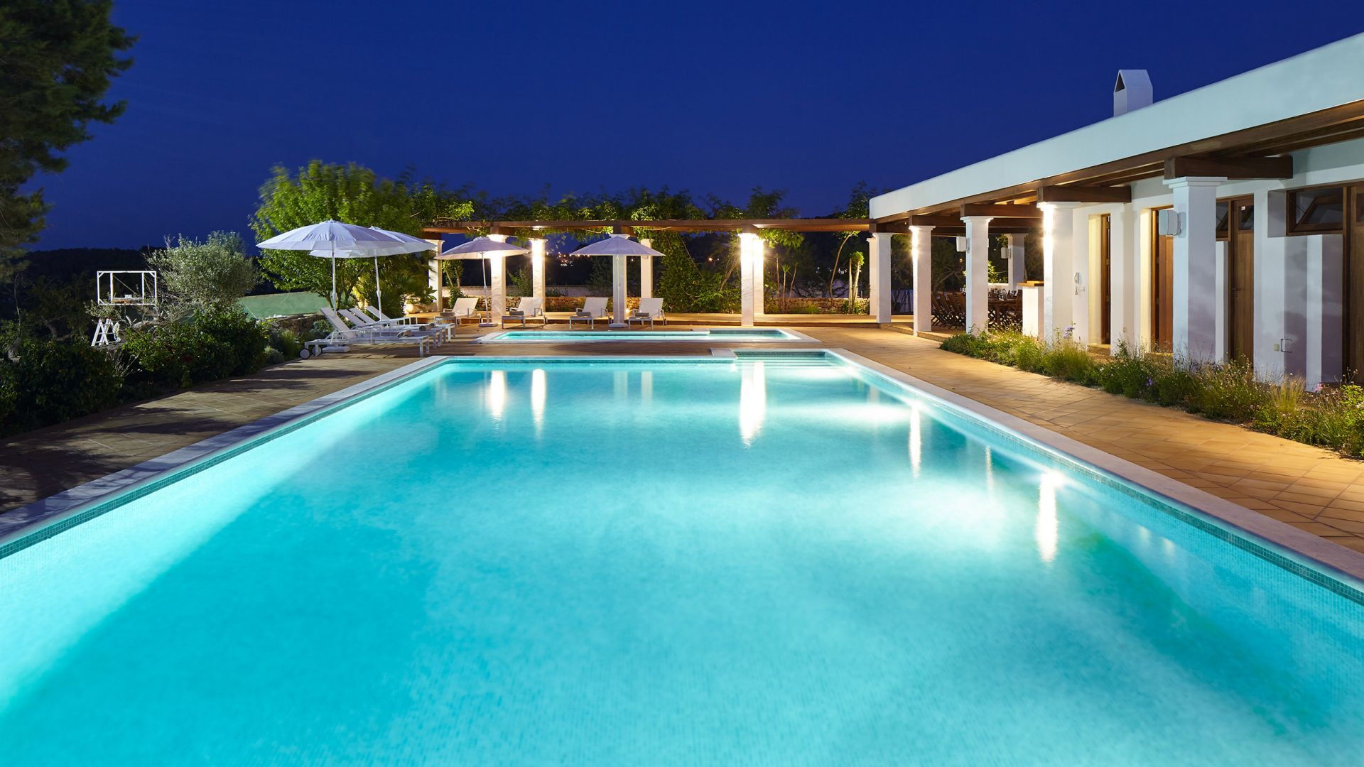 Het belang van ruimte is buiten meteen duidelijk; het landgoed strekt zich uit over ongeveer 150.000 vierkante meter en biedt gasten twee zwembaden, een tennisbaan en een basketbalveld - een echte zeldzaamheid, zelfs als je kijkt naar de meest prestigieuze villa's van het eiland. Dit gebied gewijd aan entertainment en ontspanning voor gasten is goed ontworpen en bevat ook een pergola om aangenaam te dineren, allemaal op gepaste afstand van het hoofdgebouw voor wie op zoek is naar privacy.