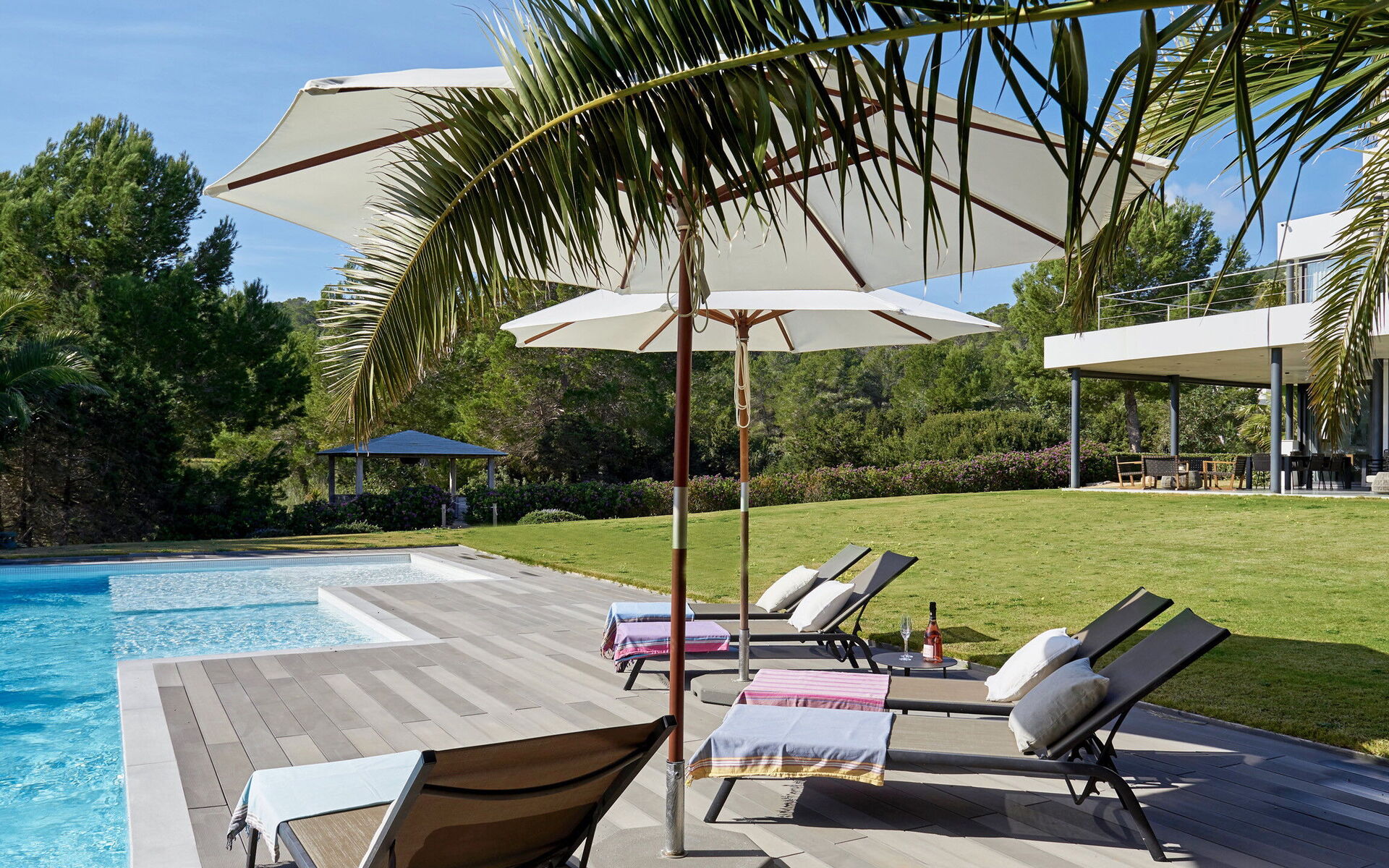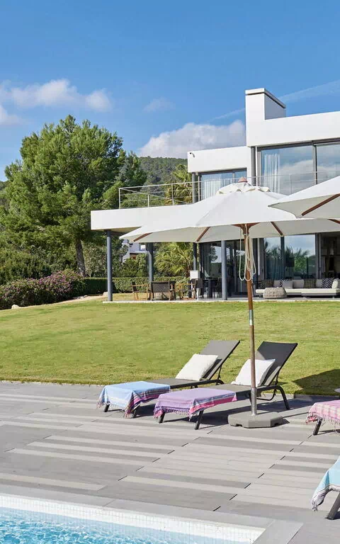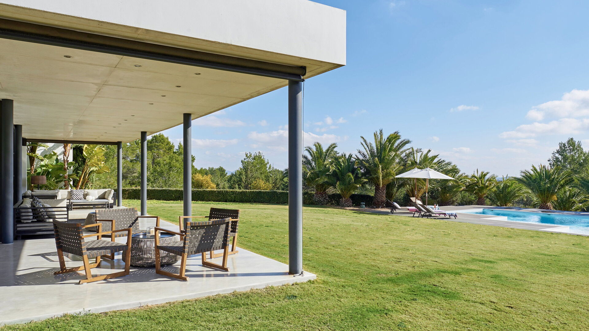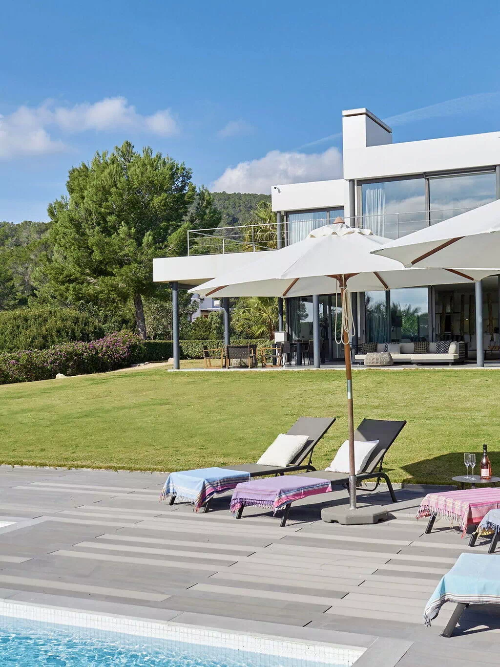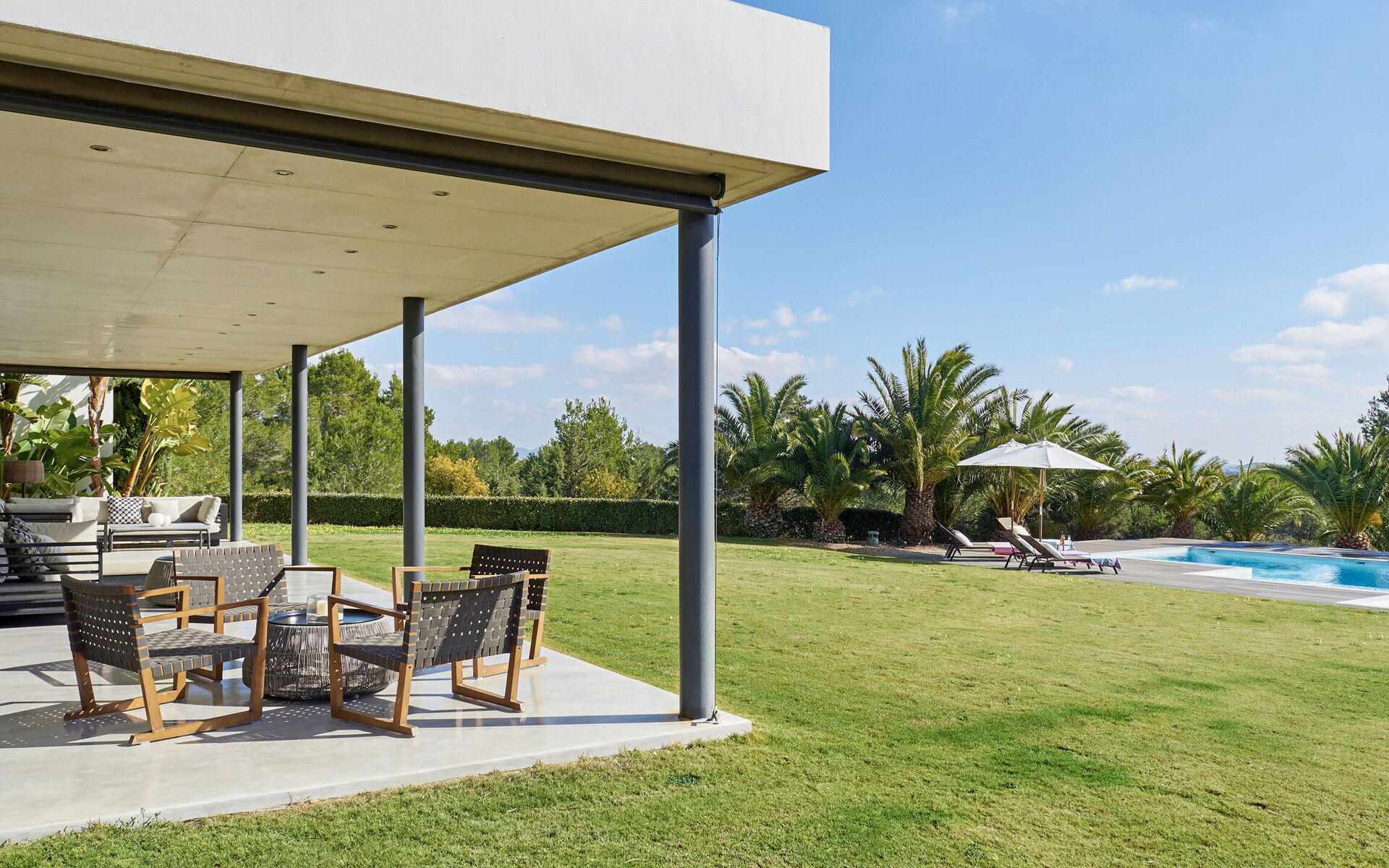 Buiten ligt het aantrekkelijke zwembad te midden van een prachtig groen grasveld, ideaal voor kinderen om ongestoord en veilig te spelen en rond te rennen. In de schaduw van de portiek van het huis in eigentijdse stijl is er een eethoek en een perfect ingerichte lounge waar gasten kunnen ontspannen. De stijl is elegant en minimalistisch, met veel aandacht voor de kwaliteit van het meubilair.