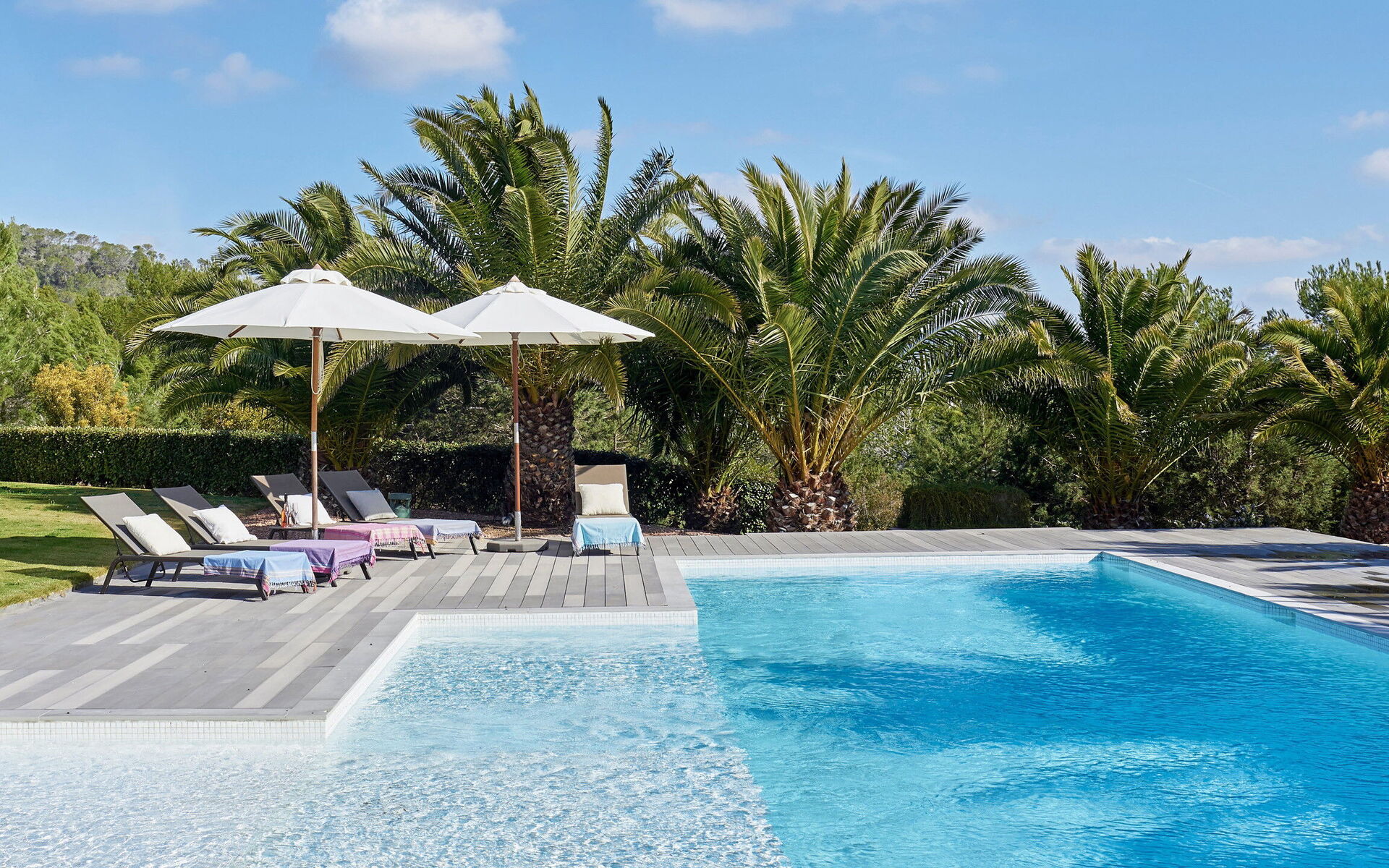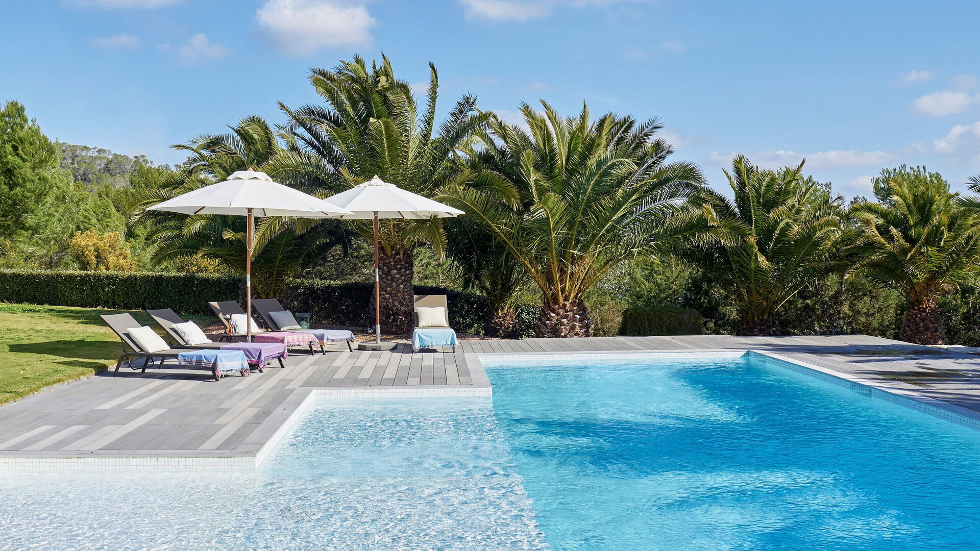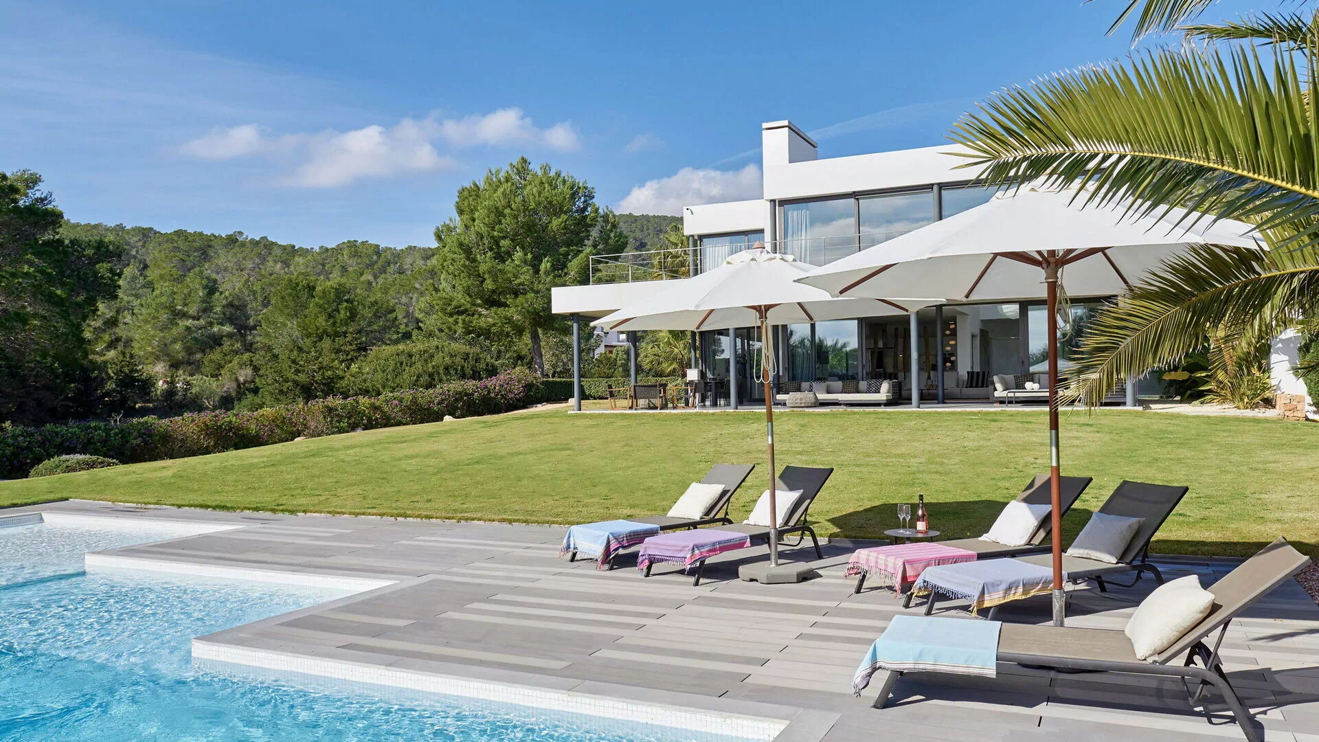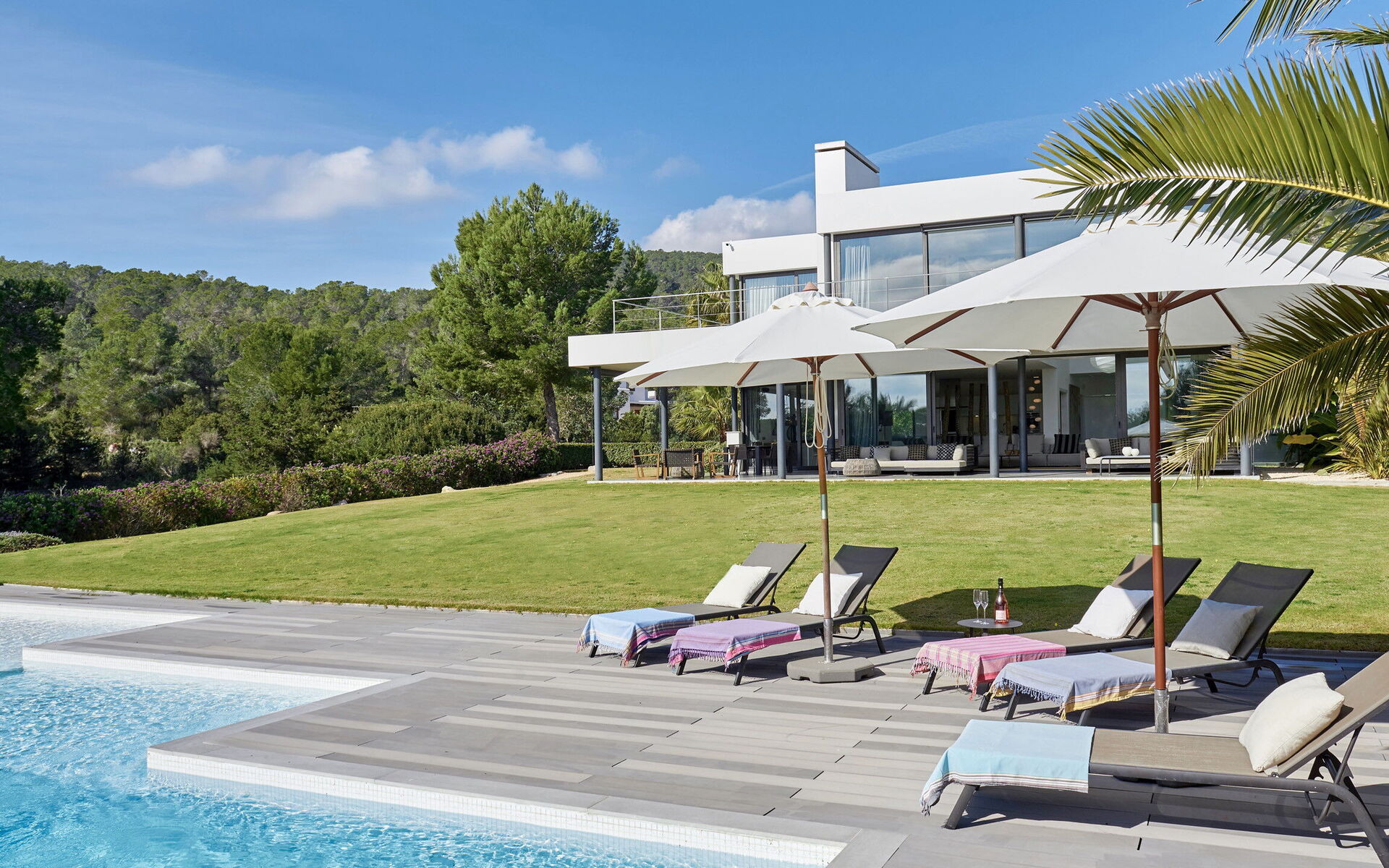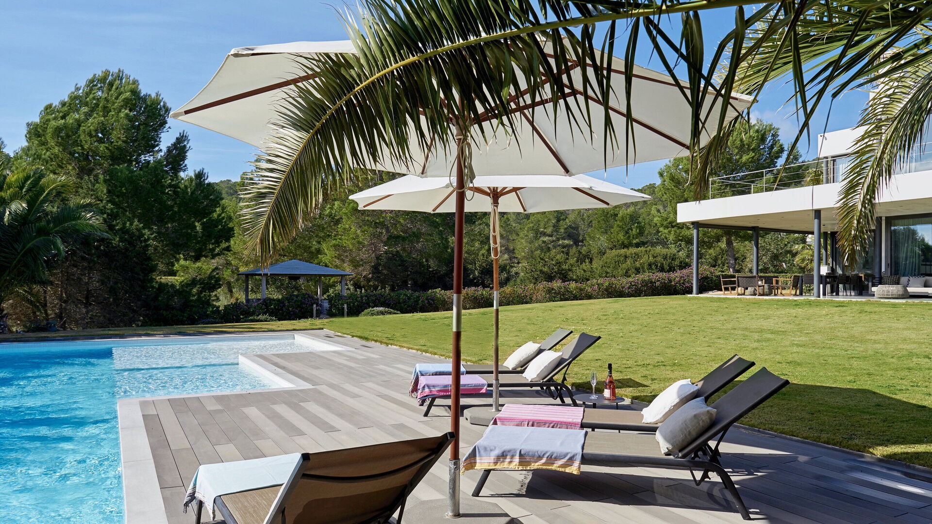 Buiten ligt het aantrekkelijke zwembad te midden van een prachtig groen grasveld, ideaal voor kinderen om ongestoord en veilig te spelen en rond te rennen. In de schaduw van de portiek van het huis in eigentijdse stijl is er een eethoek en een perfect ingerichte lounge waar gasten kunnen ontspannen. De stijl is elegant en minimalistisch, met veel aandacht voor de kwaliteit van het meubilair.